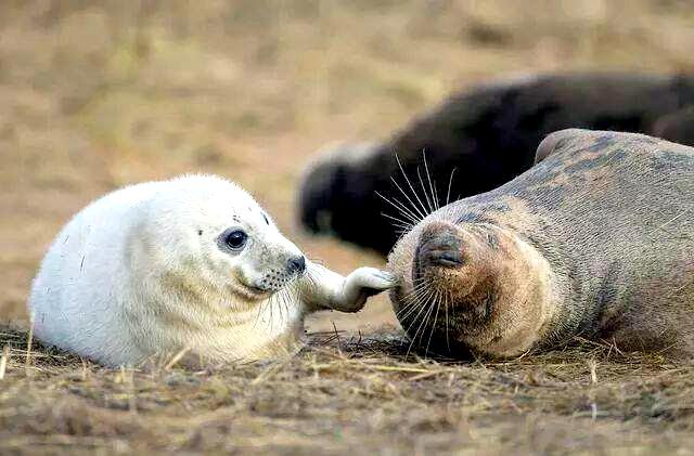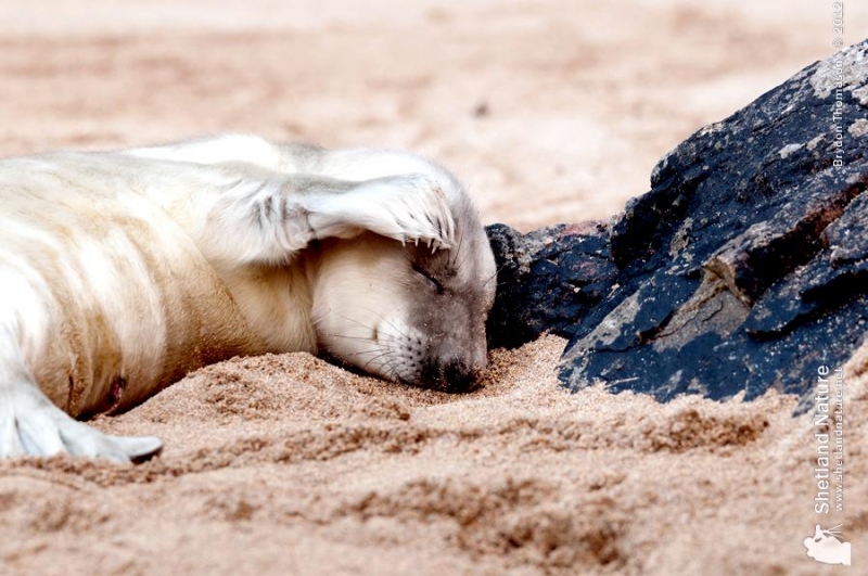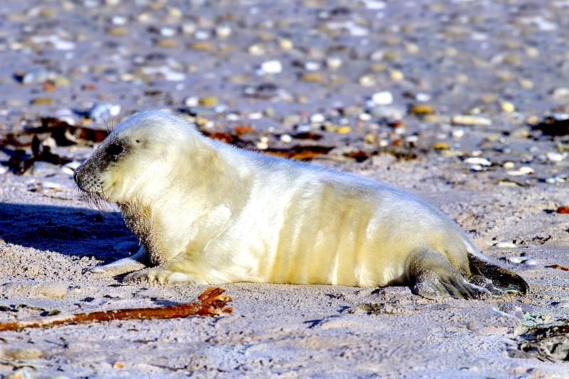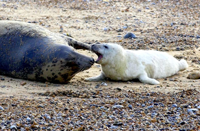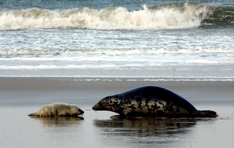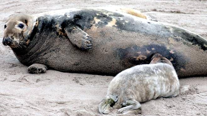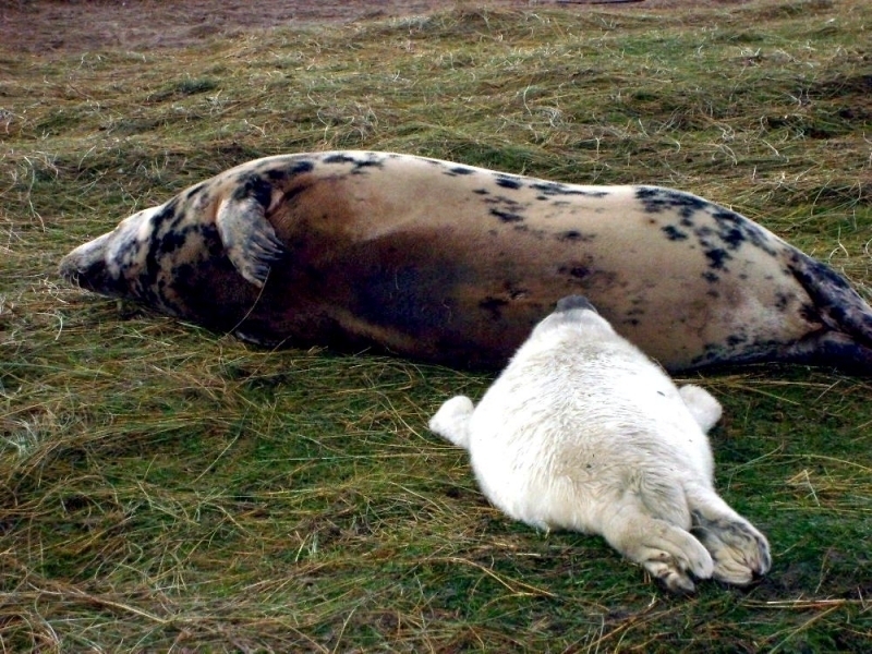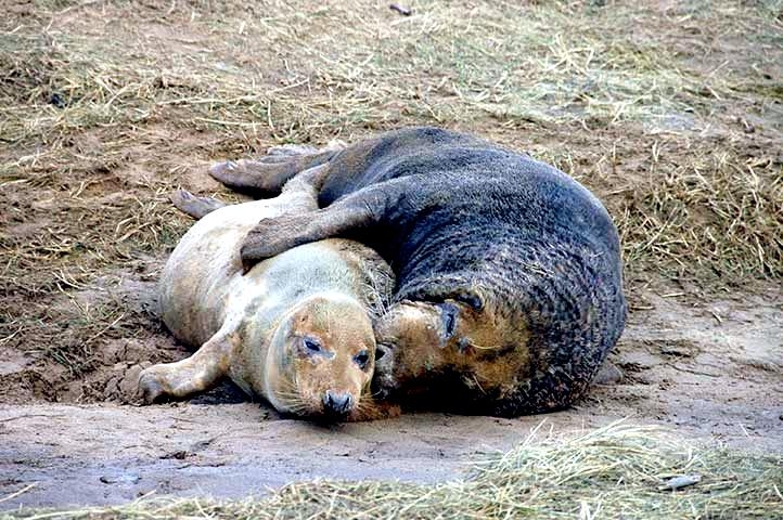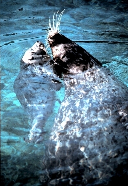 Females reach sexual maturity at 3-5 years, males at 4-6 years, although males may not attain territorial status until 8-10 years of age. Females usually give birth at the rookery about a day after coming ashore at the rookery, nursing for about 17-18 days during which time pups gain between 1.2-2 kilograms each day. Newborn pups measure about 90-105 cm in length and weigh between 10-18 kilograms. Pups are generally at the upper end of this range in the western Atlantic. Towards the end of the nursing period, the mother mates with one or more males. During this time her pup is weaned and left to fend for itself. Pups remain at the rookery until molting, living off blubber reserves. Prior to molting, the coat of Grey Seal pups is creamy-white in color and woolly in texture. A shorter coat is revealed when this coat is molted 2-4 weeks after pups are born. After molting, pups begin feeding at sea, usually about 1-4 weeks after weaning. Pups disperse in many different directions from the rookery and are frequently found over 1,000 km away. The mortality rate for pups in their first year can be as high as 30-55%; larger mortality rates tend to occur during the nursing period where rookeries are crowded or located on wave-swept beaches. Mating takes place on land on ice or in the water. Male Grey Seals enter the rookeries when the females start to pup trying to gain sole access to a group of about 2-10 females. Successful males will mate with 2-20 females however in areas such as sand or ice where the females are more spread out, males will often mate with only 1 female. Recent evidence revealed that females often have a greater degree of choice in partners than the males. Lactating female Grey Seals do not feed during the breeding season for about 3 weeks and dominant males do not feed for up to 6 weeks. After mating, the males and females return to pelagic waters to feed.