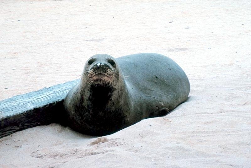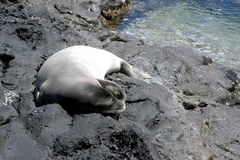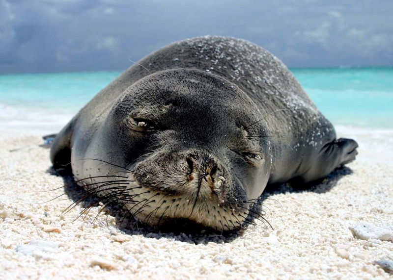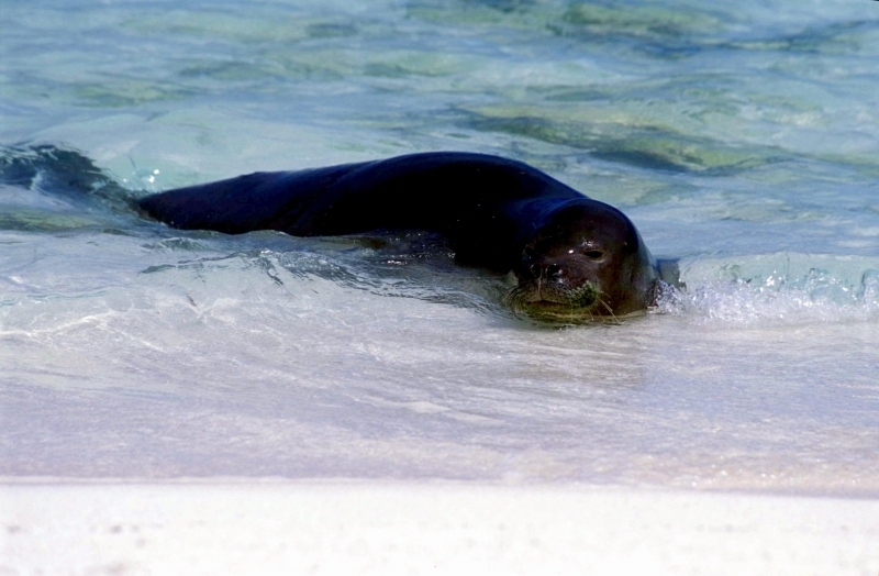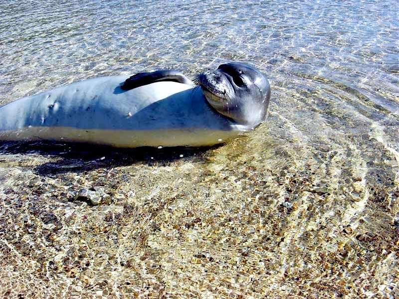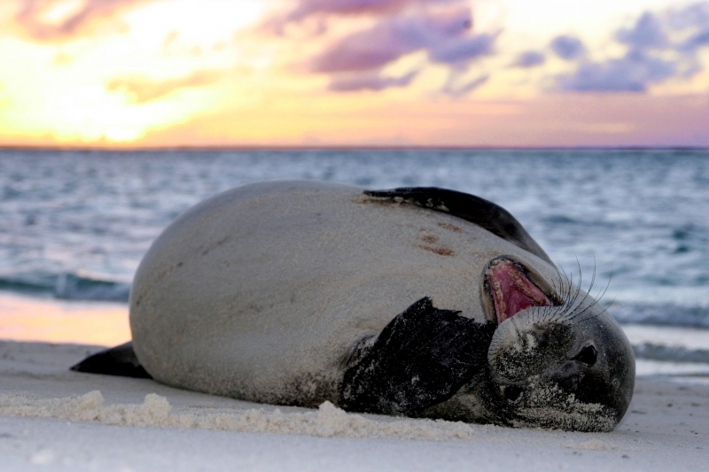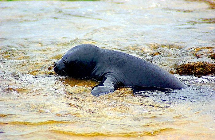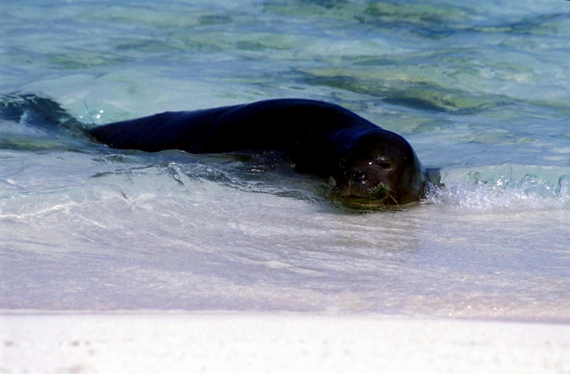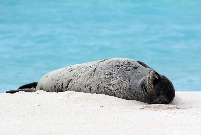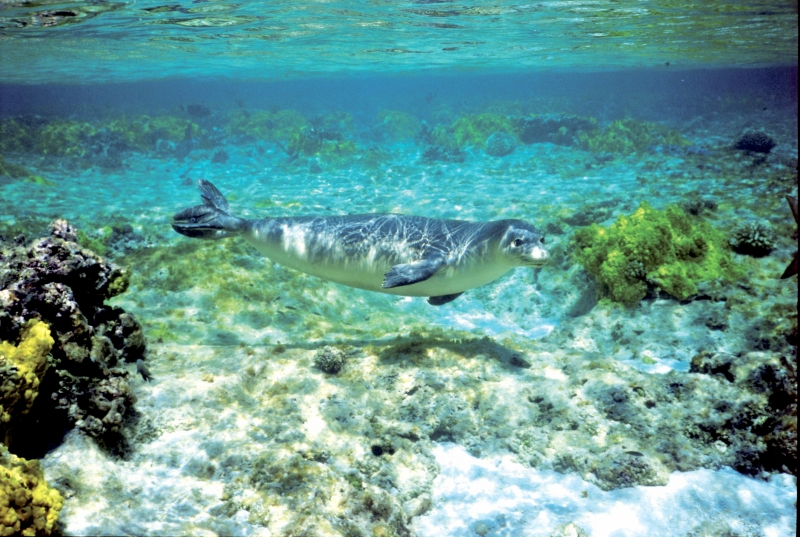 In Hawaii, Hawaiian Monk Seals are called “Ilio holo I ka uaua” which means “the Dog that goes in Rough Water”. Their common name is from the excess folds of skin around the seal’s neck causing them to look like they’re wearing a monk’s robe and for the fact that this is a solitary species usually found alone or in very small groups. Adults reach an average 2 meters in length of and weigh between 180-270 kilograms. Unlike many other seal species, female Hawaiian Monk Seals are usually slightly larger than the males. Adult coats are light gray to brown in color with lighter coloring on the chest. The maximum age for this species is 25 to 30 years, however few seals live that long. Hawaiian Monk Seals are the second most endangered pinniped species in the world after the very rare Mediterranean Monk Seal. Only 1,300 to 1,400 Hawaiian Monk Seals still inhabit the northwestern Hawaiian Islands. The largest population is found at French Frigate Shoals, others haul-out on Laysan Island, Lisianski Island, Pearl and Hermes Reef, Midway Atoll and Kure Atoll. There are additional small colonies at Necker Island and Nihoa Island and a small number of seals can be found on the main Hawaiian Islands. Hawaiian Monk Seals do not migrate and there is limited movement of individuals between colonies.