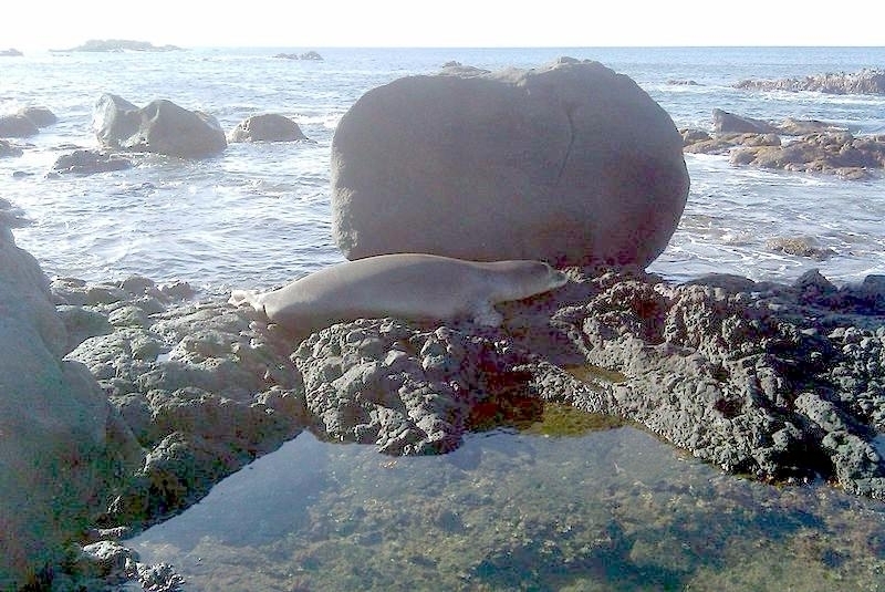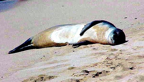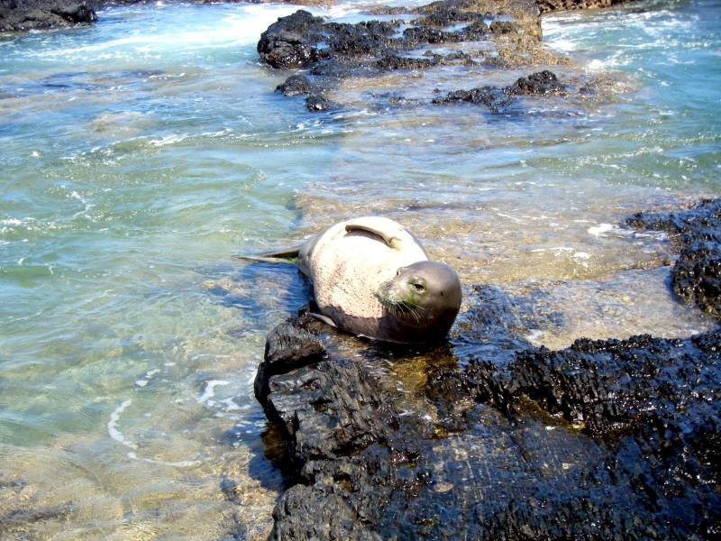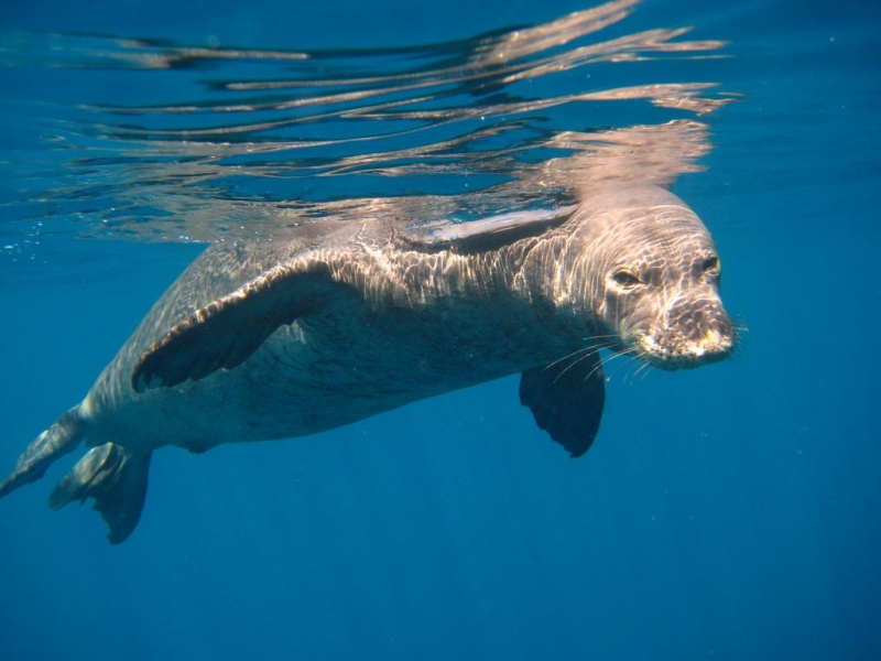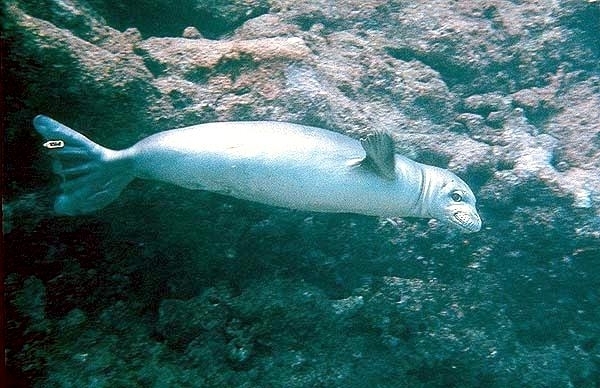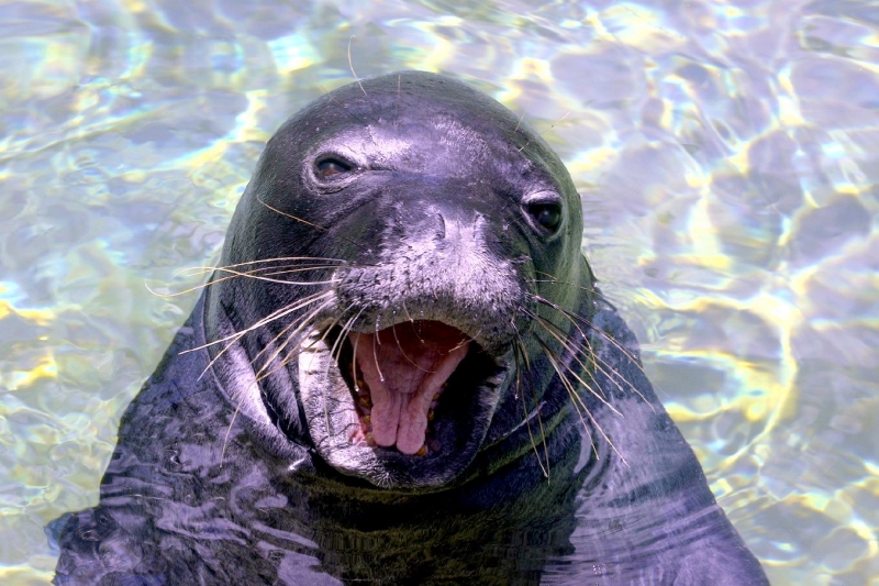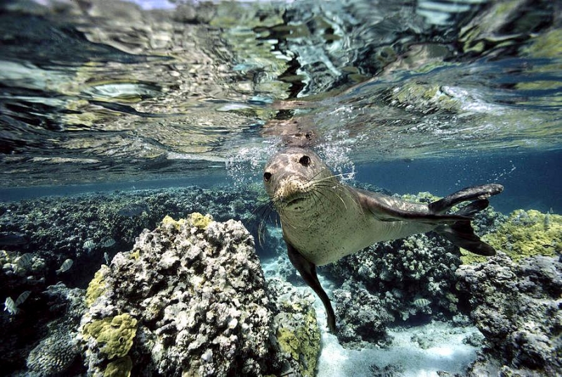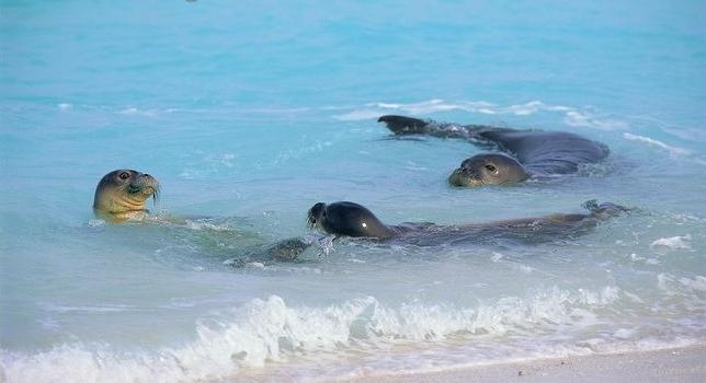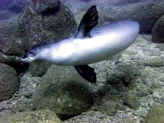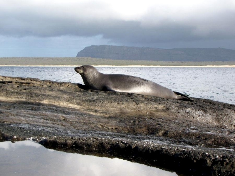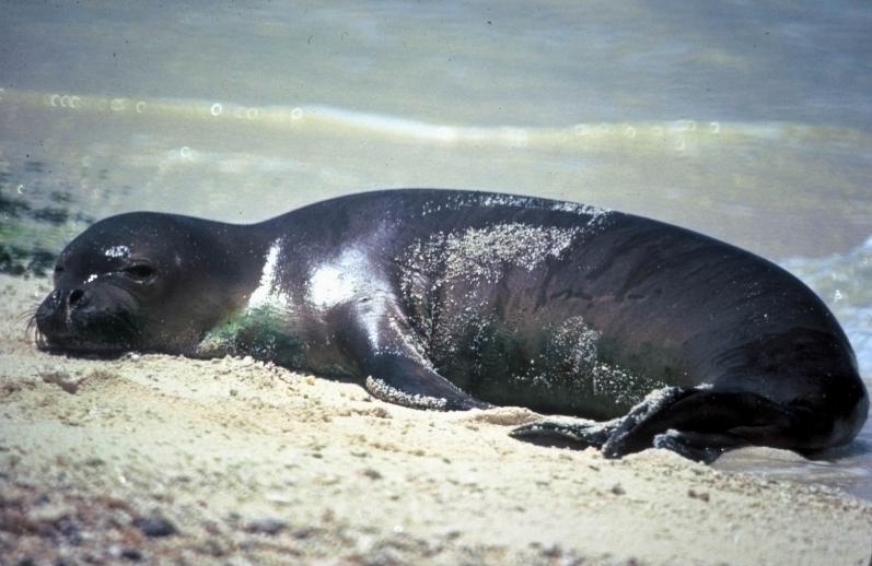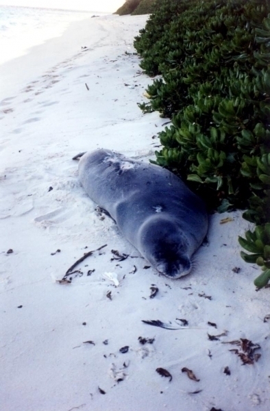 In Hawaii, Hawaiian Monk Seals are called “Ilio holo I ka uaua” which means “the Dog that goes in Rough Water”. Their common name is from the excess folds of skin around the seal’s neck causing them to look like they’re wearing a monk’s robe and for the fact that this is a solitary species usually found alone or in very small groups. Adults reach an average 2 meters in length of and weigh between 180-270 kilograms. Unlike many other seal species, female Hawaiian Monk Seals are usually slightly larger than the males. Adult coats are light gray to brown in color with lighter coloring on the chest. The maximum age for this species is 25 to 30 years, however few seals live that long. Hawaiian Monk Seals are the second most endangered pinniped species in the world after the very rare Mediterranean Monk Seal. Only 1,300 to 1,400 Hawaiian Monk Seals still inhabit the northwestern Hawaiian Islands. The largest population is found at French Frigate Shoals, others haul-out on Laysan Island, Lisianski Island, Pearl and Hermes Reef, Midway Atoll and Kure Atoll. There are additional small colonies at Necker Island and Nihoa Island and a small number of seals can be found on the main Hawaiian Islands. Hawaiian Monk Seals do not migrate and there is limited movement of individuals between colonies.