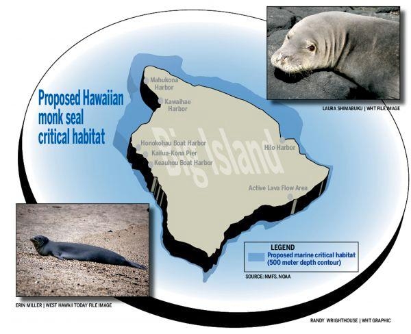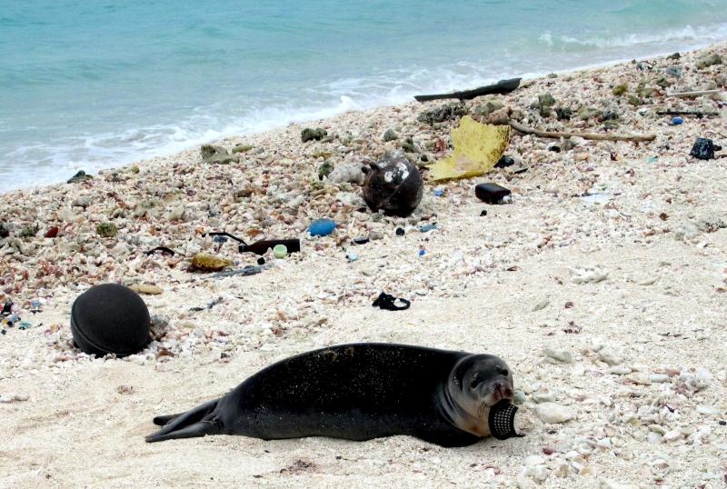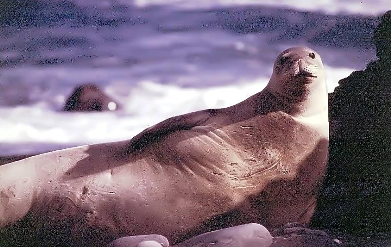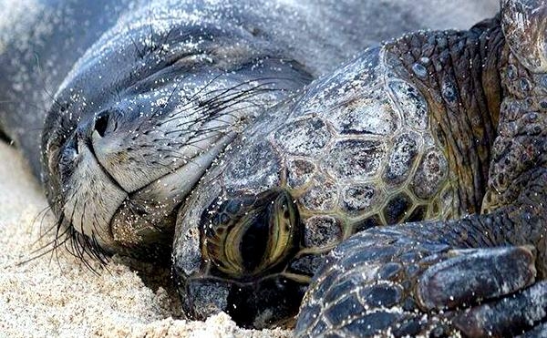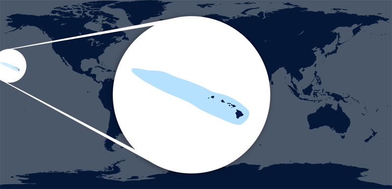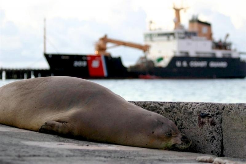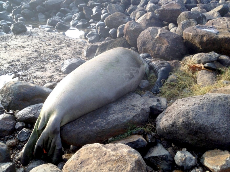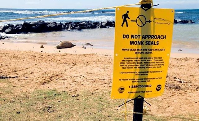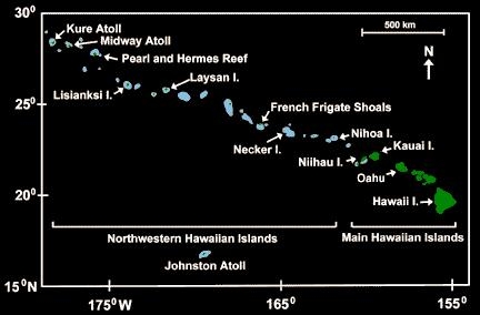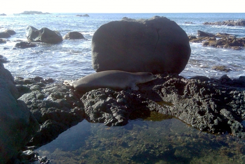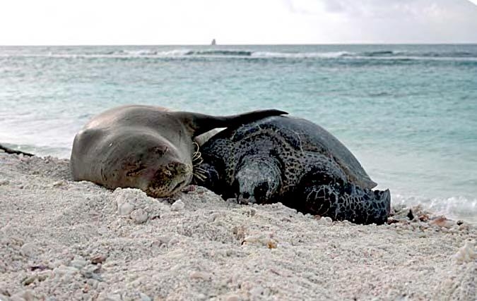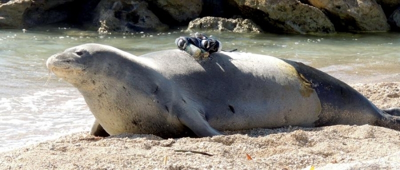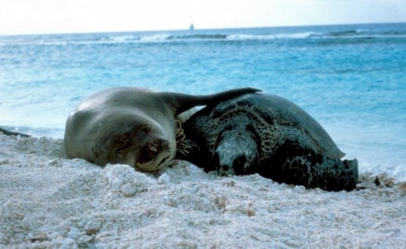 In Hawaii, Hawaiian Monk Seals are called “Ilio holo I ka uaua” which means “the Dog that goes in Rough Water”. Their common name is from the excess folds of skin around the seal’s neck causing them to look like they’re wearing a monk’s robe and for the fact that this is a solitary species usually found alone or in very small groups. Adults reach an average 2 meters in length of and weigh between 180-270 kilograms. Unlike many other seal species, female Hawaiian Monk Seals are usually slightly larger than the males. Adult coats are light gray to brown in color with lighter coloring on the chest. The maximum age for this species is 25 to 30 years, however few seals live that long. Hawaiian Monk Seals are the second most endangered pinniped species in the world after the very rare Mediterranean Monk Seal. Only 1,300 to 1,400 Hawaiian Monk Seals still inhabit the northwestern Hawaiian Islands. The largest population is found at French Frigate Shoals, others haul-out on Laysan Island, Lisianski Island, Pearl and Hermes Reef, Midway Atoll and Kure Atoll. There are additional small colonies at Necker Island and Nihoa Island and a small number of seals can be found on the main Hawaiian Islands. Hawaiian Monk Seals do not migrate and there is limited movement of individuals between colonies.