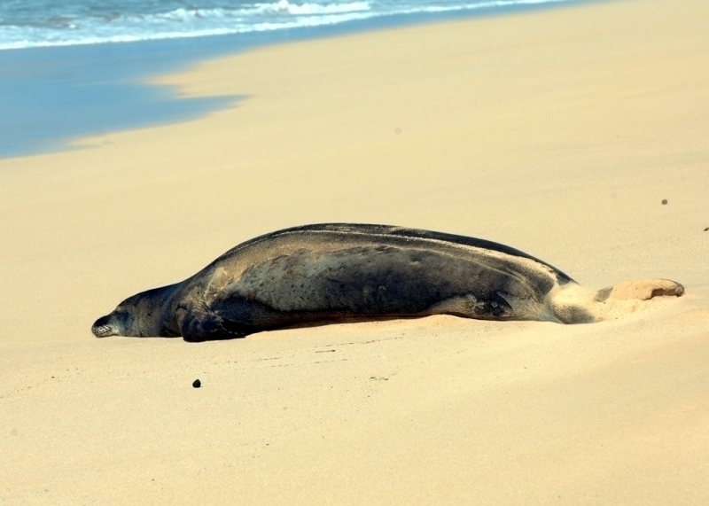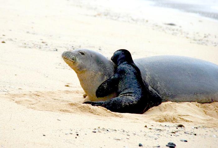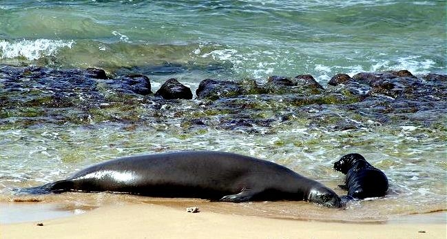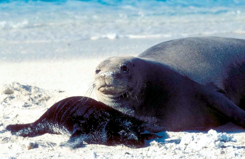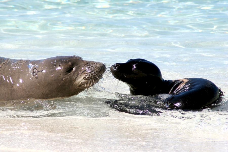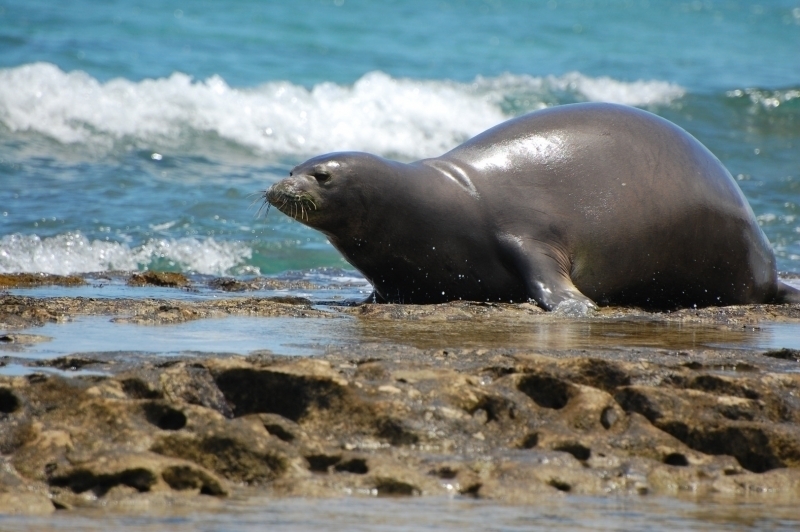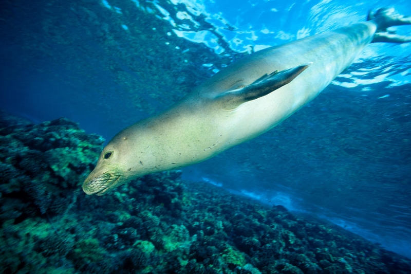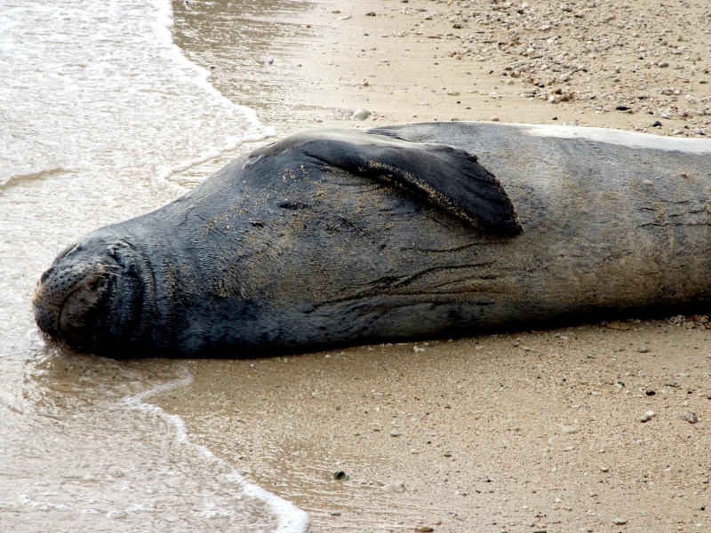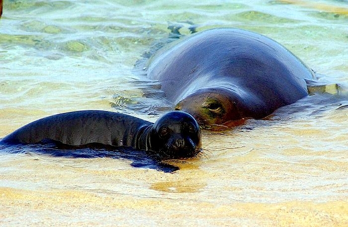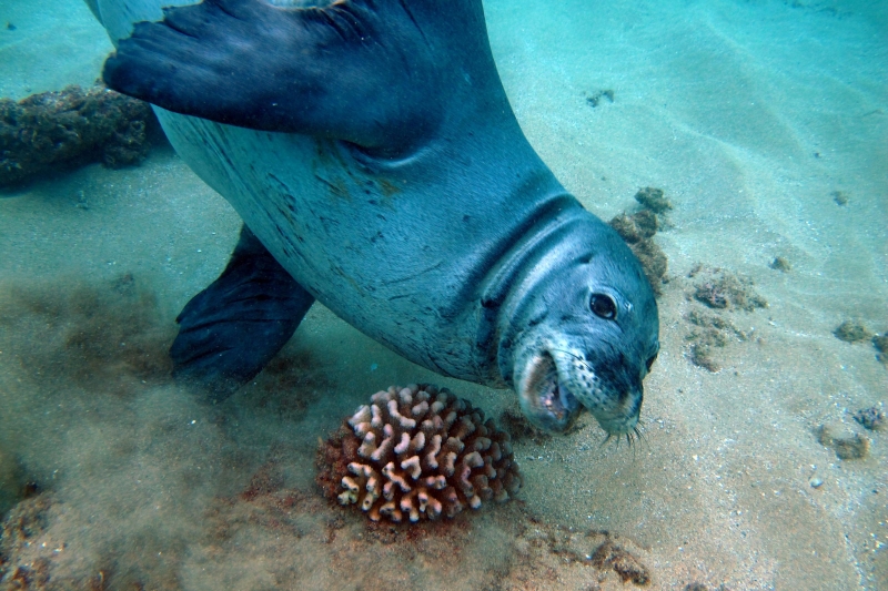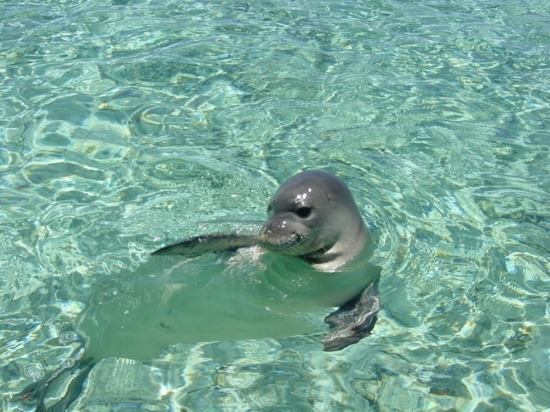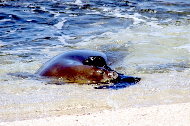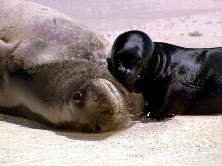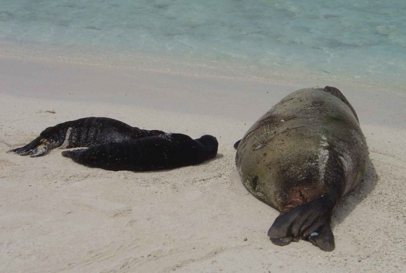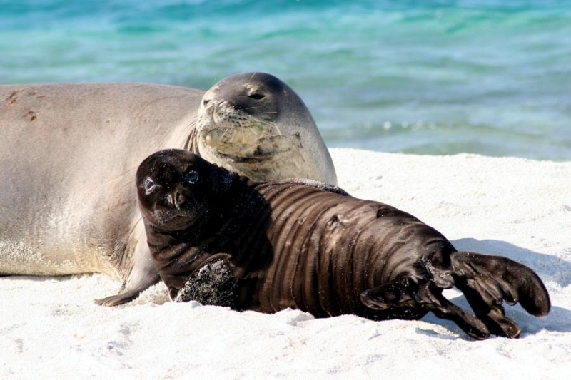 They feed on fish such as eels and flatfish as well as octopus and lobster. They are often found feeding on the slopes of coral reefs at depths of up to 75-90 meters for an average of 20 minutes. The maximum dive recorded for a Hawaiian Monk Seal is 500 meters. Hawaiian Monk Seals have a slow reproductive rate compared to other seal species. Females do not give birth until between 5-10 years of age. Breeding season lasts from February to July on breeding grounds near protected beaches with very shallow water next to the shoreline. Newborn pups measure about 1 meter in length and weigh about 11-15 kilograms. They’re born with a black coat which is molted 5-6 weeks after birth and replaced by the adult coat of light gray-brown. Mothers nurse their pups for 6-7 weeks after birth, during which time they do not feed usually losing an average of 90 kilograms. Females have been known to adopt pups and sometimes nurse pups exchanged between mothers. After weaning, the mother leaves to feed and the pup lives off its reserves until it is ready to leave the breeding site and learn to hunt. The mating ritual of Hawaiian Monk Seal is rarely witnessed because it takes place at sea. Adult males have been seen “mobbing”, an aggressive behavior where one or more males attempt to mate with immature seals of both sexes, often injuring or killing them. This behavior is likely due to the disparity between the number of males to females in Hawaiian Monk Seal populations as it seems to occur where there are more males than females.