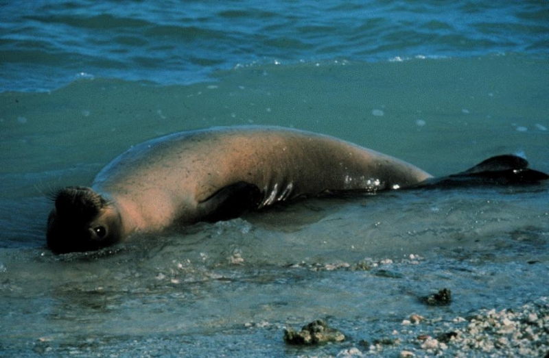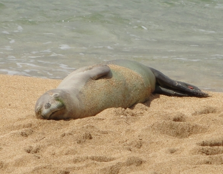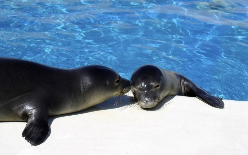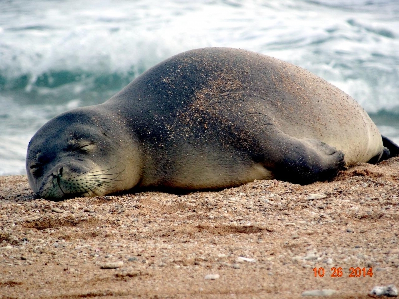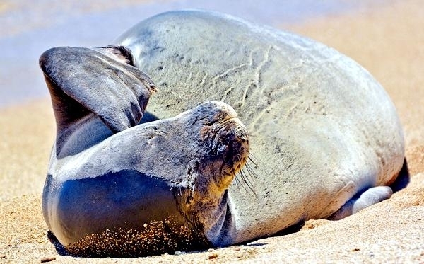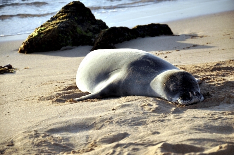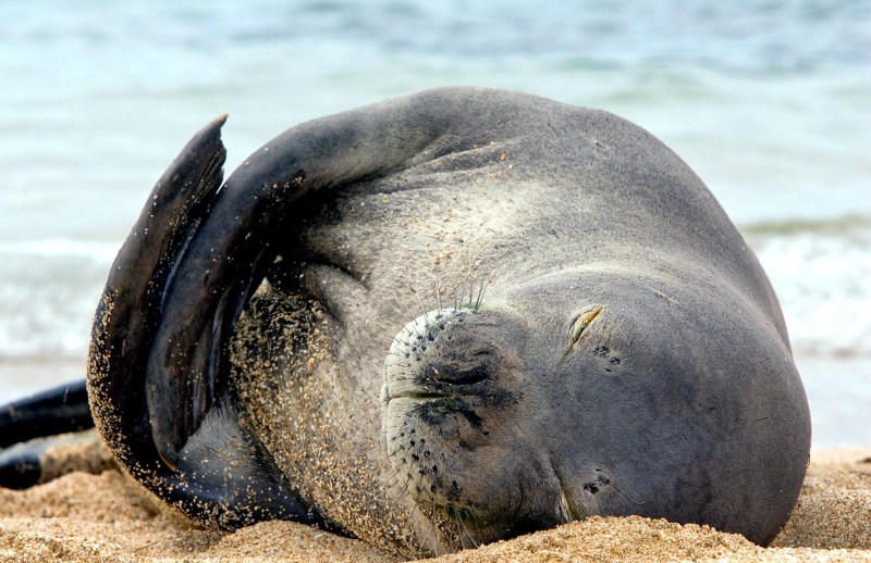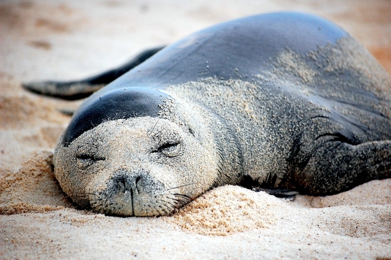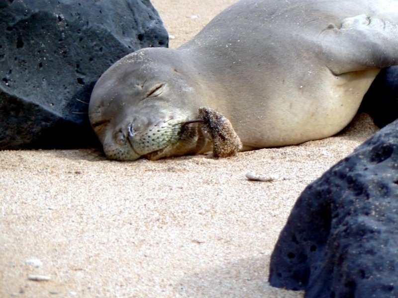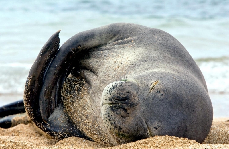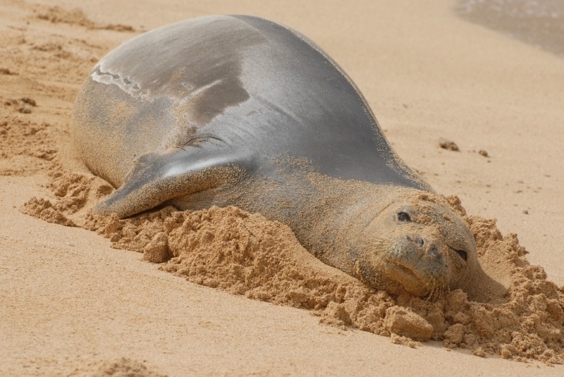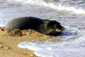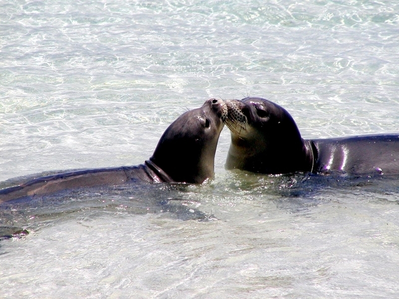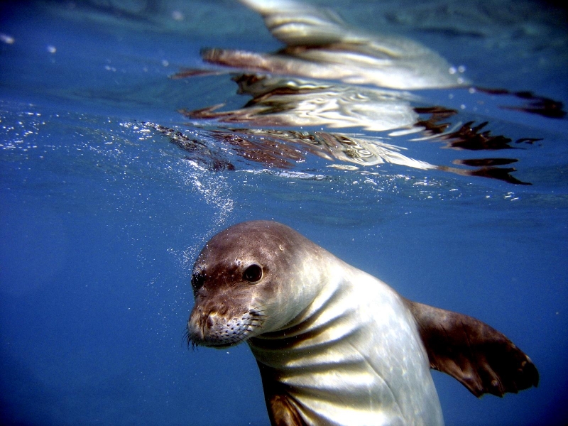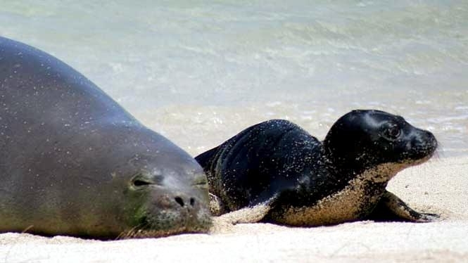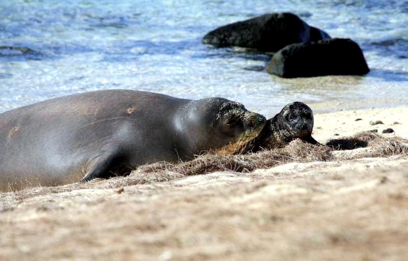 They feed on fish such as eels and flatfish as well as octopus and lobster. They are often found feeding on the slopes of coral reefs at depths of up to 75-90 meters for an average of 20 minutes. The maximum dive recorded for a Hawaiian Monk Seal is 500 meters. Hawaiian Monk Seals have a slow reproductive rate compared to other seal species. Females do not give birth until between 5-10 years of age. Breeding season lasts from February to July on breeding grounds near protected beaches with very shallow water next to the shoreline. Newborn pups measure about 1 meter in length and weigh about 11-15 kilograms. They’re born with a black coat which is molted 5-6 weeks after birth and replaced by the adult coat of light gray-brown. Mothers nurse their pups for 6-7 weeks after birth, during which time they do not feed usually losing an average of 90 kilograms. Females have been known to adopt pups and sometimes nurse pups exchanged between mothers. After weaning, the mother leaves to feed and the pup lives off its reserves until it is ready to leave the breeding site and learn to hunt. The mating ritual of Hawaiian Monk Seal is rarely witnessed because it takes place at sea. Adult males have been seen “mobbing”, an aggressive behavior where one or more males attempt to mate with immature seals of both sexes, often injuring or killing them. This behavior is likely due to the disparity between the number of males to females in Hawaiian Monk Seal populations as it seems to occur where there are more males than females.