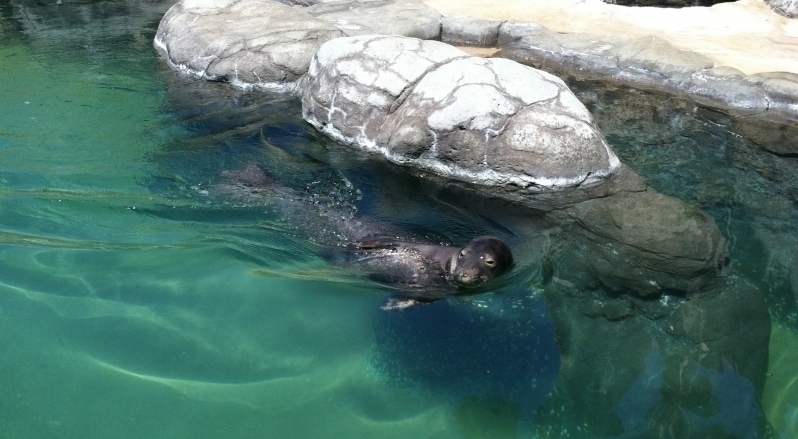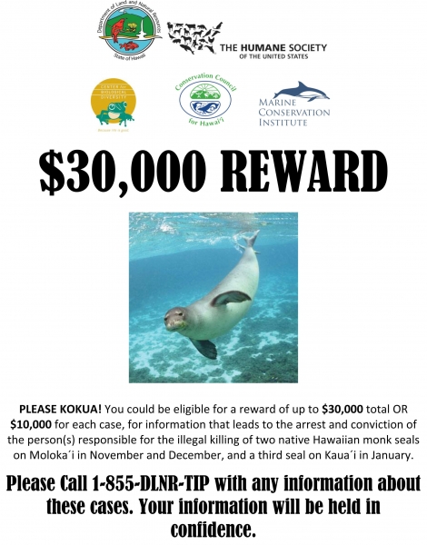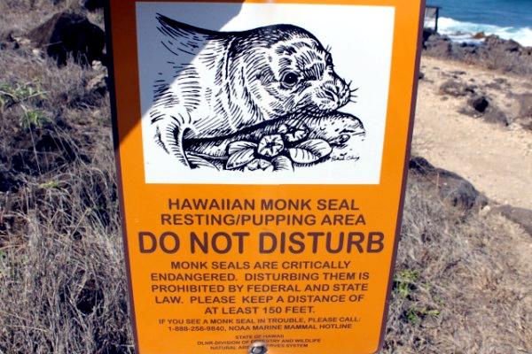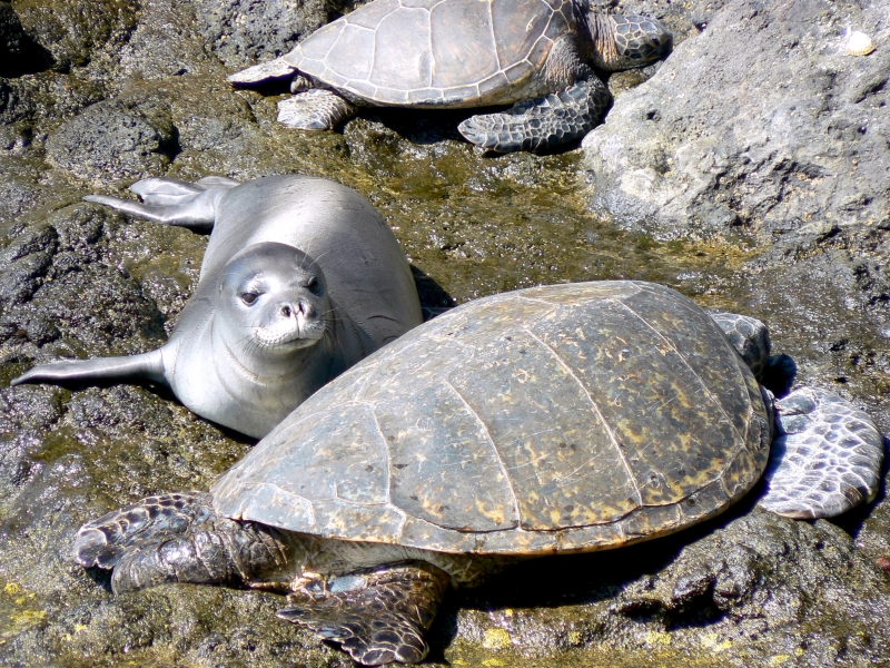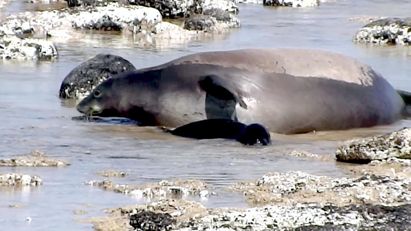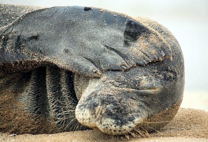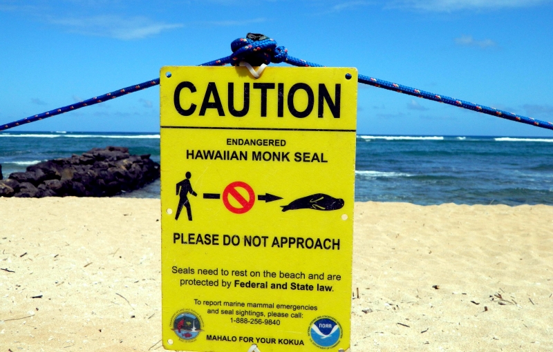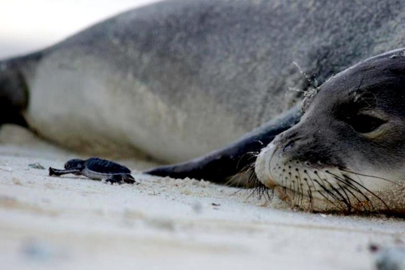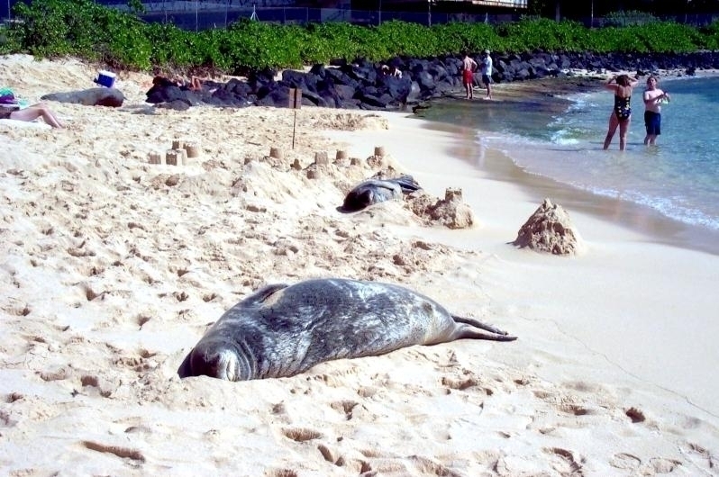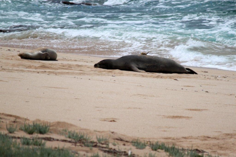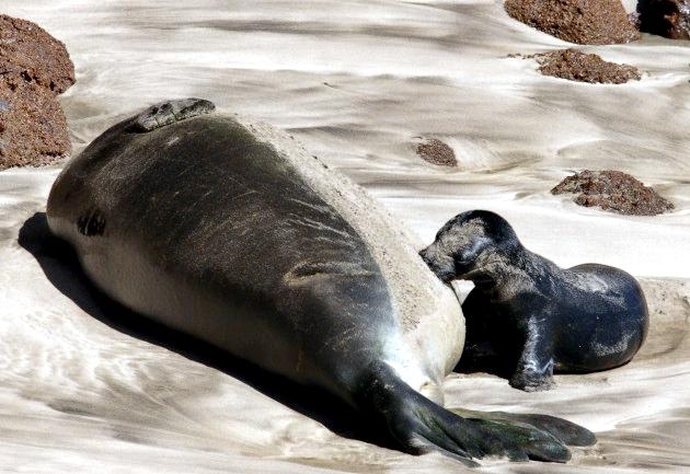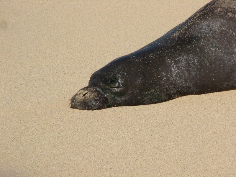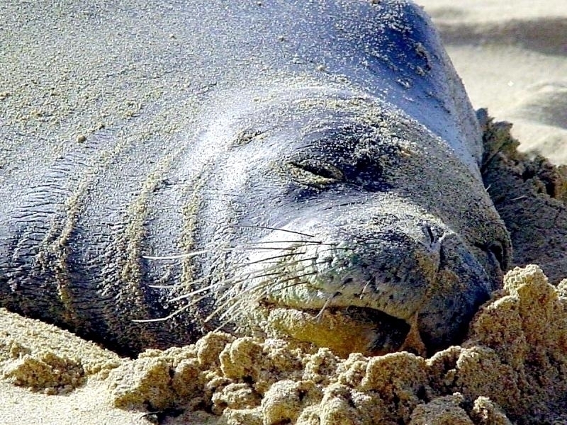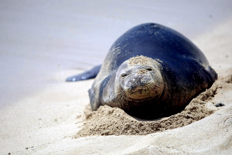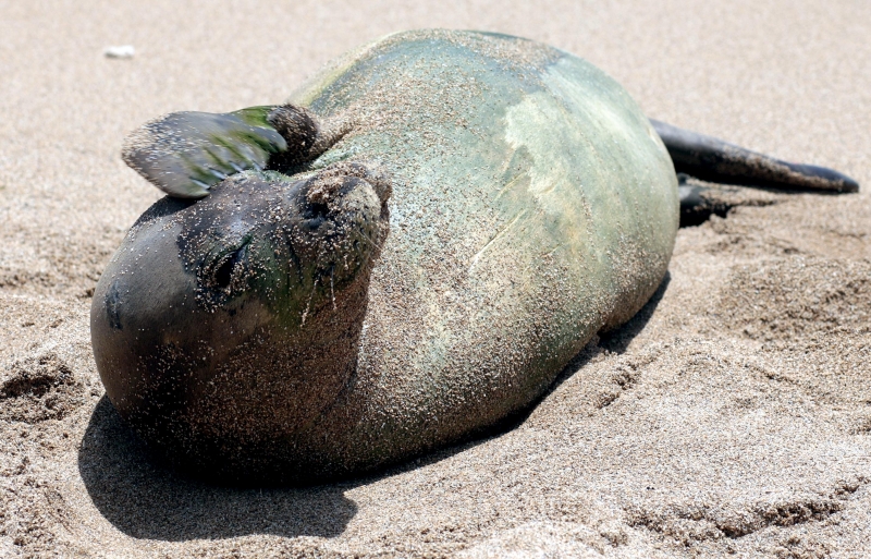 They feed on fish such as eels and flatfish as well as octopus and lobster. They are often found feeding on the slopes of coral reefs at depths of up to 75-90 meters for an average of 20 minutes. The maximum dive recorded for a Hawaiian Monk Seal is 500 meters. Hawaiian Monk Seals have a slow reproductive rate compared to other seal species. Females do not give birth until between 5-10 years of age. Breeding season lasts from February to July on breeding grounds near protected beaches with very shallow water next to the shoreline. Newborn pups measure about 1 meter in length and weigh about 11-15 kilograms. They’re born with a black coat which is molted 5-6 weeks after birth and replaced by the adult coat of light gray-brown. Mothers nurse their pups for 6-7 weeks after birth, during which time they do not feed usually losing an average of 90 kilograms. Females have been known to adopt pups and sometimes nurse pups exchanged between mothers. After weaning, the mother leaves to feed and the pup lives off its reserves until it is ready to leave the breeding site and learn to hunt. The mating ritual of Hawaiian Monk Seal is rarely witnessed because it takes place at sea. Adult males have been seen “mobbing”, an aggressive behavior where one or more males attempt to mate with immature seals of both sexes, often injuring or killing them. This behavior is likely due to the disparity between the number of males to females in Hawaiian Monk Seal populations as it seems to occur where there are more males than females.