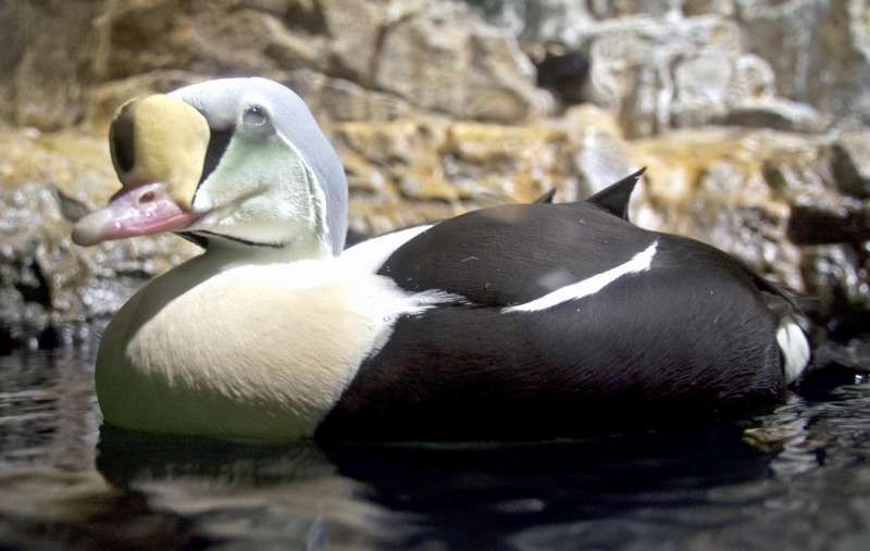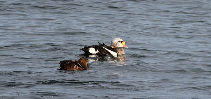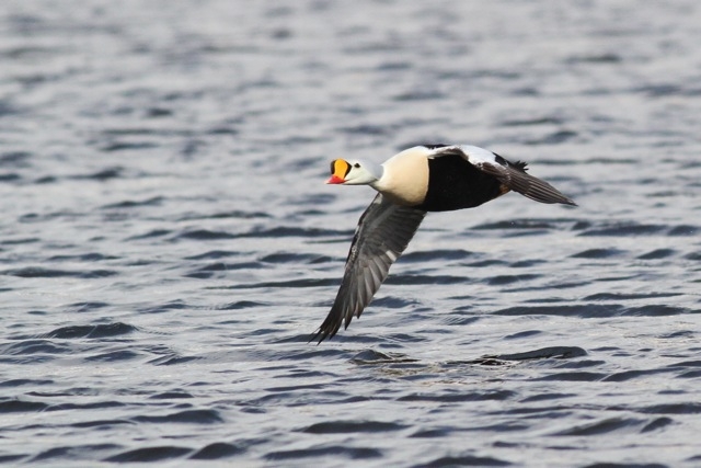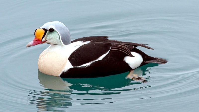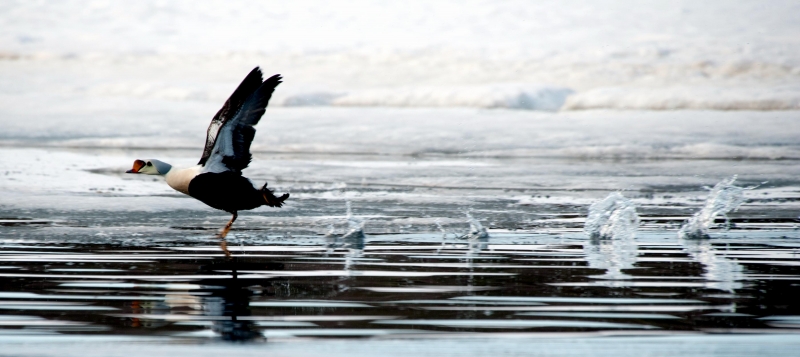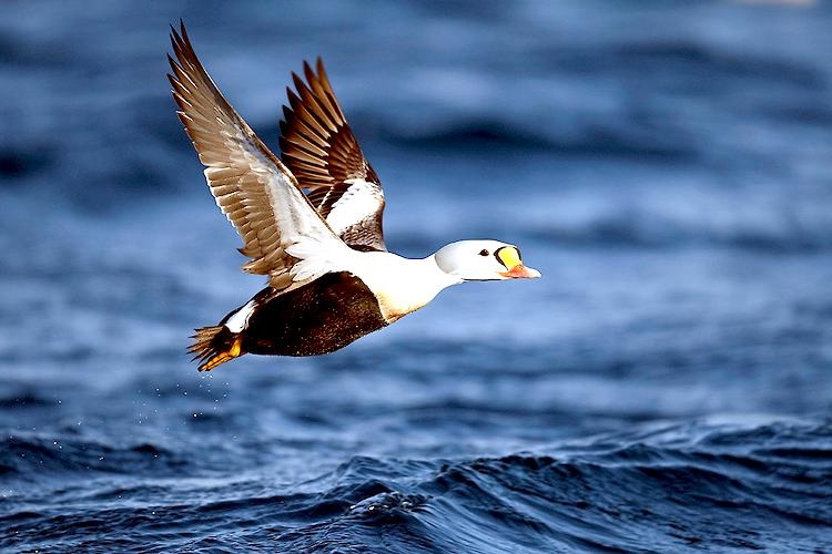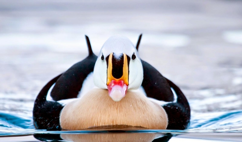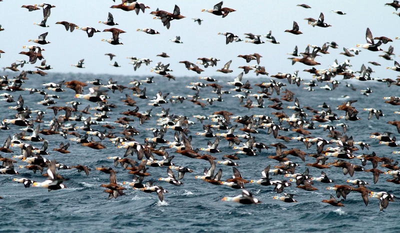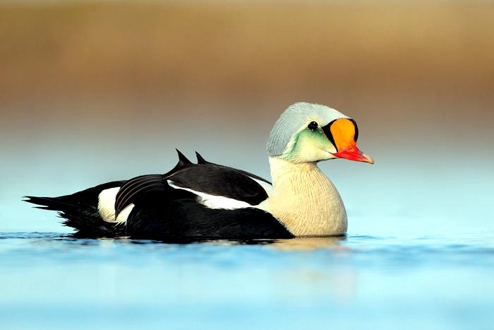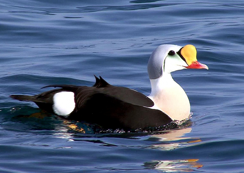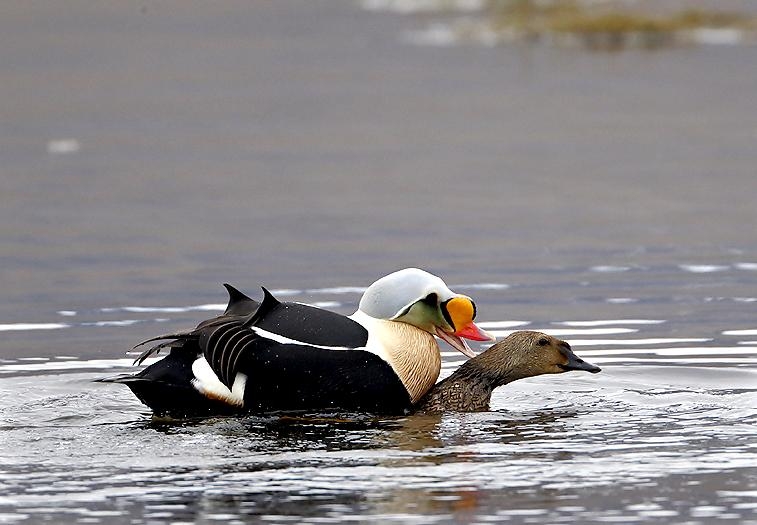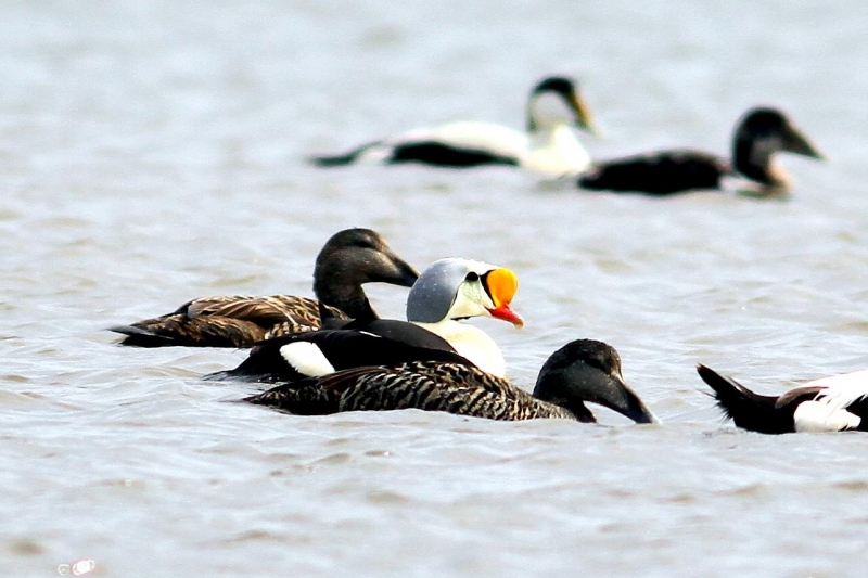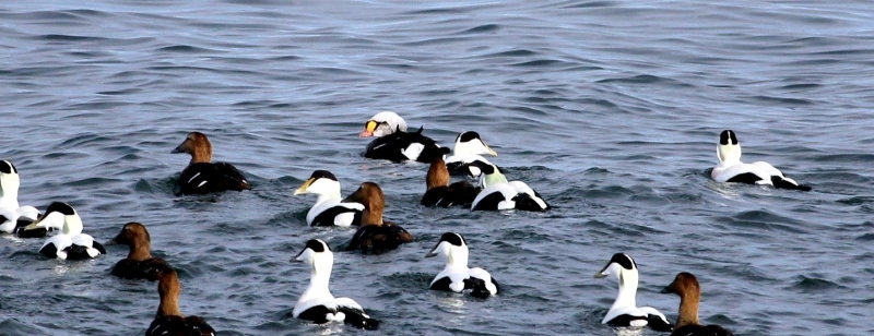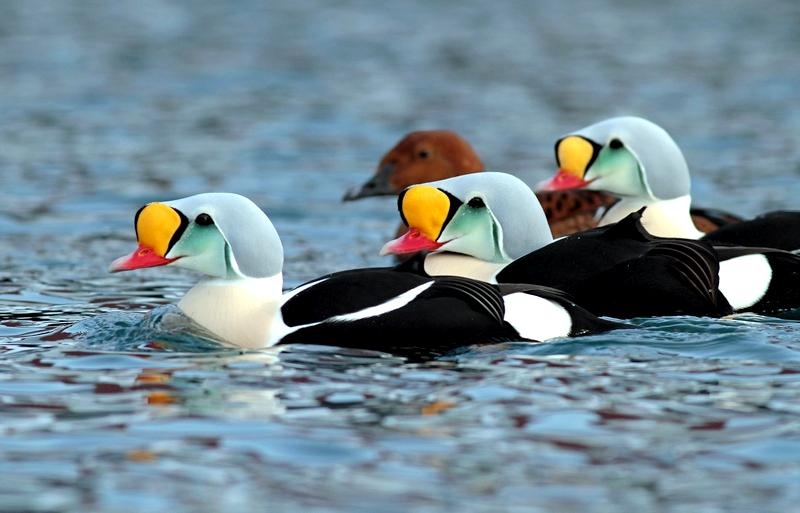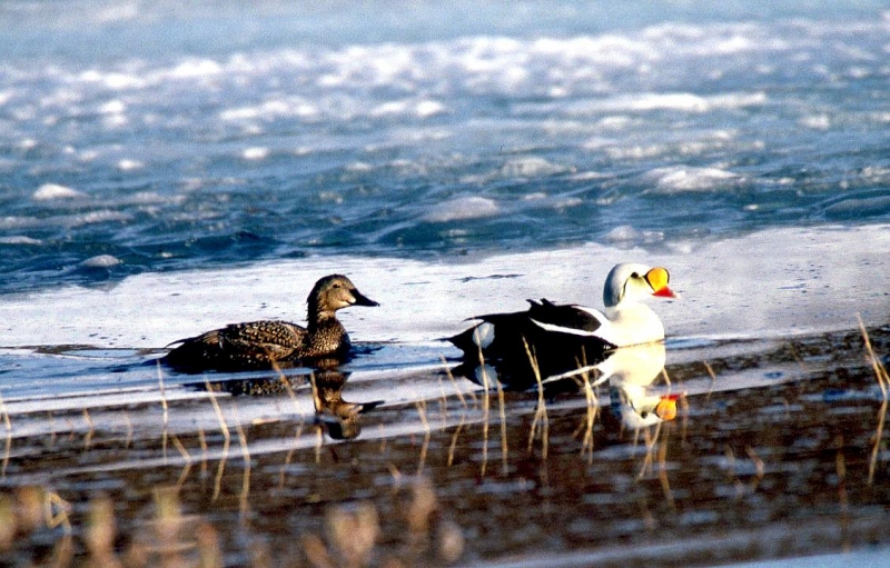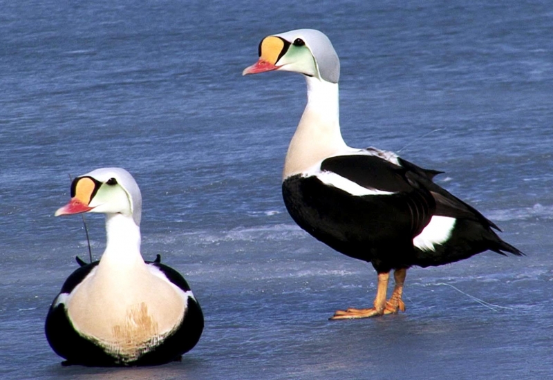 King Eiders generally nest in vegetation, often adjacent to small lakes and ponds or on small islets on the coast. The western migration corridor for the King Eider extends from the coast of Alaska to the Adelaide Peninsula in Canada. In the east they travel from Southampton Island, Boothia Peninsula and Ellesmere Island to the southwestern coast of Greenland. They winter as far north as the seas remain ice-free. The majority of the western population winters at sea along the Alaska Peninsula and Aleutian Islands, with rare sightings off British Columbia & California. The eastern population winters off the coast of southern Greenland, Labrador, Newfoundland and New England and occasionally as far south as Florida. Recent migration counts from the mid-1990’s provided an estimate of 375,000 birds. There are occasional, dramatic population fluctuations that may be the result of the late breakup of sea ice, severe weather conditions or starvation periods. Due to the remoteness of their range, little is known about the current population status. However, counts of migrating individuals in Alaska suggest a decline of 56% since the mid-1970’s. King Eiders dive great depths to feed on mollusks, crustaceans, sea cucumbers & aquatic insects. They also feed on eelgrass, wigeon grass and algae. There is a record of one King Eider feeding on the bottom in 30 fathoms (180 feet) of water in the Bering Sea. King Eiders are gregarious birds and gather to feed in the coastal waters, but they do not mix freely with other birds. They can be seen holding their bills horizontal to the surface of the water. During breeding, they feed on insects and crustaceans. They use their wings to “fly” under the water. The female has a higher pitched voice than the male. She makes a sound like “gogogogo”. The male makes crooning notes and chuckling noises. King Eiders fly in a direct course and have rapid wing beats when they fly. They can be seen flying abreast in long lines, instead of flying one behind each other. They are best known for their downy feathers which were once used for making bedding. King Eiders breed from November to April. They form individual pairs before they arrive at the nesting areas. They breed near freshwater tundra pools. In his dapper breeding costume, the male is ready for his breeding display. First he shakes his head and tosses his bill vertically. Next, he entices the female with soft coos & moaning sounds. Finally, he alternates the chin-lifting with neck stretching; he stretches his neck out to her and then quickly returns his neck to a resting position. After mating, the female scrapes a depression in a raised portion of ground near the water. She lines her nest with plant matter and down feathers. She lays 4-5 eggs in her nest. At this point the male returns to sea. The female plucks her own abdominal feathers out for lining her nest. She carefully covers her eggs with a thick layer of down when she goes out at night to find food. Without this covering, the eggs would cool off and the developing chicks would die. The female King Eider incubates her eggs for 27-30 days and will tend to her young until they leave the nest and are able to find food on their own. Many females move to the sea before the chicks have fledged.