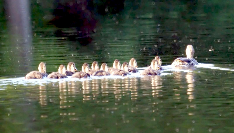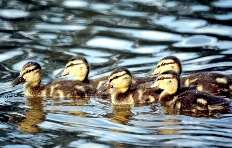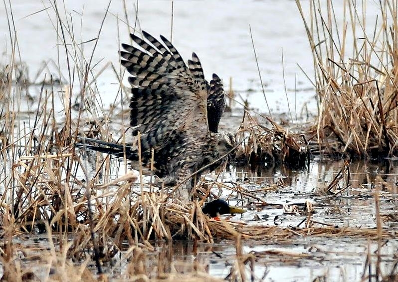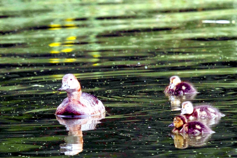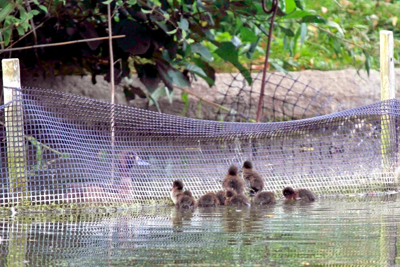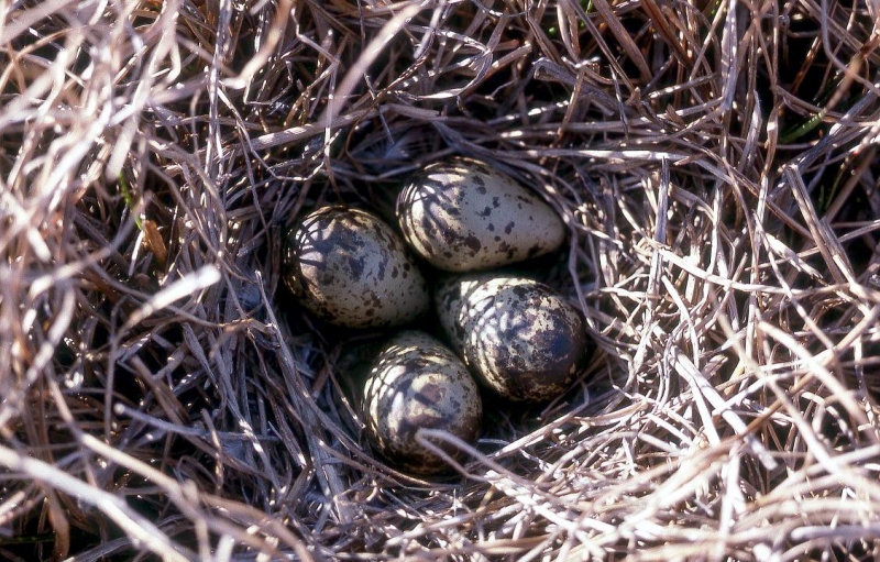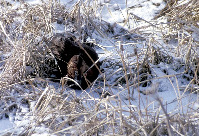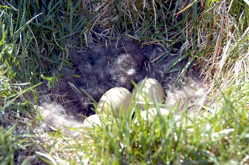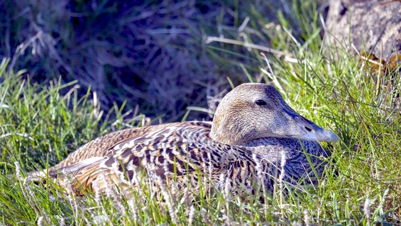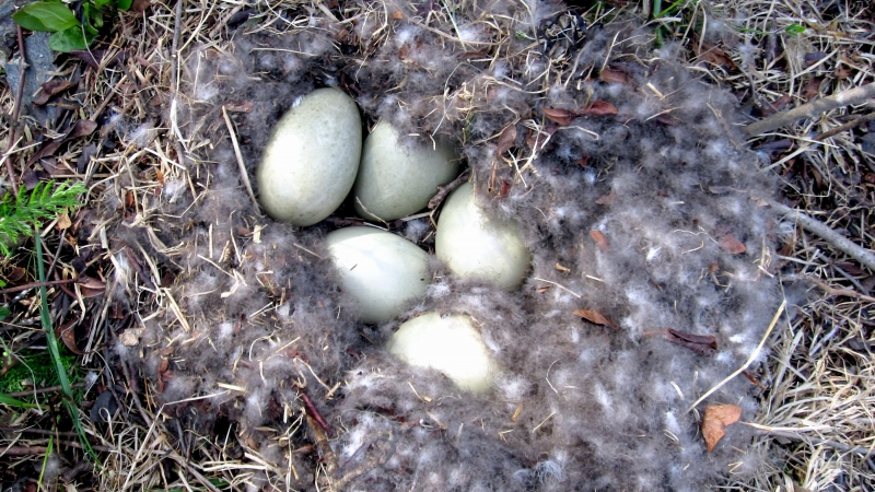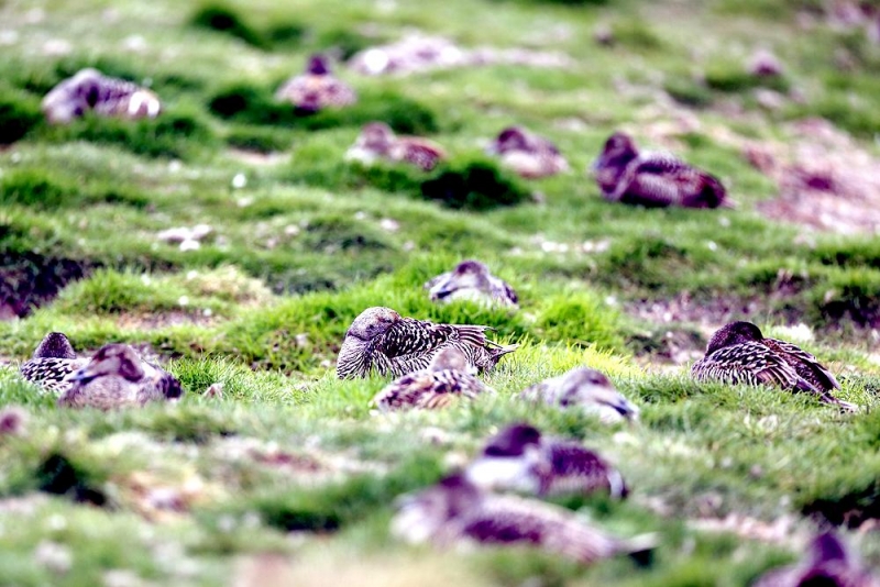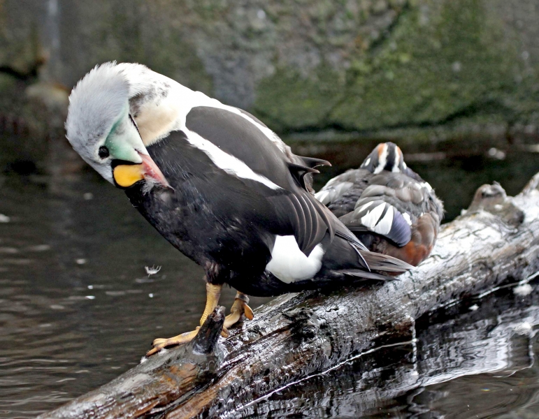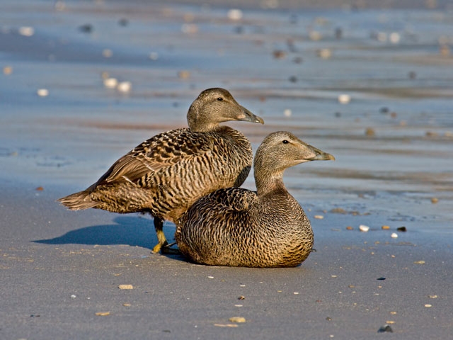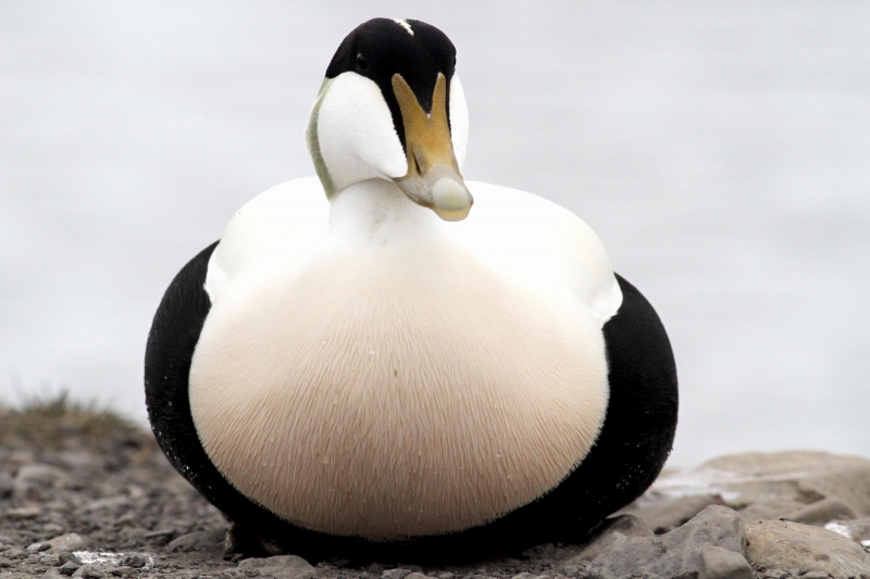 King Eiders generally nest in vegetation, often adjacent to small lakes and ponds or on small islets on the coast. The western migration corridor for the King Eider extends from the coast of Alaska to the Adelaide Peninsula in Canada. In the east they travel from Southampton Island, Boothia Peninsula and Ellesmere Island to the southwestern coast of Greenland. They winter as far north as the seas remain ice-free. The majority of the western population winters at sea along the Alaska Peninsula and Aleutian Islands, with rare sightings off British Columbia & California. The eastern population winters off the coast of southern Greenland, Labrador, Newfoundland and New England and occasionally as far south as Florida. Recent migration counts from the mid-1990’s provided an estimate of 375,000 birds. There are occasional, dramatic population fluctuations that may be the result of the late breakup of sea ice, severe weather conditions or starvation periods. Due to the remoteness of their range, little is known about the current population status. However, counts of migrating individuals in Alaska suggest a decline of 56% since the mid-1970’s. King Eiders dive great depths to feed on mollusks, crustaceans, sea cucumbers & aquatic insects. They also feed on eelgrass, wigeon grass and algae. There is a record of one King Eider feeding on the bottom in 30 fathoms (180 feet) of water in the Bering Sea. King Eiders are gregarious birds and gather to feed in the coastal waters, but they do not mix freely with other birds. They can be seen holding their bills horizontal to the surface of the water. During breeding, they feed on insects and crustaceans. They use their wings to “fly” under the water. The female has a higher pitched voice than the male. She makes a sound like “gogogogo”. The male makes crooning notes and chuckling noises. King Eiders fly in a direct course and have rapid wing beats when they fly. They can be seen flying abreast in long lines, instead of flying one behind each other. They are best known for their downy feathers which were once used for making bedding. King Eiders breed from November to April. They form individual pairs before they arrive at the nesting areas. They breed near freshwater tundra pools. In his dapper breeding costume, the male is ready for his breeding display. First he shakes his head and tosses his bill vertically. Next, he entices the female with soft coos & moaning sounds. Finally, he alternates the chin-lifting with neck stretching; he stretches his neck out to her and then quickly returns his neck to a resting position. After mating, the female scrapes a depression in a raised portion of ground near the water. She lines her nest with plant matter and down feathers. She lays 4-5 eggs in her nest. At this point the male returns to sea. The female plucks her own abdominal feathers out for lining her nest. She carefully covers her eggs with a thick layer of down when she goes out at night to find food. Without this covering, the eggs would cool off and the developing chicks would die. The female King Eider incubates her eggs for 27-30 days and will tend to her young until they leave the nest and are able to find food on their own. Many females move to the sea before the chicks have fledged.