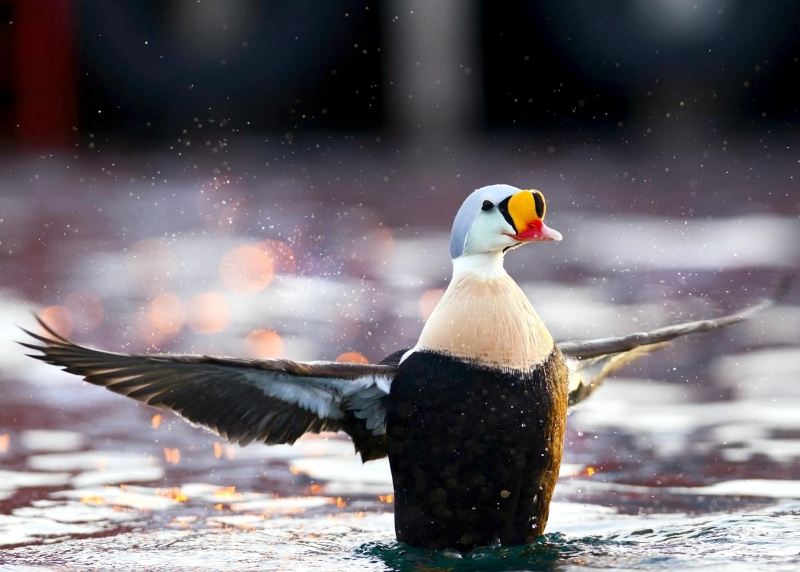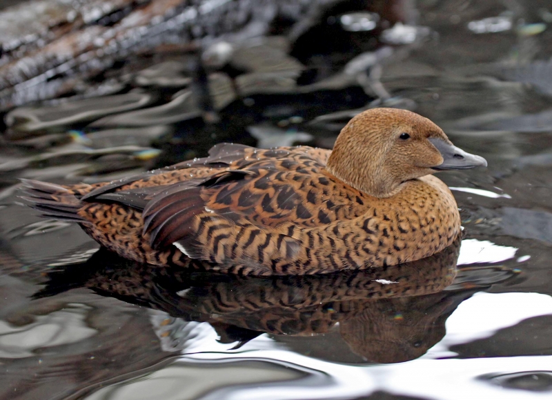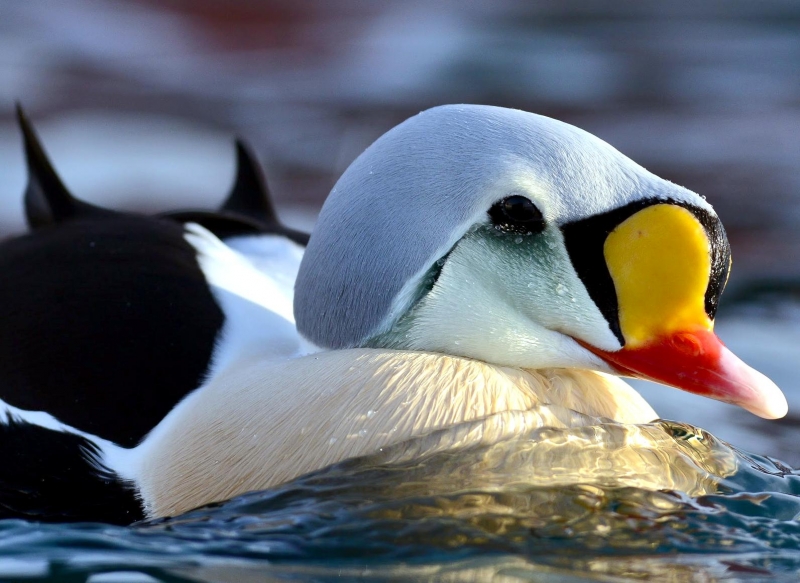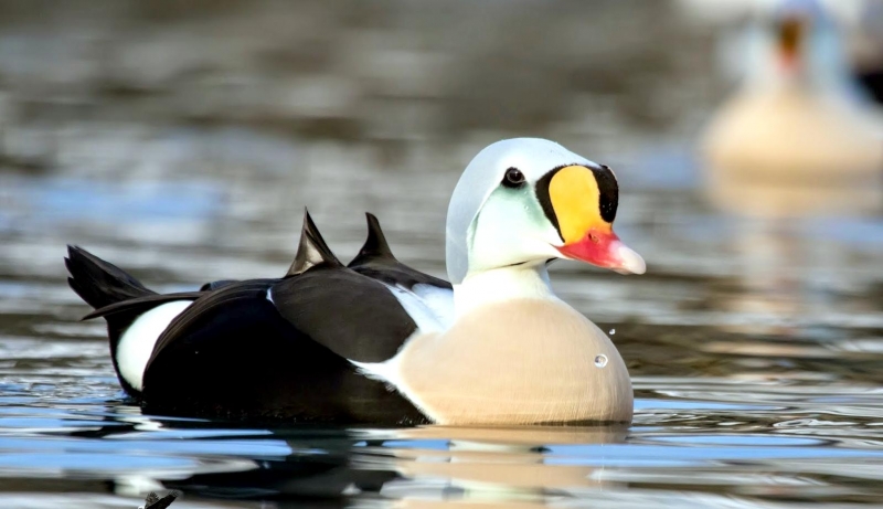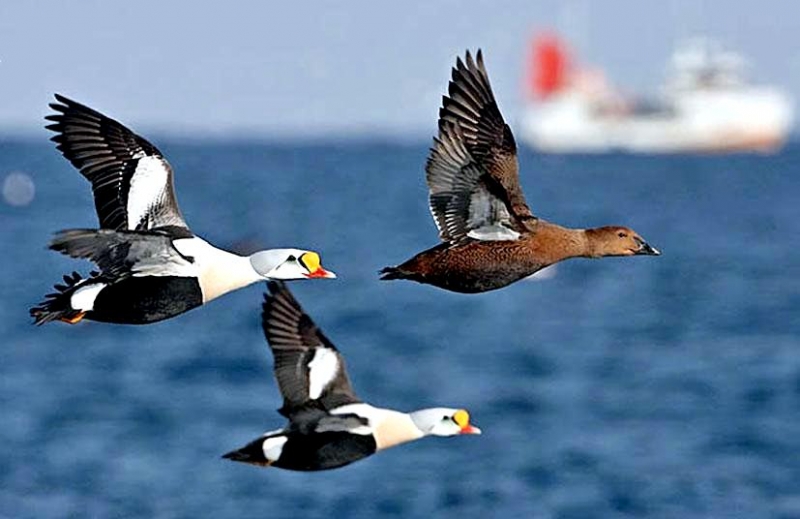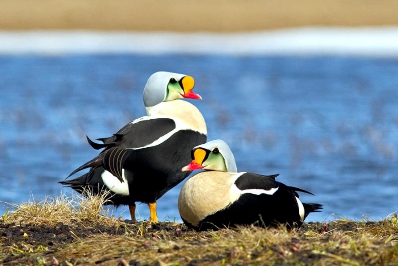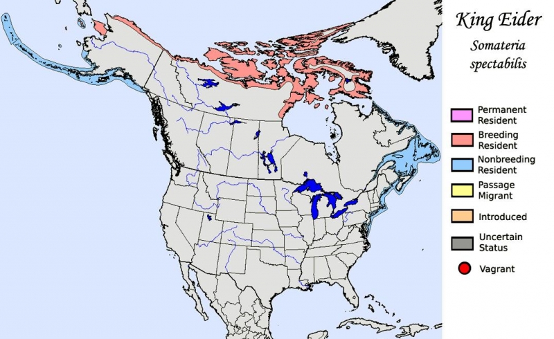 The King Eider is the largest sea duck in the northern hemisphere, measuring in at about 22 inches and is named as a direct translation of its Icelandic name. It is called “king” because of the orange, crown-like knob above the male’s bill; the male’s multicolored plumage also suggests royal robes. “Eider” is a Dutch, German or Swedish word derived from the Icelandic word “æður” (meaning eider), itself derived from the Old Norse “æthr”. The male has oblong-shaped head and a relatively small red-orange bill with a large yellow-orange frontal shield which is outlined in black which forms an obvious knob on his forehead. The crown of his head and the nape of his neck are gray-blue. The male has greenish cheeks outlined in black and he has a pinkish-white throat & chest. The rest of the body including his tail is black, except for white patches at the base of the tail and white wing patches. The King Eider has two small black “sails” or upper wings that stick up from his back. The legs & feet are dull orange and in non-breeding or eclipse, the male is brownish-black overall but retains the white patch on his upper wings. The female King Eider sometimes called the “Queen Eider”, is a warm rufous-brown color with black chevrons on her upper parts and flanks. Both her head and neck are cinnamon-brown and finely streaked with black. She has a pale buff-colored eye ring and a down-curving rear eye stripe. She has a dark gape line at the base of her bill. Her bill is shorter and rounder and has less feathering along the bill. Her wings are dark above with a thin white strip along the tips. She has pale under parts. Her legs & feet are greenish. The juveniles are dull gray-brown with a light breast and a dark brown head; they have scaly patterns on their under parts with an upturned “grinning” look to their bills. The young male King Eider begins to show white on his chest in late autumn. The white varies as he becomes an adult and he becomes darker above. Full plumage is completed at three years. The King Eider is found the arctic regions of the Northern Hemisphere. You will find them in northern Alaska, northern Canada, on the coasts of northern Greenland and arctic Russia along rocky coasts, inlets & tundra pools. They are partial migrators and migrate in huge flocks in the spring. The flocks sometimes consist of all males or all females. They spend most of the winters at sea in the Arctic Circle. Their plumage gives them protection against the cold. The King Eider has a circumpolar distribution. In North America, it breeds along the Arctic coast from Alaska to Greenland and along most of the northern Hudson Bay shoreline.