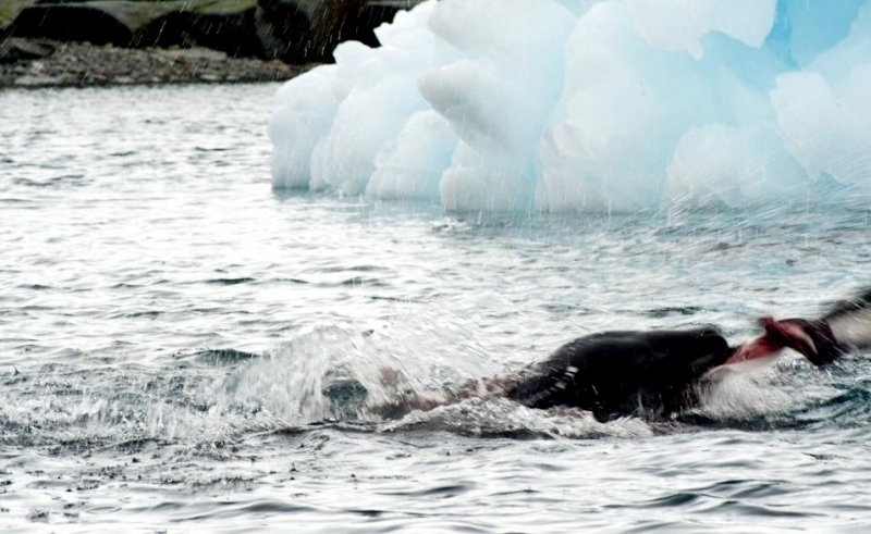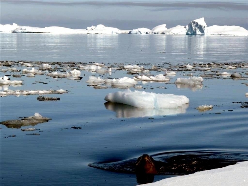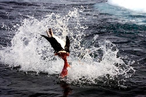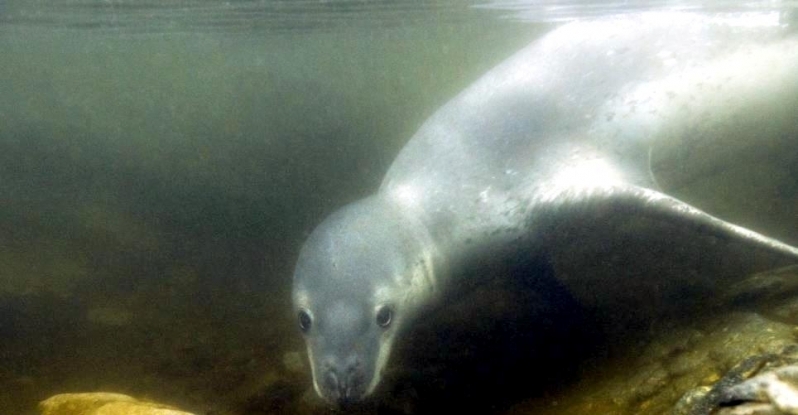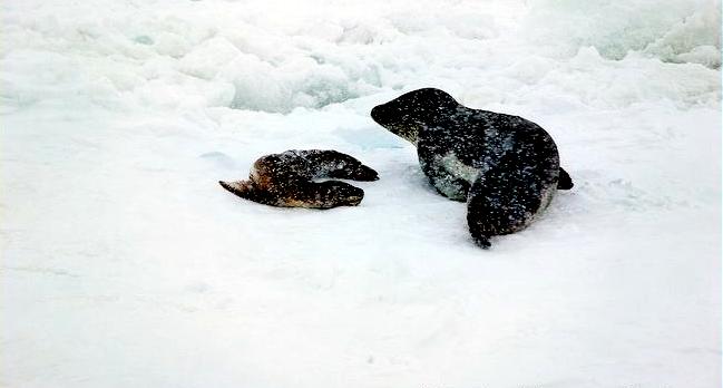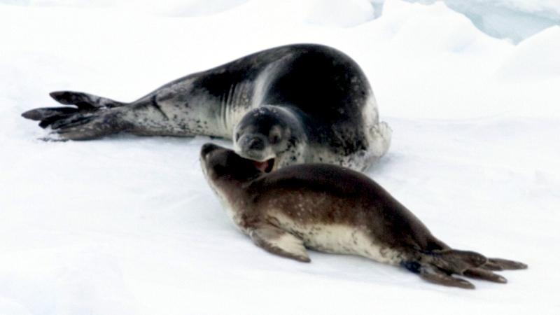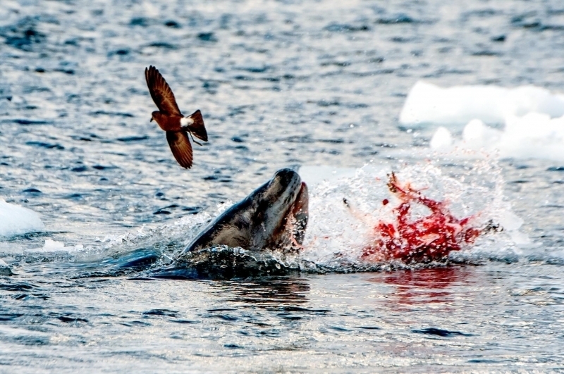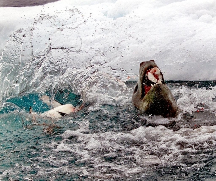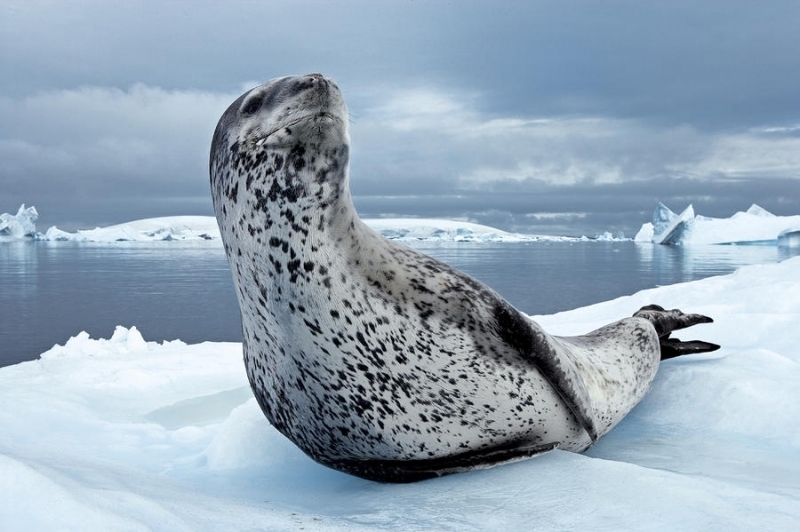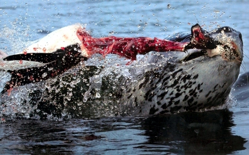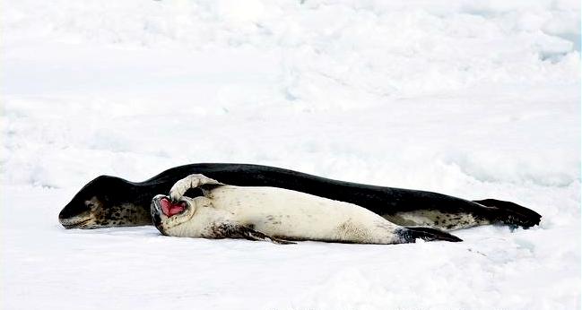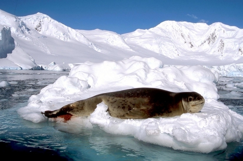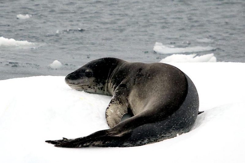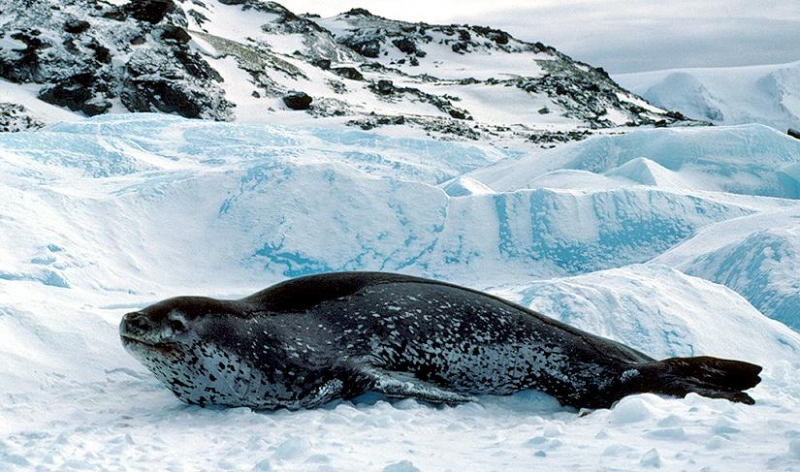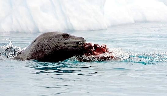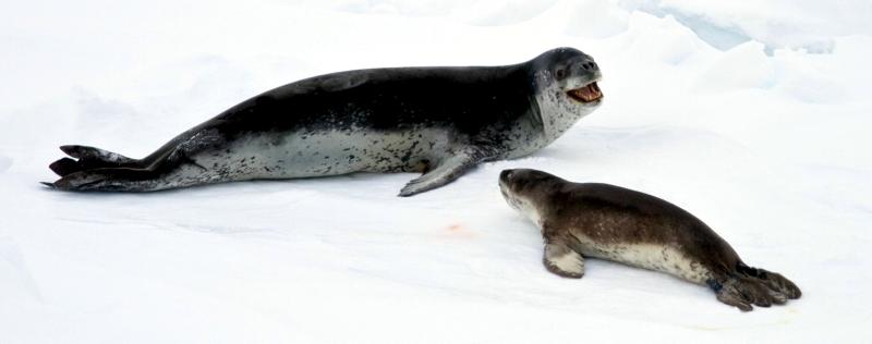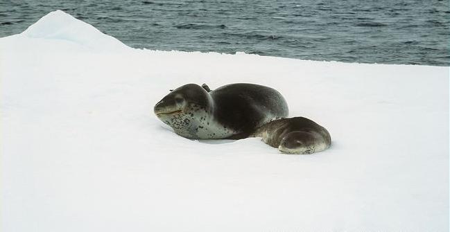 Population size is difficult to calculate because they live in an area difficult to reach. Their population size has been estimated at 220,000-440,000. Leopard Seals eat a varied diet. They are the only pinniped whose diet includes a significant amount of warm-blooded animals. They have been known to attack Crabeater Seals and Southern Fur Seals. They prey on krill, other seals particularly young Crabeater Seals, various penguin species, fish and cephalopods. Proportions vary according to age and availability. Like other seals, they are also known to scavenge the carrion of whales and other seals. Leopard Seals can dive up to 15 minutes, however because their diet includes warm-blooded animals they are not deep diving seals. Leopard Seals are awkward on land however, their unusually large fore-flippers give them speed & agility in the water. They are sometimes preyed on by Killer Whales. Males reach sexual maturity between age 6-7, females 3-7. Mating season lasts from November to February. Males are thought to be serially polygamous. Gestation lasts around 11 months, but implantation appears to be delayed for about 2 months. Most births occur in October and November. The female gives birth to a single pup weighing about 30 kilograms and about 1.6 meters long and nurses for about a month. Males do not seem to participate in parental care. The life span of Leopard Seals is about 26 years.