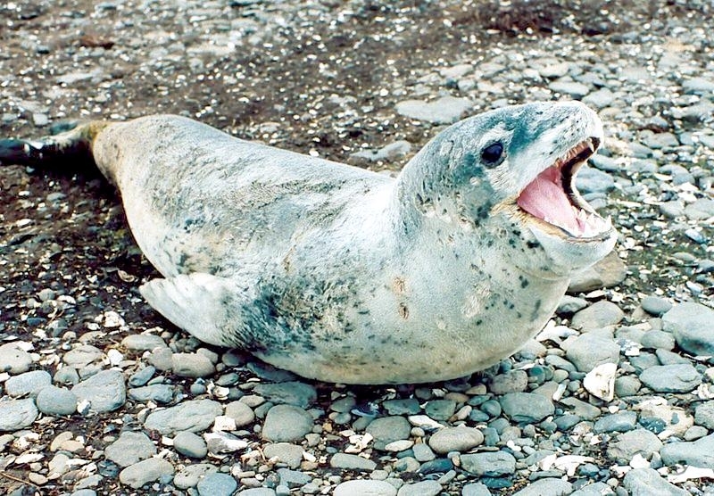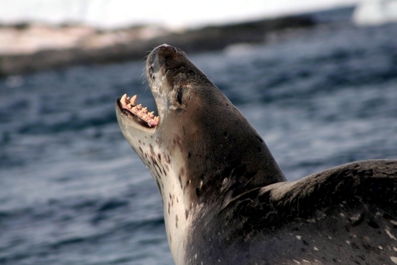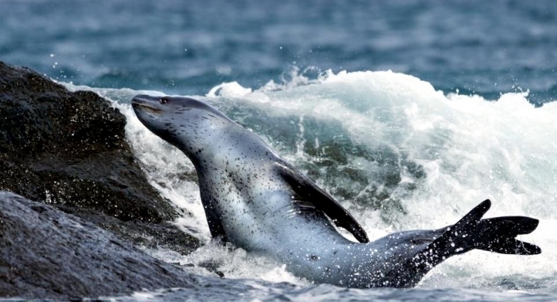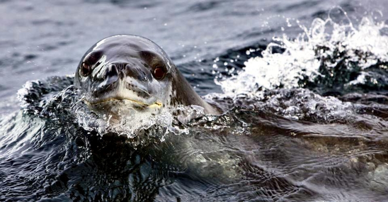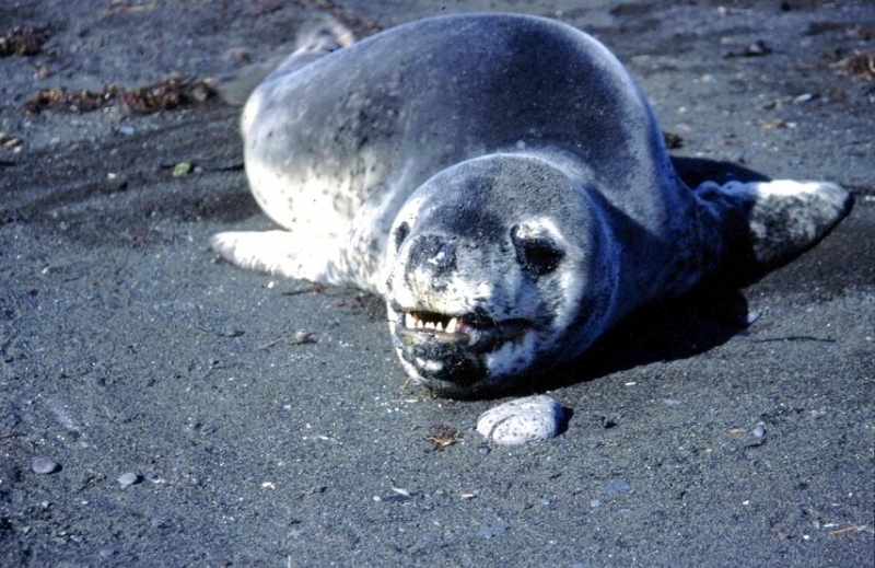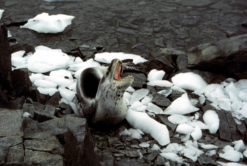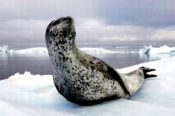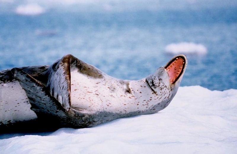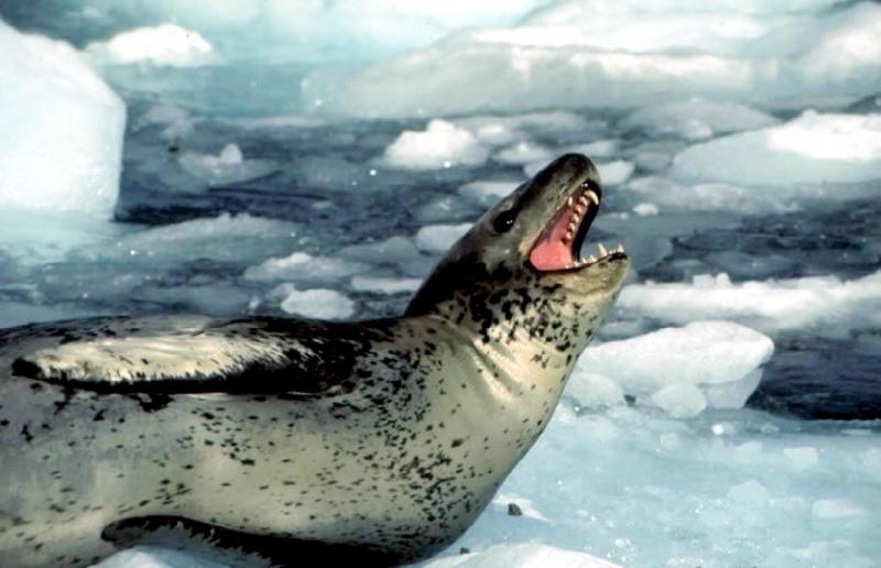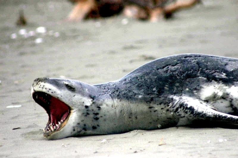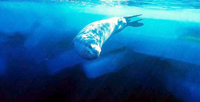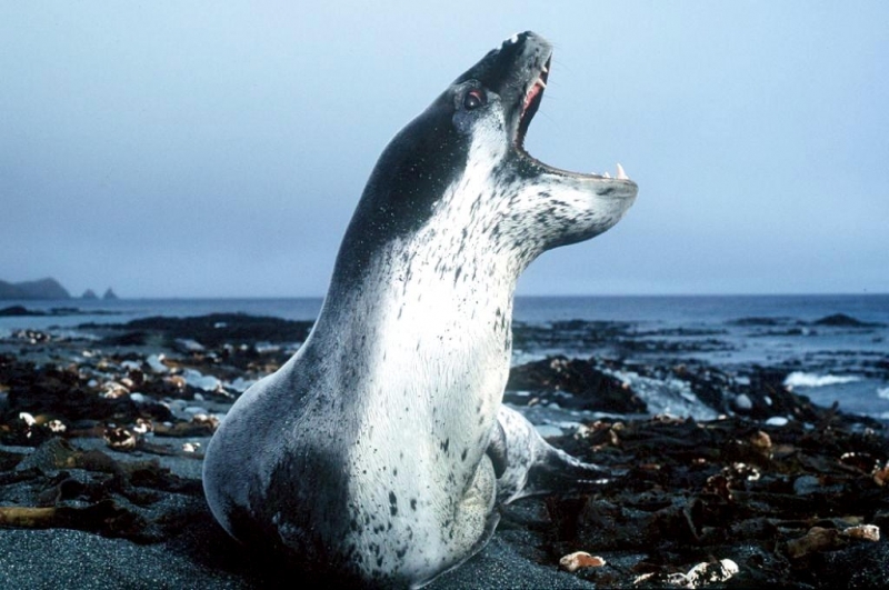 Leopard Seals are large & impressive members of the seal family reaching between 2.41-3.38 meters in length and weighing between 200-591 kilograms. Females are slightly larger than males. Their massive bodies have large heads and long broad fore-flippers. Unlike other seal species that swim by moving their hind limbs side to side, Leopard Seals swim gracefully using long, powerful, simultaneous strokes of the forelimbs simultaneously. Adults are dark gray to black in color with varying dark spots on their dorsal (upper) side and pale on their ventral (under) side. Pup’s have soft, thick coats with a dorsal stripe and black spots on the light gray ventral side. Adults have well-developed canine teeth and 3 tubercles or lobes on the sides of their jaws that allow them to filter krill from the water. Leopard Seals are wide-ranging found in the Atlantic and Pacific oceans and in the polar & sub-polar waters of the Southern Hemisphere along the coast of Antarctica and on many sub-Antarctic islands. They’ve also been seen on the South African & South Australian coasts around Tasmania, Lord Howe Island, the Cook Islands and Tierra del Fuego. Adults are found on the outer fringes of ice pack. The young are found around sub-Antarctic islands.