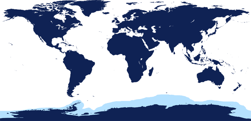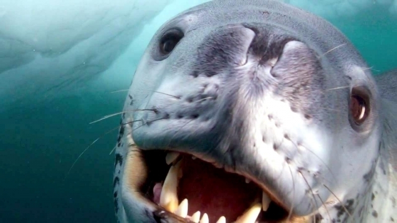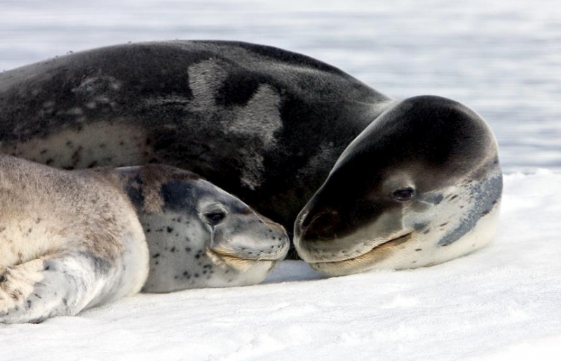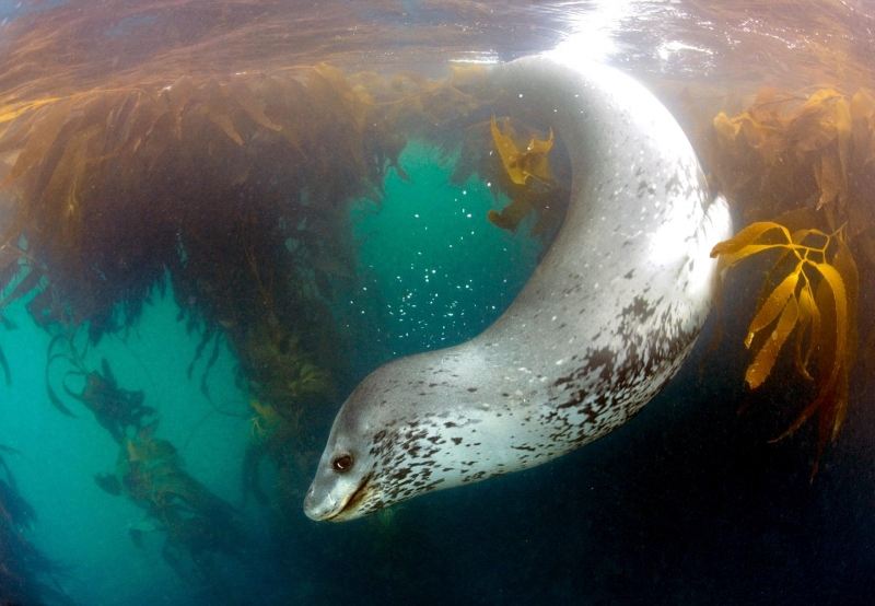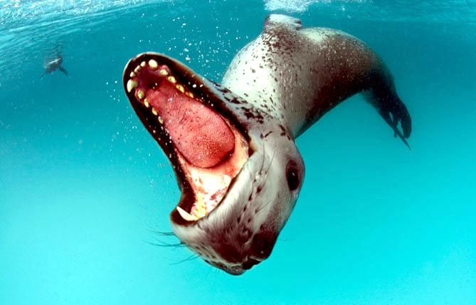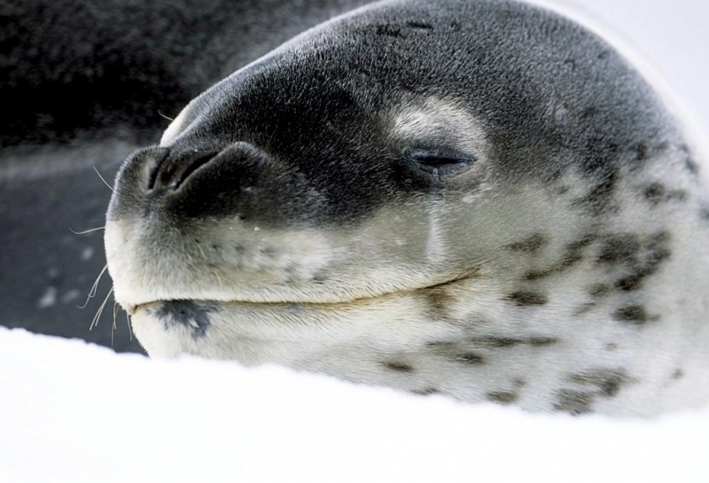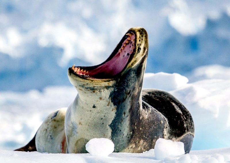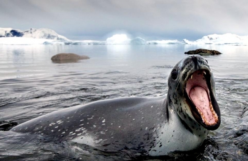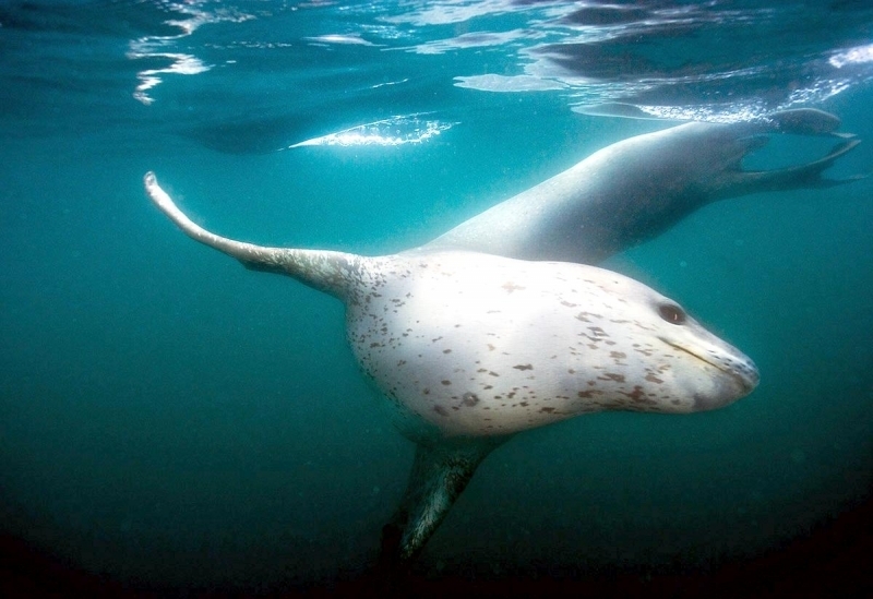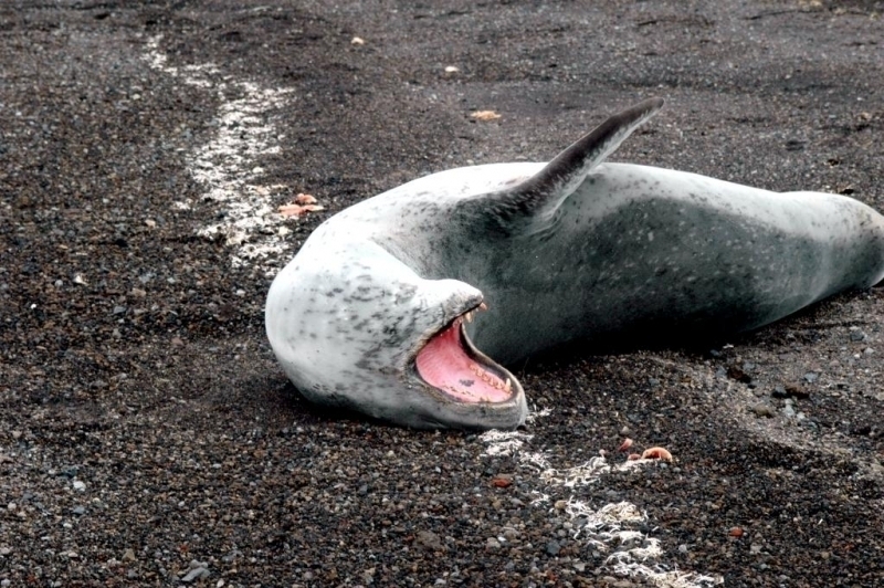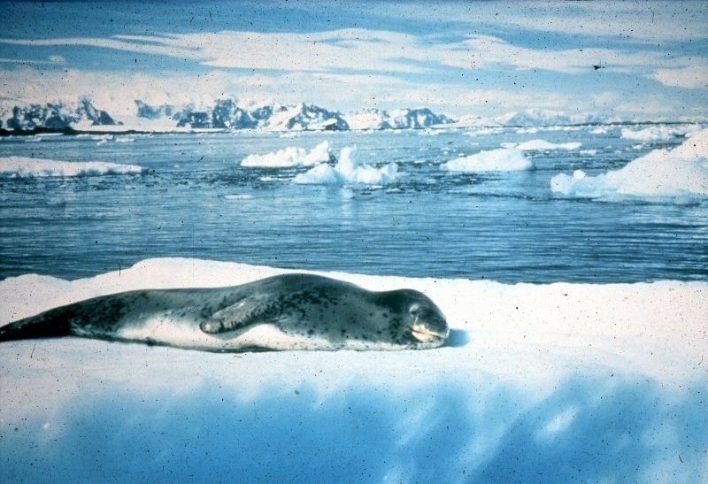 Leopard Seals are large & impressive members of the seal family reaching between 2.41-3.38 meters in length and weighing between 200-591 kilograms. Females are slightly larger than males. Their massive bodies have large heads and long broad fore-flippers. Unlike other seal species that swim by moving their hind limbs side to side, Leopard Seals swim gracefully using long, powerful, simultaneous strokes of the forelimbs simultaneously. Adults are dark gray to black in color with varying dark spots on their dorsal (upper) side and pale on their ventral (under) side. Pup’s have soft, thick coats with a dorsal stripe and black spots on the light gray ventral side. Adults have well-developed canine teeth and 3 tubercles or lobes on the sides of their jaws that allow them to filter krill from the water. Leopard Seals are wide-ranging found in the Atlantic and Pacific oceans and in the polar & sub-polar waters of the Southern Hemisphere along the coast of Antarctica and on many sub-Antarctic islands. They’ve also been seen on the South African & South Australian coasts around Tasmania, Lord Howe Island, the Cook Islands and Tierra del Fuego. Adults are found on the outer fringes of ice pack. The young are found around sub-Antarctic islands.