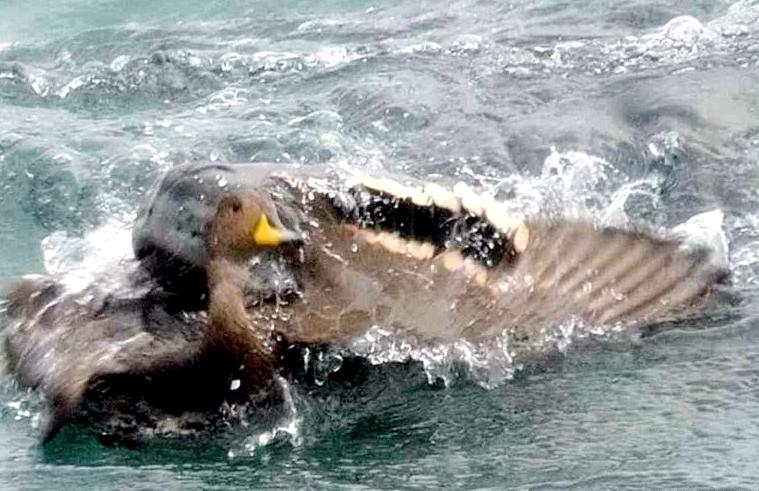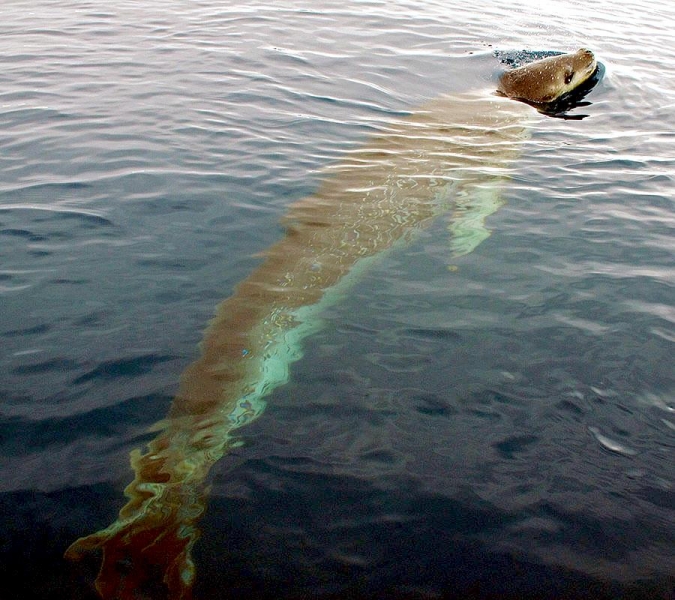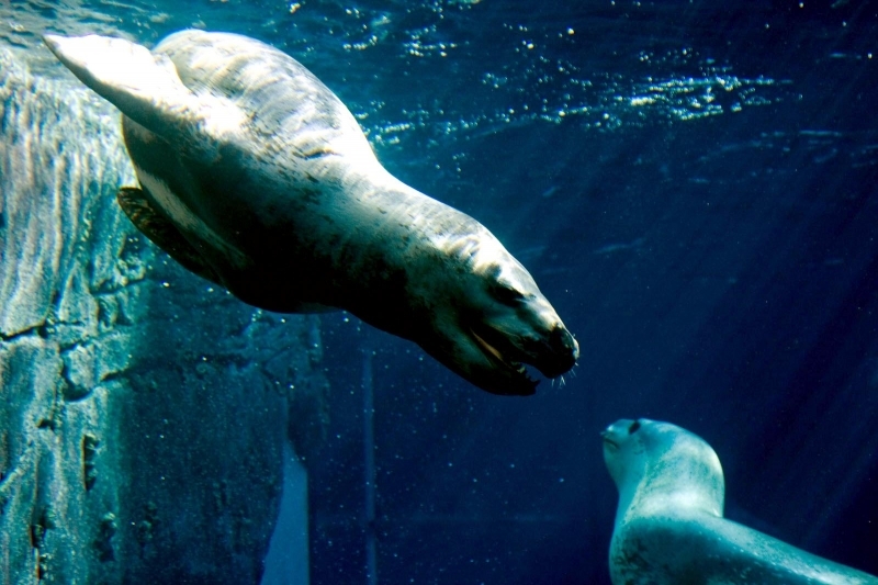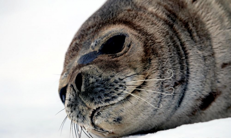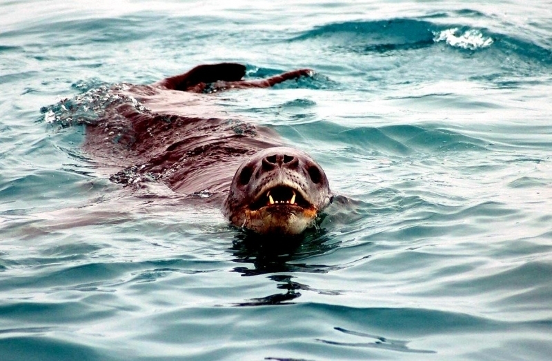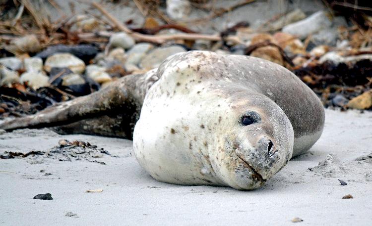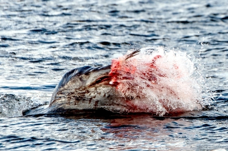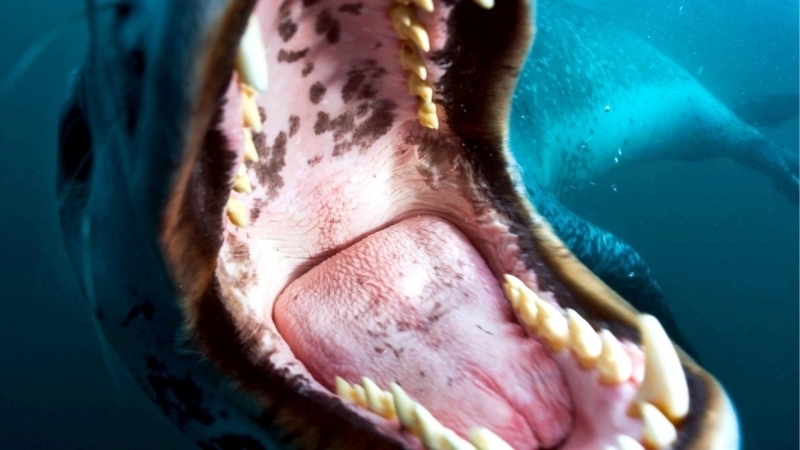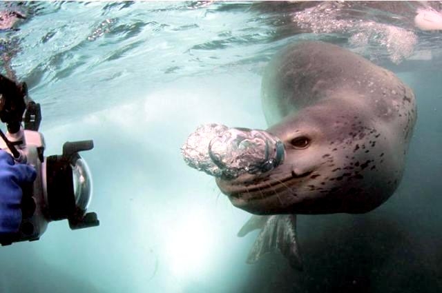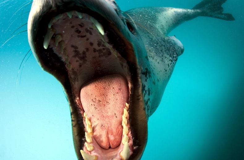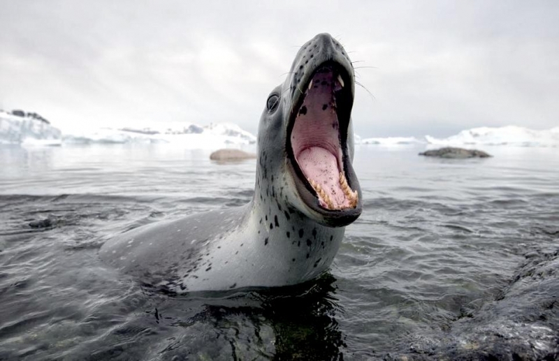 Leopard Seals are large & impressive members of the seal family reaching between 2.41-3.38 meters in length and weighing between 200-591 kilograms. Females are slightly larger than males. Their massive bodies have large heads and long broad fore-flippers. Unlike other seal species that swim by moving their hind limbs side to side, Leopard Seals swim gracefully using long, powerful, simultaneous strokes of the forelimbs simultaneously. Adults are dark gray to black in color with varying dark spots on their dorsal (upper) side and pale on their ventral (under) side. Pup’s have soft, thick coats with a dorsal stripe and black spots on the light gray ventral side. Adults have well-developed canine teeth and 3 tubercles or lobes on the sides of their jaws that allow them to filter krill from the water. Leopard Seals are wide-ranging found in the Atlantic and Pacific oceans and in the polar & sub-polar waters of the Southern Hemisphere along the coast of Antarctica and on many sub-Antarctic islands. They’ve also been seen on the South African & South Australian coasts around Tasmania, Lord Howe Island, the Cook Islands and Tierra del Fuego. Adults are found on the outer fringes of ice pack. The young are found around sub-Antarctic islands.