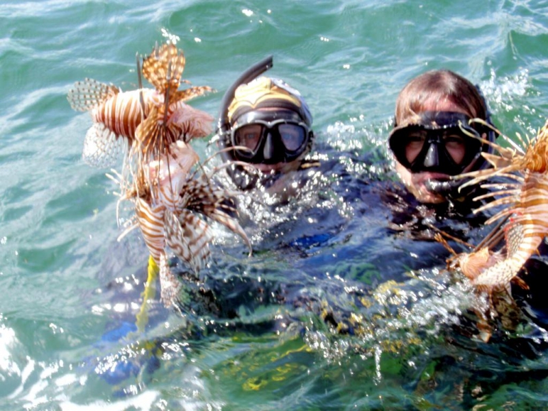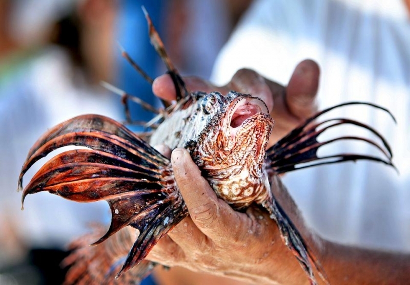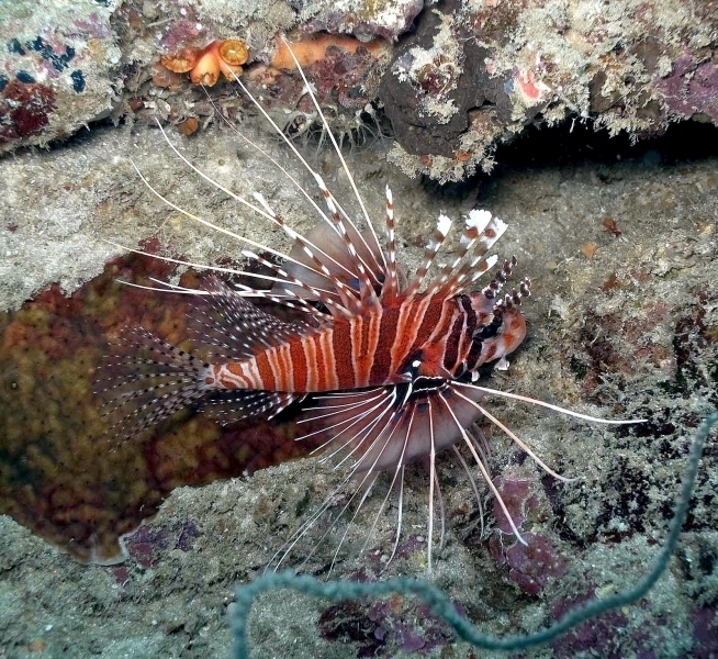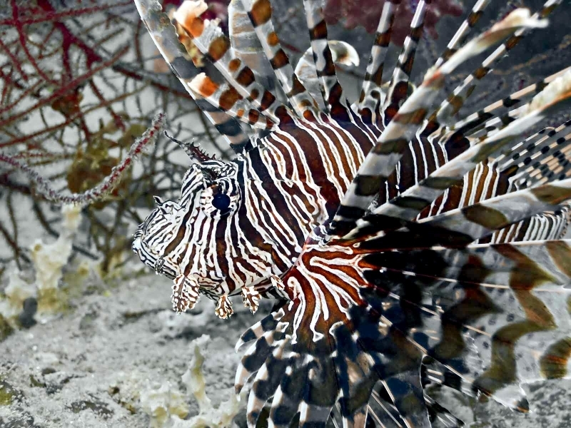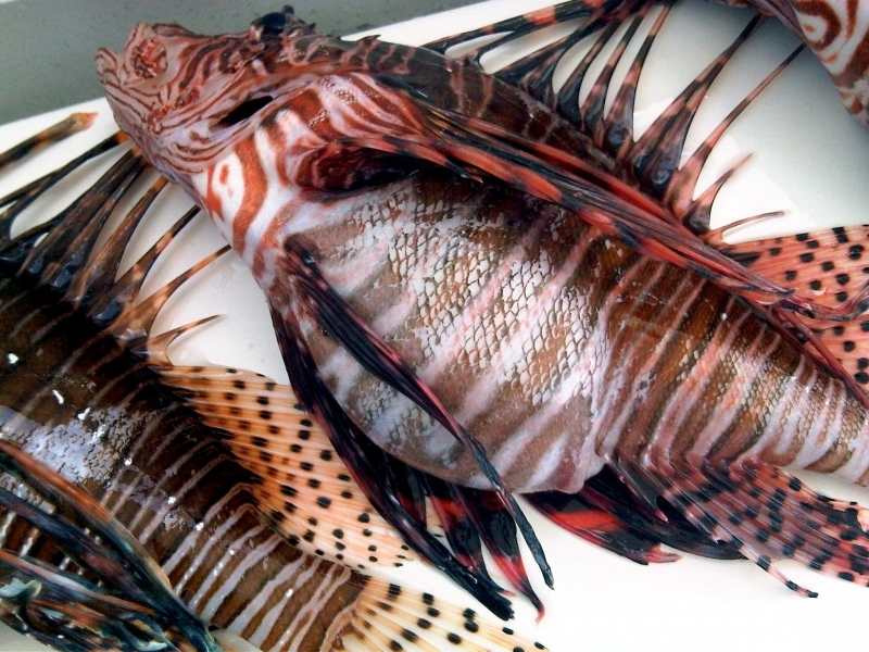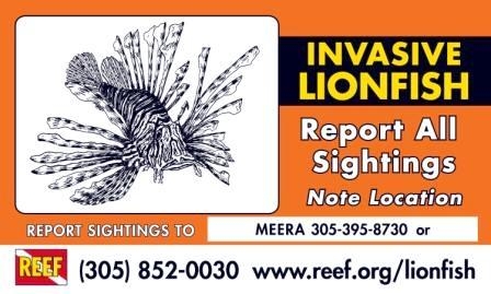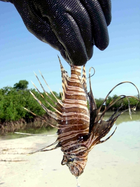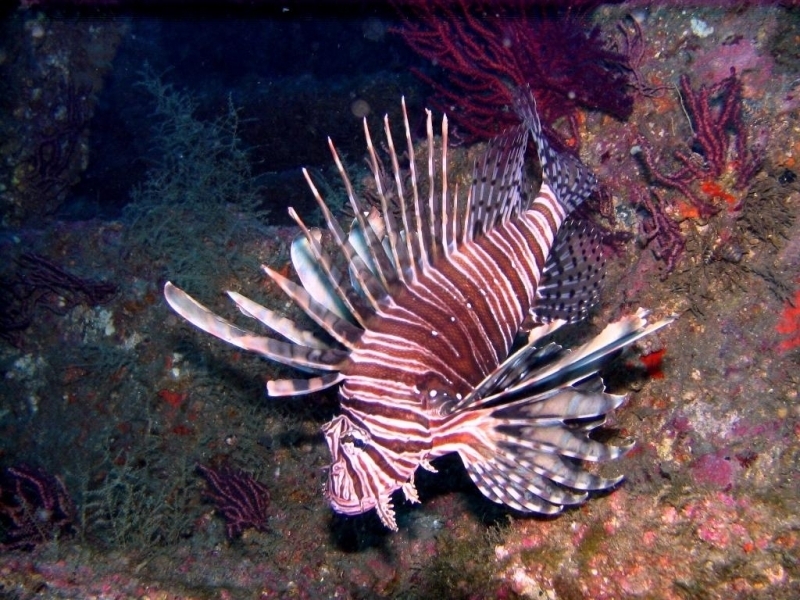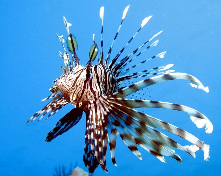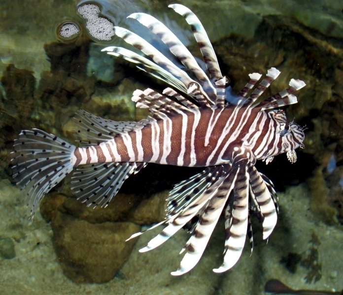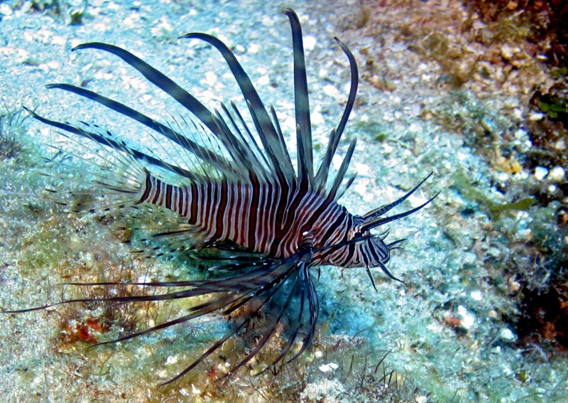Lionfish have distinctive brown or maroon and white stripes or bands covering the head and body. They have fleshy tentacles above their eyes and below the mouth; fan-like pectoral fins; long, separated dorsal spines; 13 dorsal spines; 10-11 dorsal soft rays; 3 anal spines; and 6-7 anal soft rays. An adult Lionfish can grow as large as 18 inches, while juveniles may be as small as 1 inch or less. Lionfish have cycloid scales. The range of the Lionfish covers a very large area from western Australia and Malaysia east to French Polynesia and the United Kingdom’s Pitcairn Islands, north to southern Japan and southern Korea and south to Lord Howe Island off the east coast of Australia and the Kermadec Islands of New Zealand. In between, the species is found throughout Micronesia. Lionfish have been collected along the southeastern United States coast from Florida to North Carolina. Juveniles have been collected in waters off Long Island, New York and Bermuda. Lionfish are a popular marine ornamental fish and were possibly intentionally released into the Atlantic. Since Lionfish are not native to Atlantic waters, they have very few predators. They are carnivores that feed on small crustaceans and fish, including the young of important commercial fish species such as Snapper and Grouper. Unfortunately, NOAA researchers have concluded that invasive Lionfish populations will continue to grow and cannot be eliminated using conventional methods and the fish has now been discovered off the coast of Brazil. Marine invaders are nearly impossible to eradicate once established. The first Lionfish was reported in South Florida waters in 1985 with many additional sightings occurring until they were documented as established in the early 2000’s.