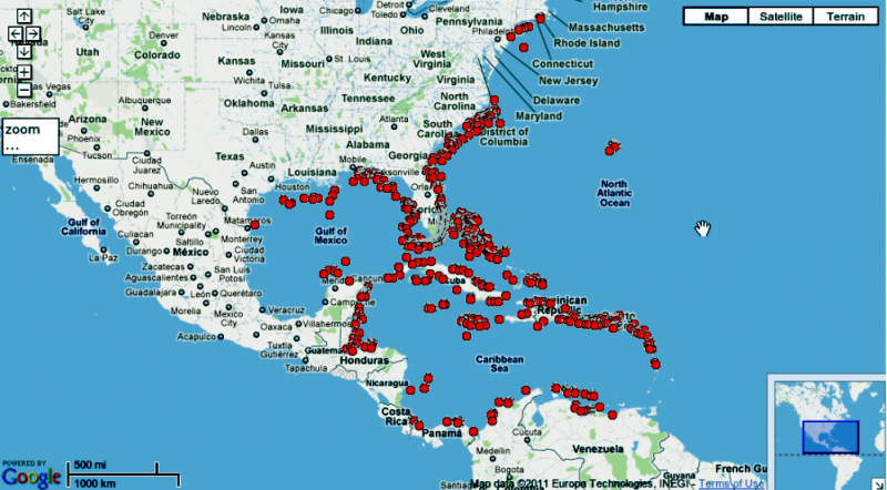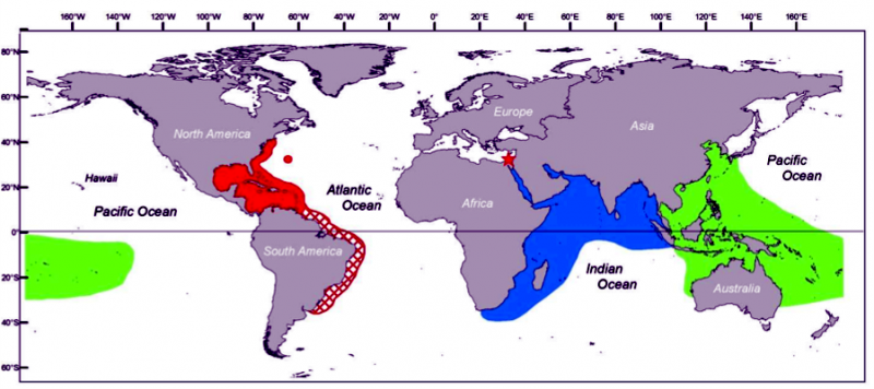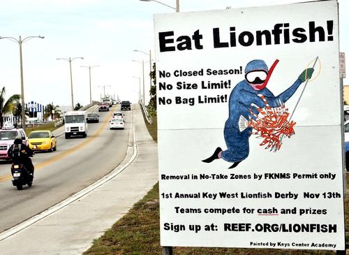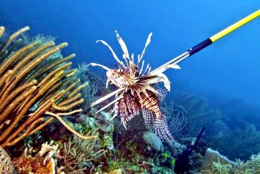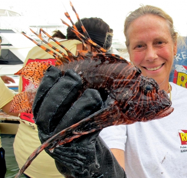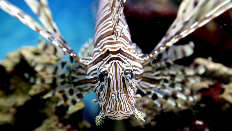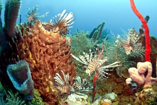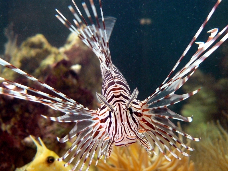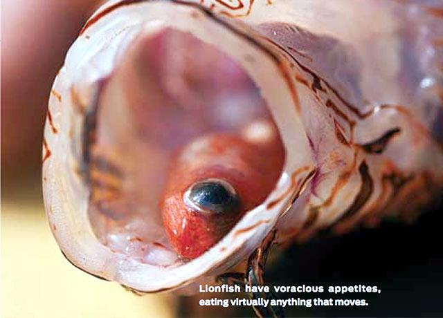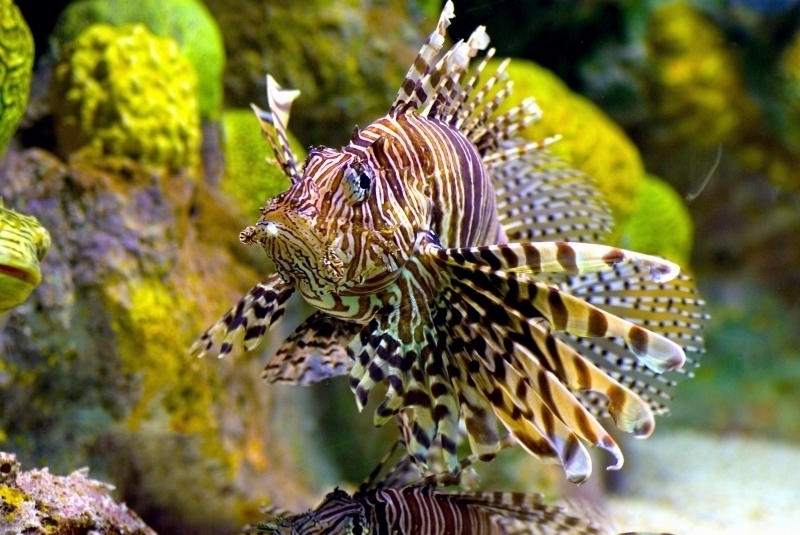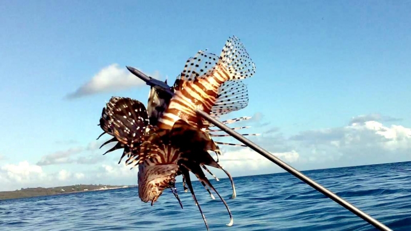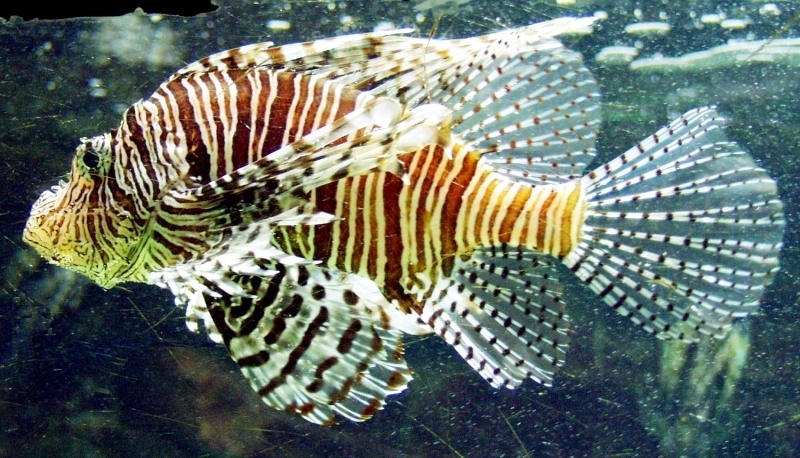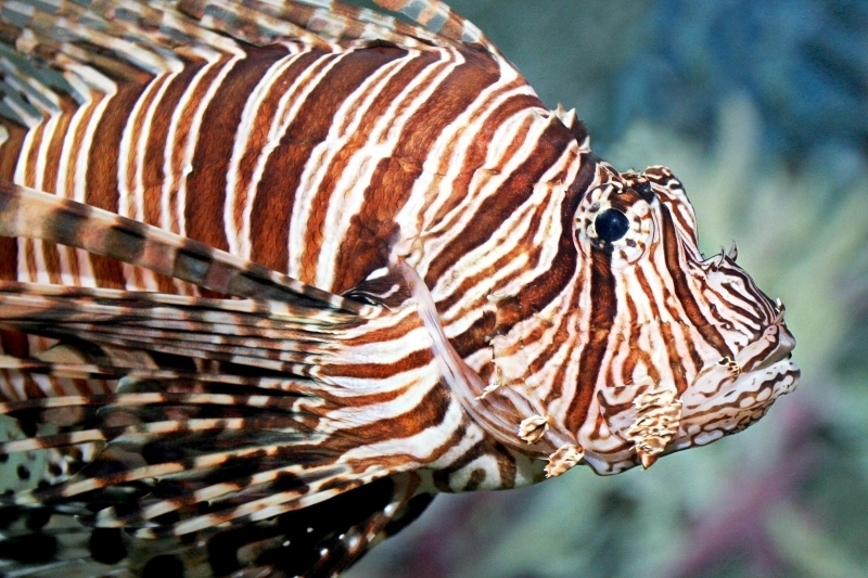 Lionfish have distinctive brown or maroon and white stripes or bands covering the head and body. They have fleshy tentacles above their eyes and below the mouth; fan-like pectoral fins; long, separated dorsal spines; 13 dorsal spines; 10-11 dorsal soft rays; 3 anal spines; and 6-7 anal soft rays. An adult Lionfish can grow as large as 18 inches, while juveniles may be as small as 1 inch or less. Lionfish have cycloid scales. The range of the Lionfish covers a very large area from western Australia and Malaysia east to French Polynesia and the United Kingdom’s Pitcairn Islands, north to southern Japan and southern Korea and south to Lord Howe Island off the east coast of Australia and the Kermadec Islands of New Zealand. In between, the species is found throughout Micronesia. Lionfish have been collected along the southeastern United States coast from Florida to North Carolina. Juveniles have been collected in waters off Long Island, New York and Bermuda. Lionfish are a popular marine ornamental fish and were possibly intentionally released into the Atlantic. Since Lionfish are not native to Atlantic waters, they have very few predators. They are carnivores that feed on small crustaceans and fish, including the young of important commercial fish species such as Snapper and Grouper. Unfortunately, NOAA researchers have concluded that invasive Lionfish populations will continue to grow and cannot be eliminated using conventional methods and the fish has now been discovered off the coast of Brazil. Marine invaders are nearly impossible to eradicate once established. The first Lionfish was reported in South Florida waters in 1985 with many additional sightings occurring until they were documented as established in the early 2000’s.