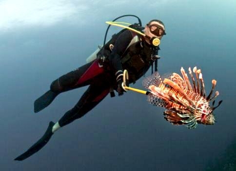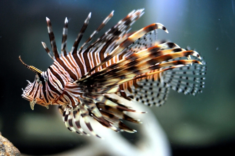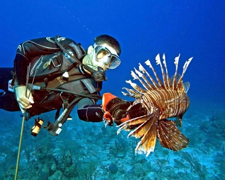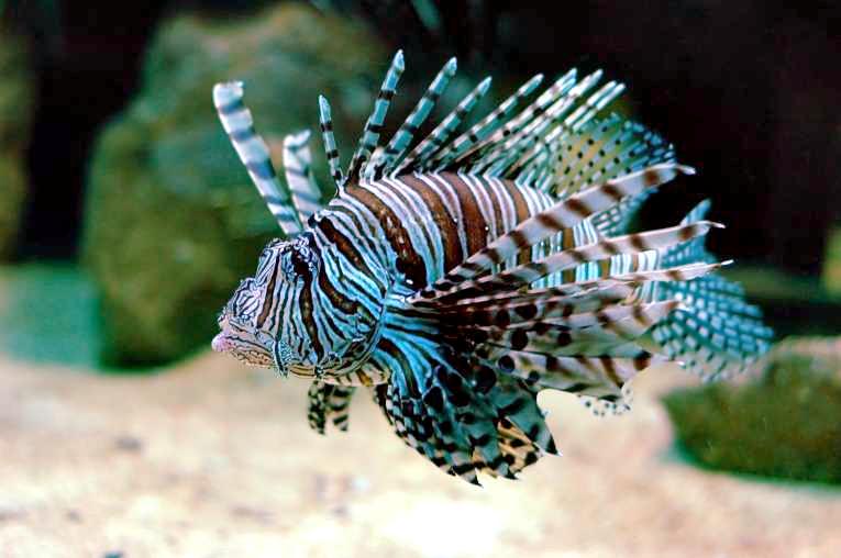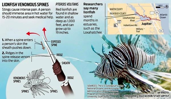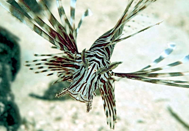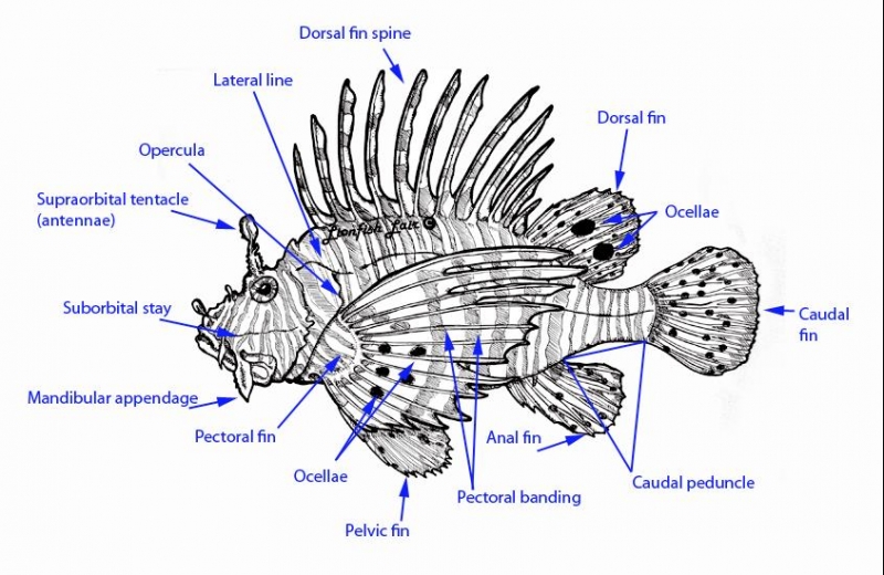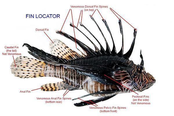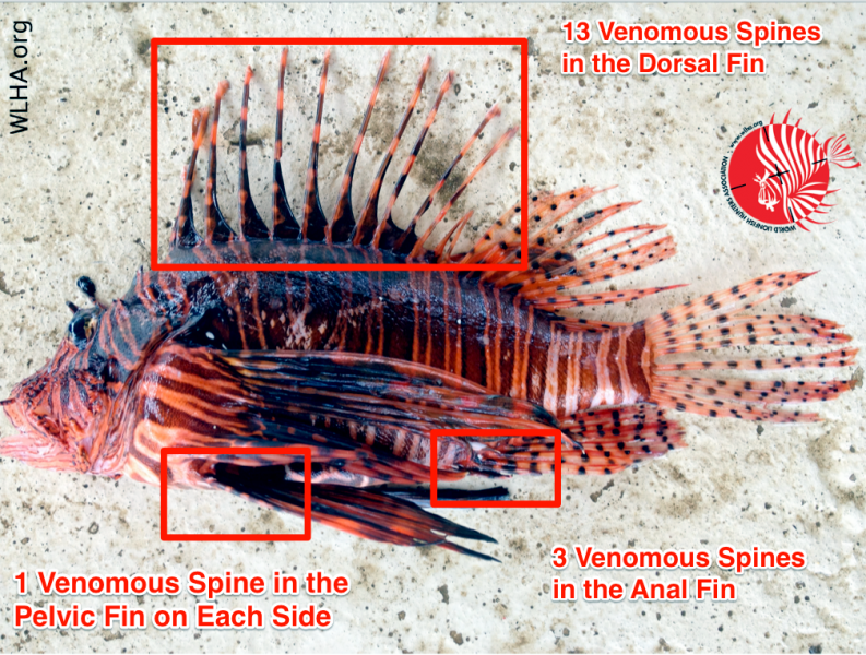 After the spine punctures the skin, the venom (a combination of protein & a toxin combining a neurotransmitter called acetylcholine) enters the wound when exposed to the venom glands within the grooves of the spine. If you are stung by a Lionfish, seek medical attention immediately. Lionfish are found in mostly all marine habitat types found in warm marine waters of the world tropics with heavy infestations in the Caribbean region. They have been found in water depths from 2 to 1,000 feet on hard bottom, mangrove, sea grass, coral and artificial reefs like shipwrecks. Lionfish are slow-moving & conspicuous, so they must rely on their unusual coloration and fins to discourage would-be predators from eating them. Lionfish are now one of the top predators in many coral reef environments of the Atlantic consuming over 50 species of fish including some economically & ecologically important species. Lionfish are active hunters who ambush their prey by using their outstretched, fan-like pectoral fins to slowly pursue and “corner” them. Lionfish are thought to be nocturnal hunters, but they have been found with full stomachs during the day in the Atlantic. They move about by slowly undulating the soft rays of the dorsal and anal fins. During the day, they sometimes retreat to ledges & crevices among the rocks and corals. Lionfish are often seen moving about during the day both alone and in small groups. Although Lionfish have been used as a food source in their native range economically, they are far more important in the aquarium trade and are a very popular aquarium addition. Lionfish are also native to the warm, tropical waters of the South Pacific & Indian oceans including the Red Sea. The spines of this species deliver a venomous sting that can last for days and cause extreme pain, sweating, respiratory distress and even paralysis. Lionfish venom glands are located within 2 grooves of the spine.