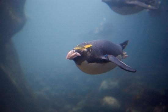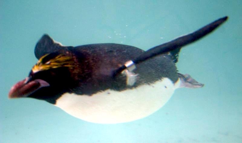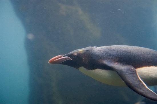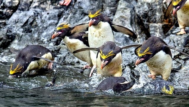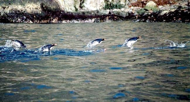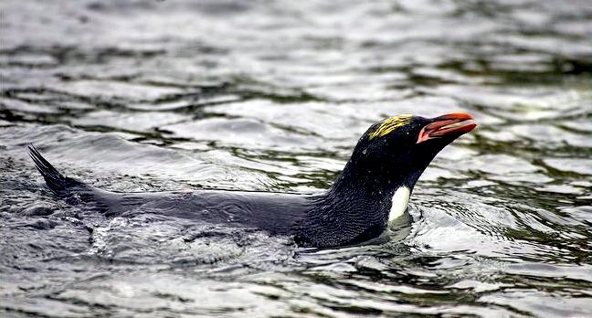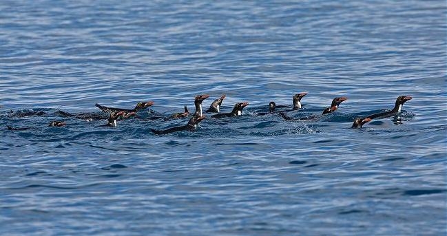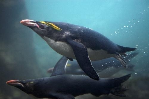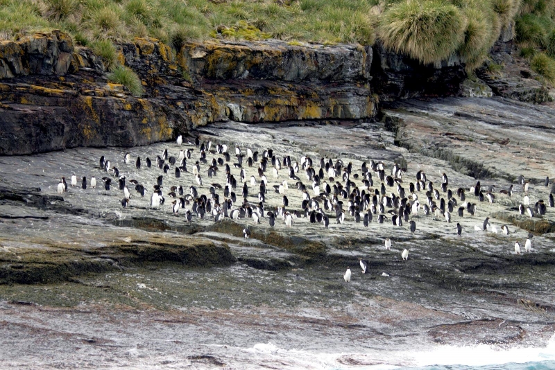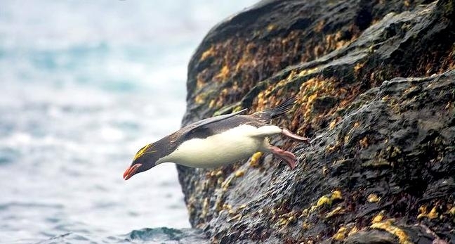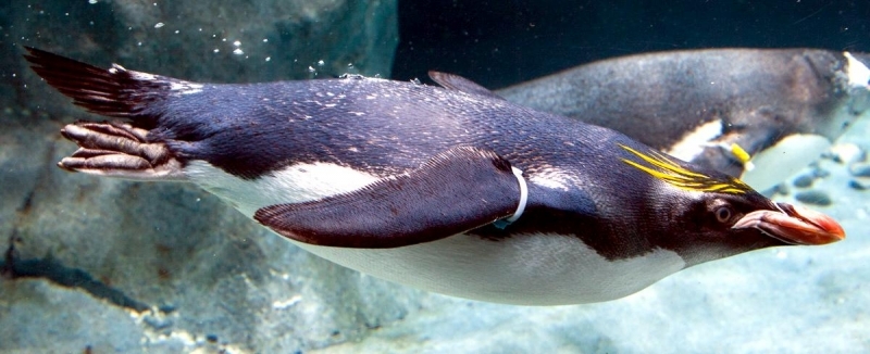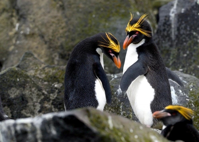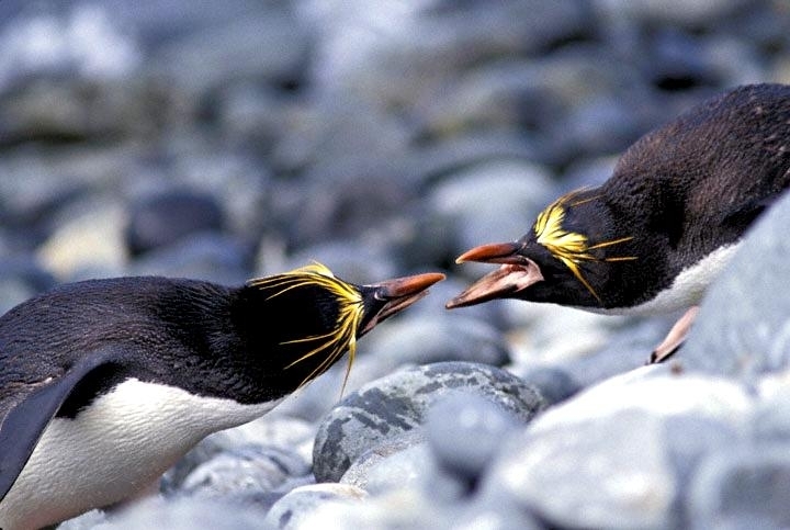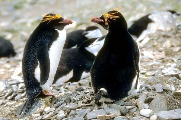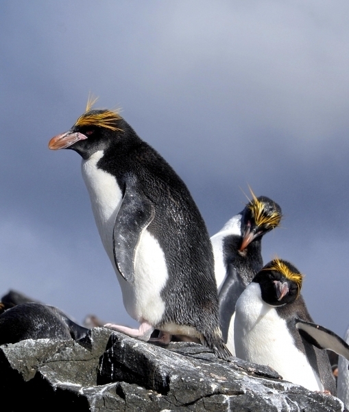 Macaroni Penguins have a circumpolar range and at least 50 known breeding sites are found on sub-Antarctic islands in the South Atlantic and southern Indian Oceans. One Macaroni Penguin breeding site has been identified on the Antarctic Peninsula. The primary breeding colonies or rookeries, are found on the islands of Crozet, Heard, Keruguelen, McDonald and South Georgia, however the South Georgia populations have decreased dramatically over the past 20 years. Breeding colonies are commonly found on rocky slopes. Little is known about the range of this species outside breeding season, however scientists believe Macaroni Penguins remain in the open ocean. They forage during the day on krill and small fish. Dives have been recorded at average depths of around 15-70 meters for about 2-3 minutes, although some have been observed diving to 100 meters. Southern Sea Lions and Killer Whales are known predators of this species at sea and Skuas and other seabirds are known to take eggs and chicks.