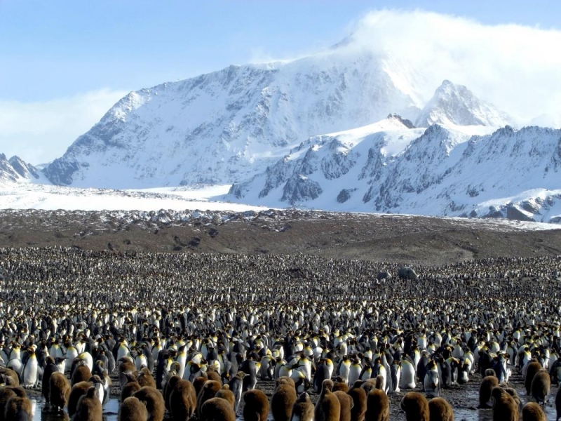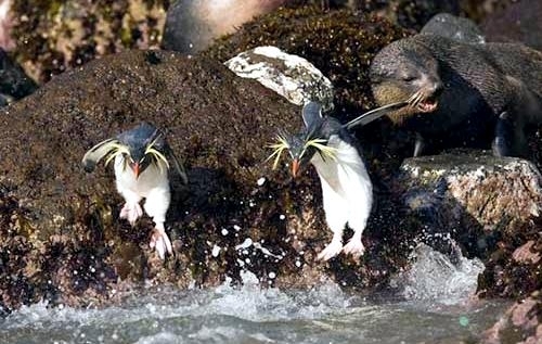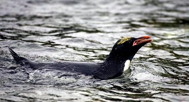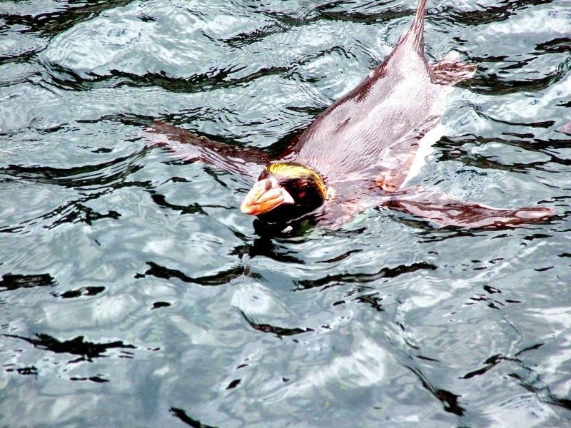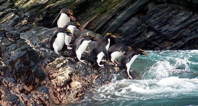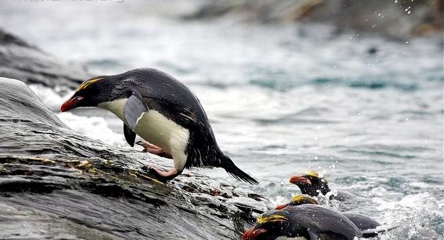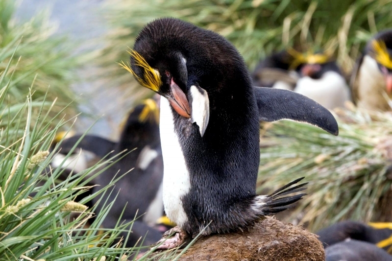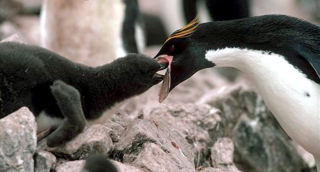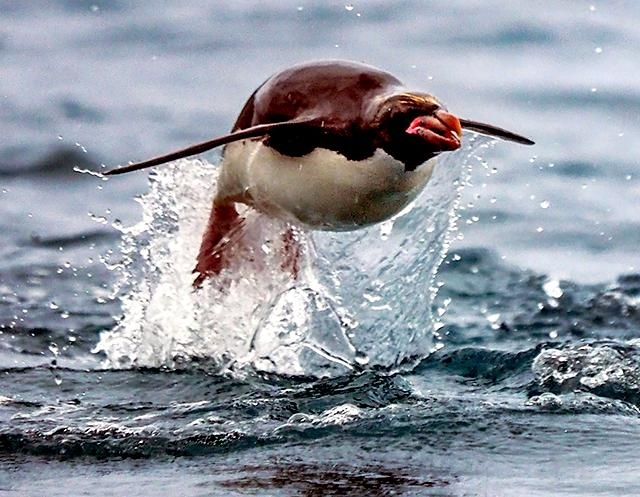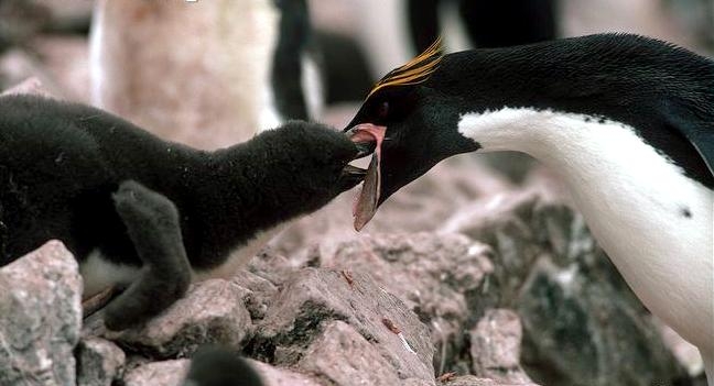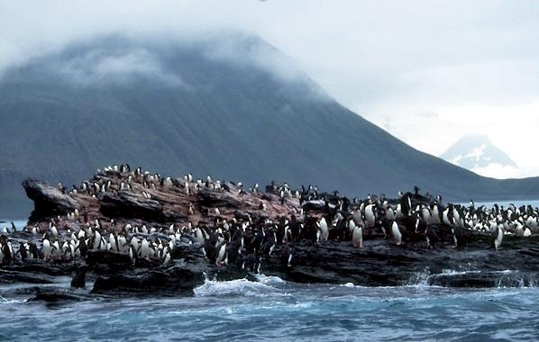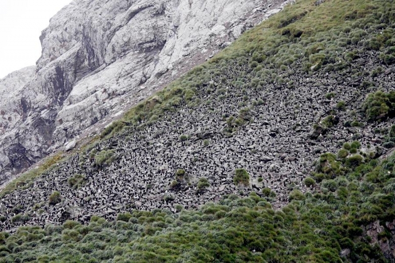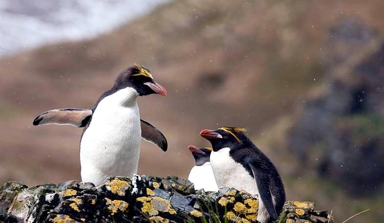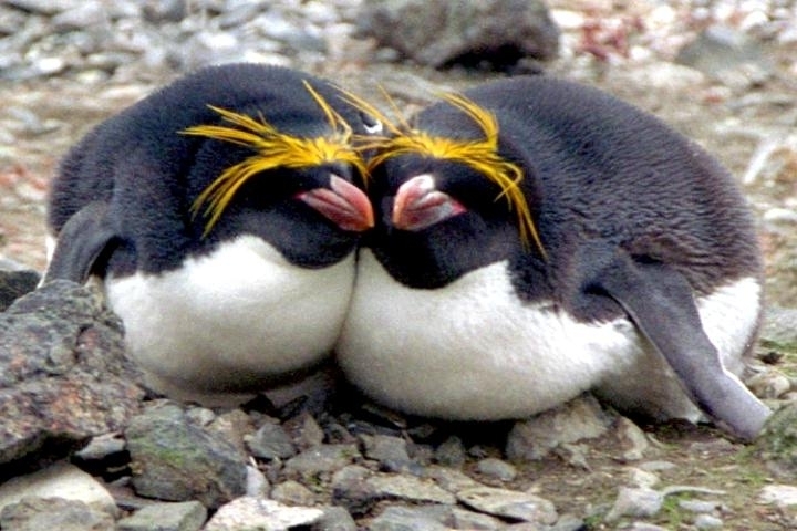 Macaroni Penguins have a circumpolar range and at least 50 known breeding sites are found on sub-Antarctic islands in the South Atlantic and southern Indian Oceans. One Macaroni Penguin breeding site has been identified on the Antarctic Peninsula. The primary breeding colonies or rookeries, are found on the islands of Crozet, Heard, Keruguelen, McDonald and South Georgia, however the South Georgia populations have decreased dramatically over the past 20 years. Breeding colonies are commonly found on rocky slopes. Little is known about the range of this species outside breeding season, however scientists believe Macaroni Penguins remain in the open ocean. They forage during the day on krill and small fish. Dives have been recorded at average depths of around 15-70 meters for about 2-3 minutes, although some have been observed diving to 100 meters. Southern Sea Lions and Killer Whales are known predators of this species at sea and Skuas and other seabirds are known to take eggs and chicks.