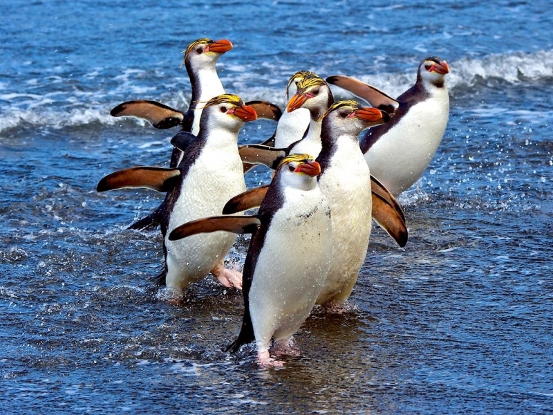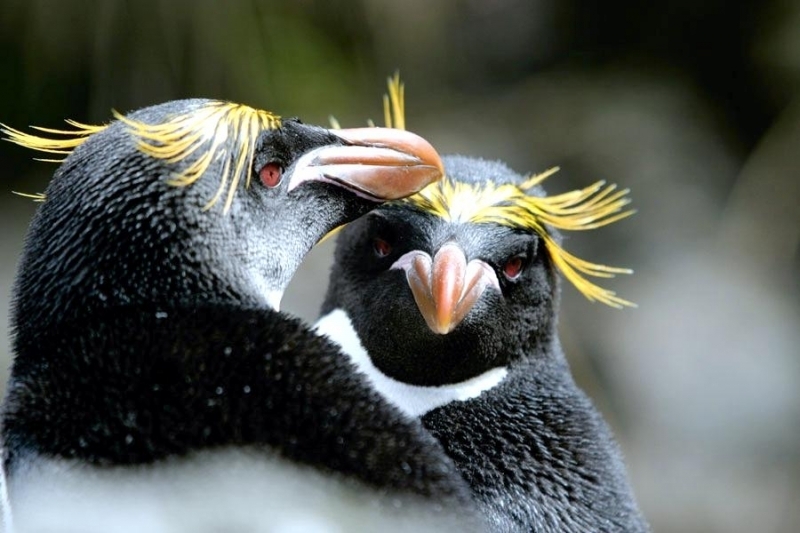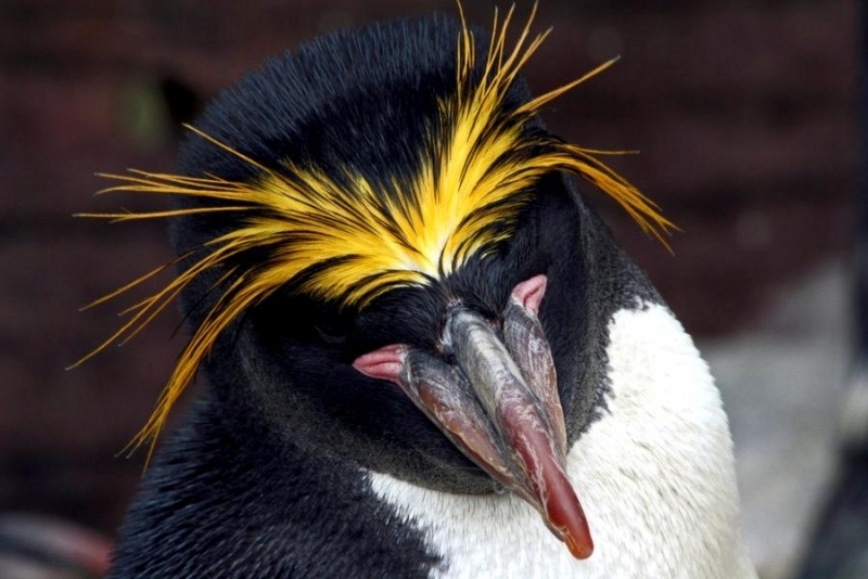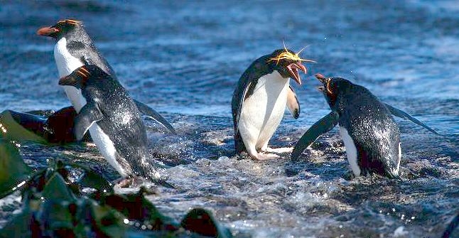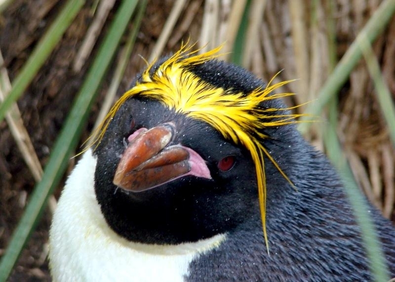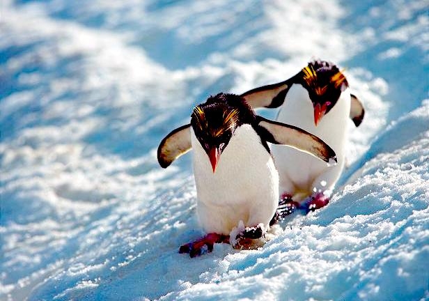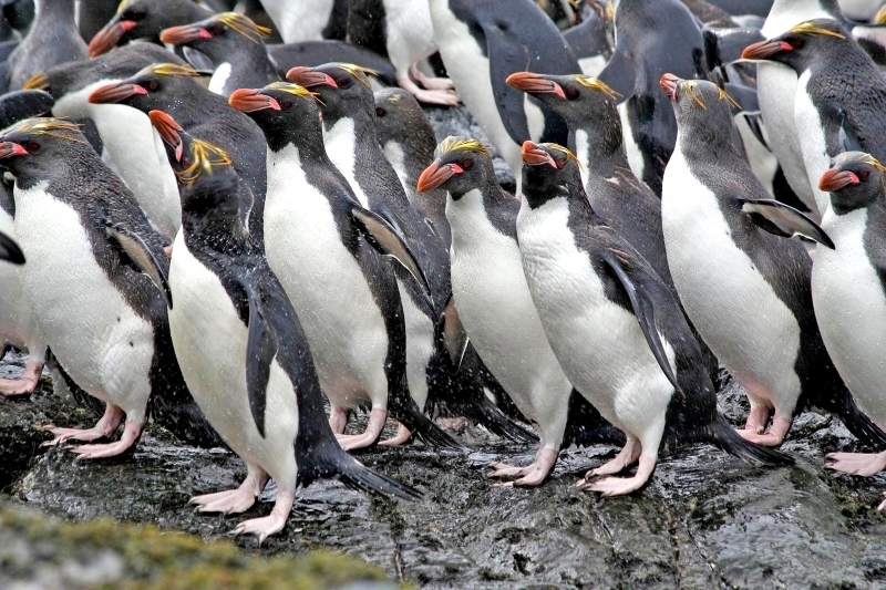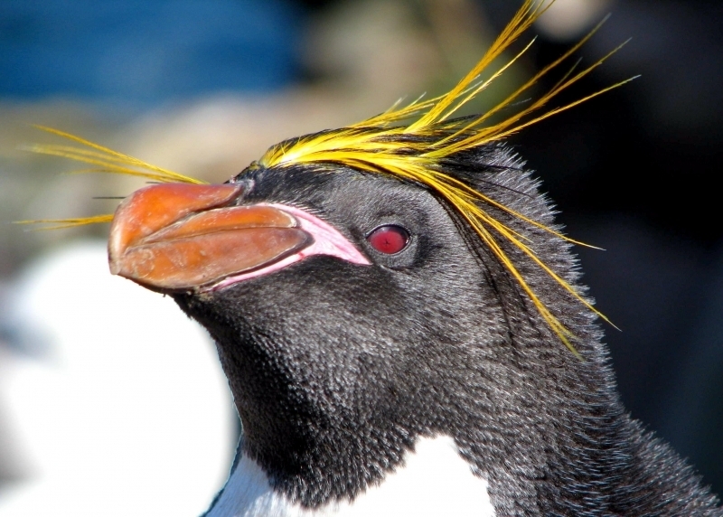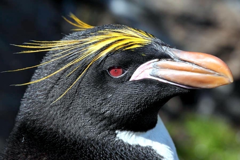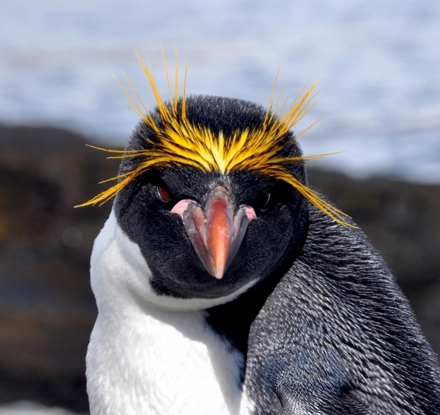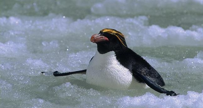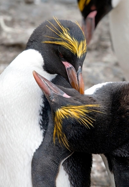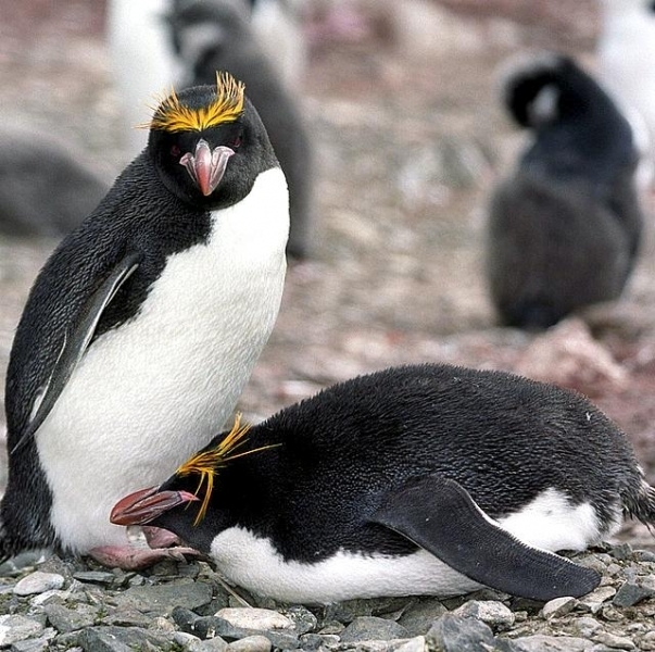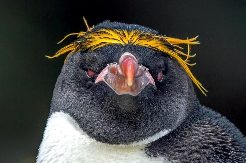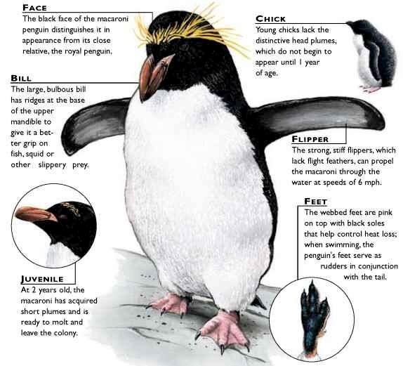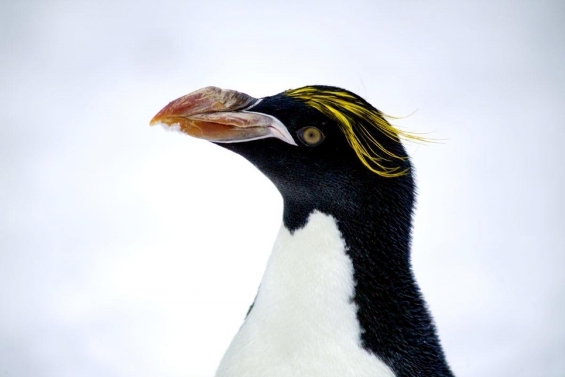 Macaroni Penguins are wonderful rather large, crested penguins with yellow plumes of feathers rising from their foreheads, extending back along the crown of their heads and down behind their eyes. The Macaroni Penguin was named by English explorers. In the mid-18th century, a young man who wore flashy feathers in his hat was called a “Macaroni”. The English explorers thought the yellow-crest feathers of this penguin looked just like the flashy young man. The word Penguin first appears in the 16th century as a synonym for the now extinct Great Auk. When European explorers discovered what are today known as Penguins in the Southern Hemisphere, they noticed their similar appearance to the Great Auk of the Northern Hemisphere and named them after this bird, although they are not closely related. Their backs, heads, chins, throats and chests are black; their bellies are white and their flippers are black on the dorsal (upper) sides and white on the ventral (under) sides. Macaroni Penguins have large orange bills, red eyes and pink feet. Juveniles do not have the head plumes of adults and their bills are smaller & darker. They average about 70 centimeters tall and weigh about 5.5 kilograms. Macaroni Penguins are the most common and abundant penguin species with an estimated global population of about 9,000,000 breeding pairs.