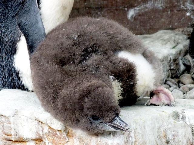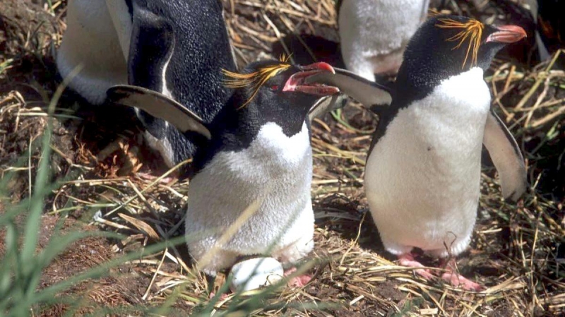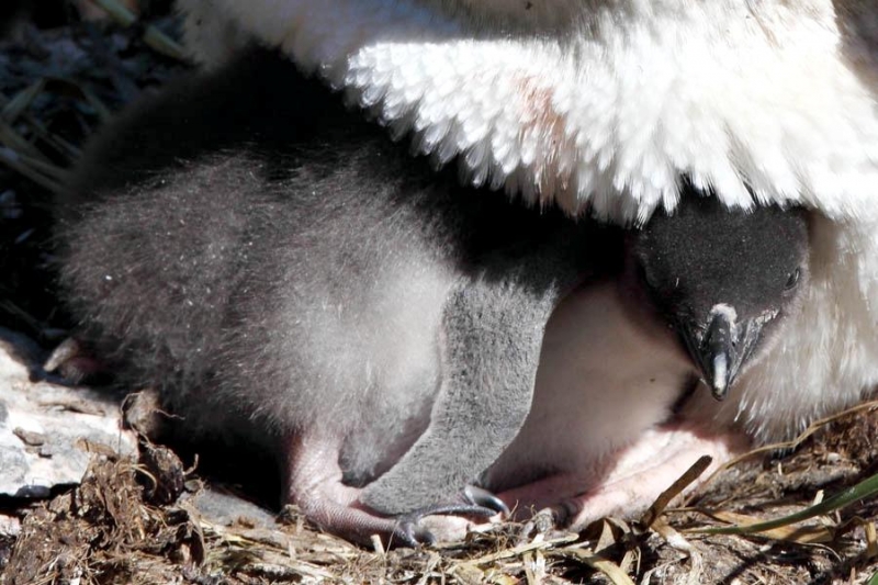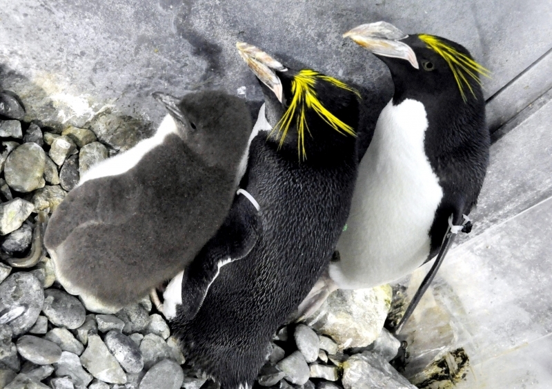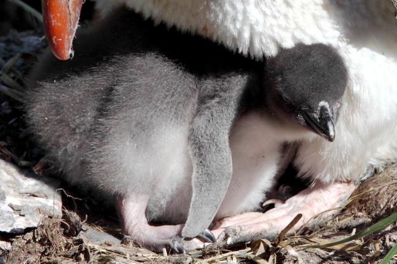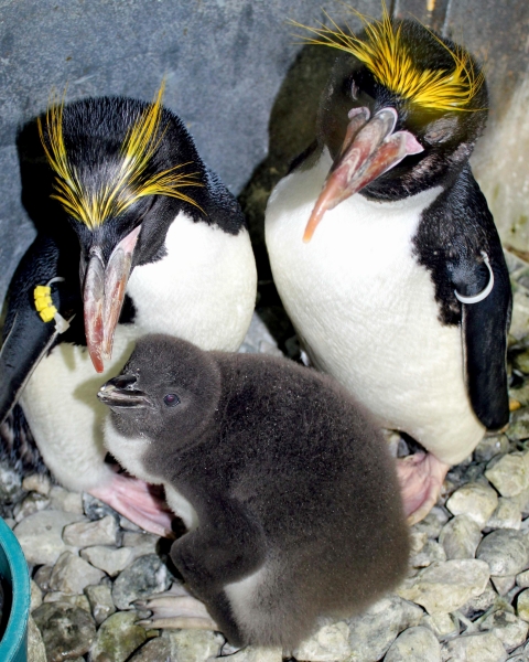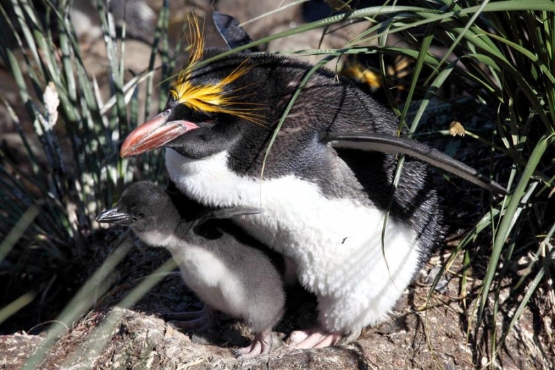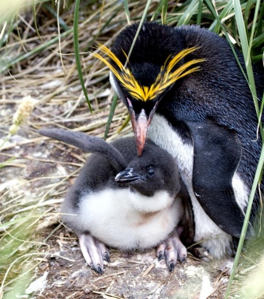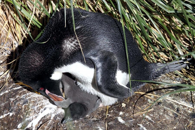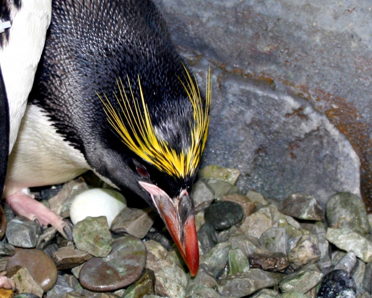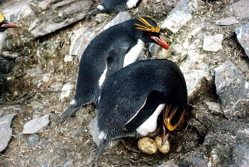 Male Macaroni Penguins reach sexual maturity at 5 years for males and 6 for females. Males return to the breeding colonies each year in October and November, followed by the females a short time later. Like other penguin species, Macaronis are monogamous and pairs reunite at their nest location, identifying each other through their distinctive calls. Mating behavior includes the ‘ecstatic display’ where the pairs swing their heads from side to side. Nests are shallow burrows in the ground lined with grass. Females lay 2 eggs, the 2nd of which is typically the larger egg chosen for incubation by both parents, which lasts for about 37 days. Macaroni Penguins alternate incubation in 3 shifts; the first lasts 8-12 days and is shared by the parents. The second lasts about 2 weeks and is taken by the female while the male forages at sea. The final shift lasts between 9-11 days and is taken by the male while the female forages at sea. Newly-hatched Macaroni Penguin chicks are brooded by the male for about 3 weeks and the female forages and feeds the chicks daily with regurgitated food. When the chicks develop their adult plumage, they leave the nest and form small crèches (groups of chicks) while both parents forage. Most chicks fledged at about 2 months of age when they have developed their waterproof plumage.