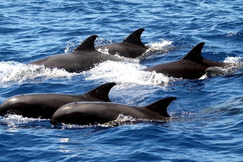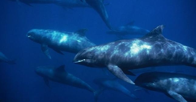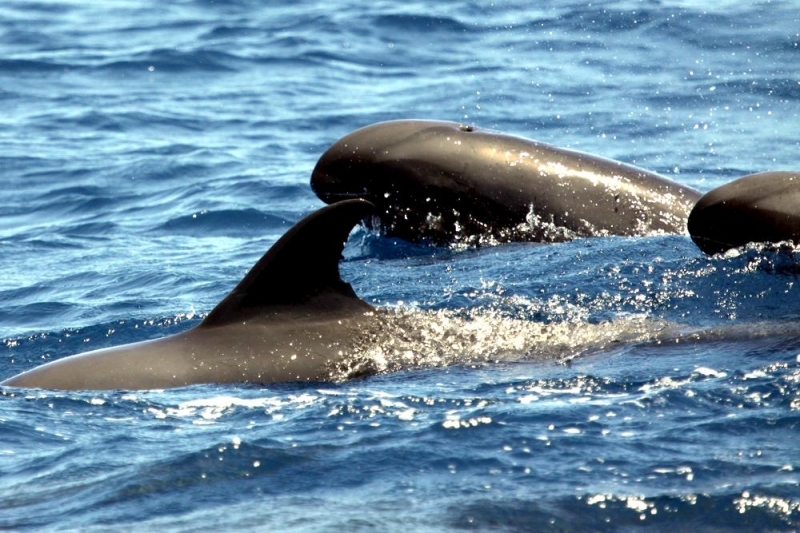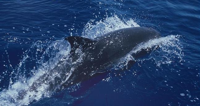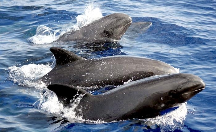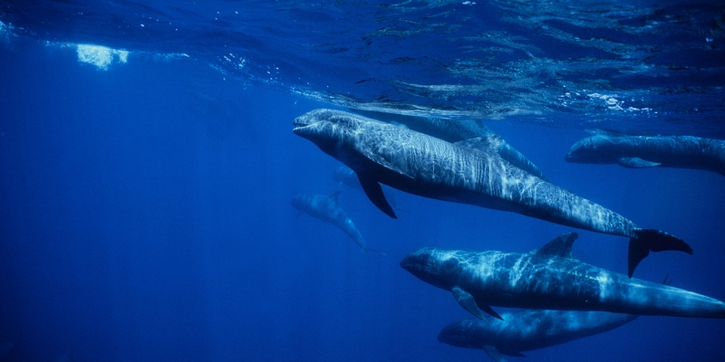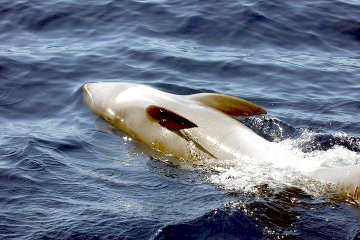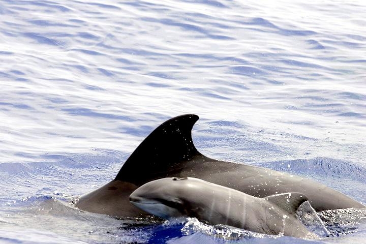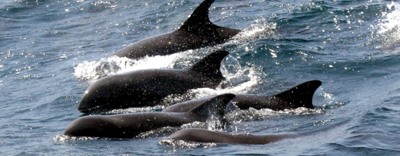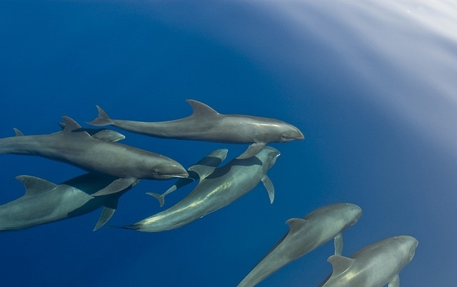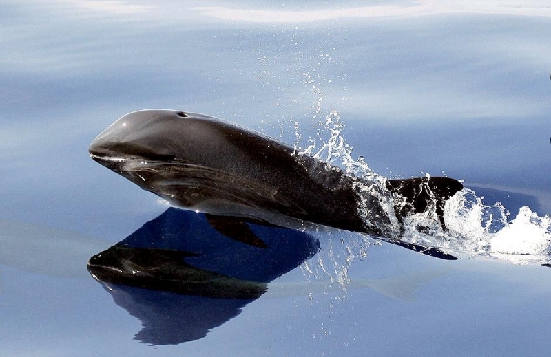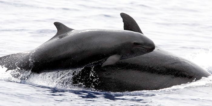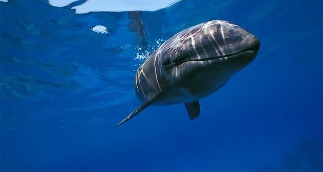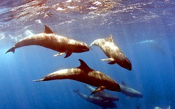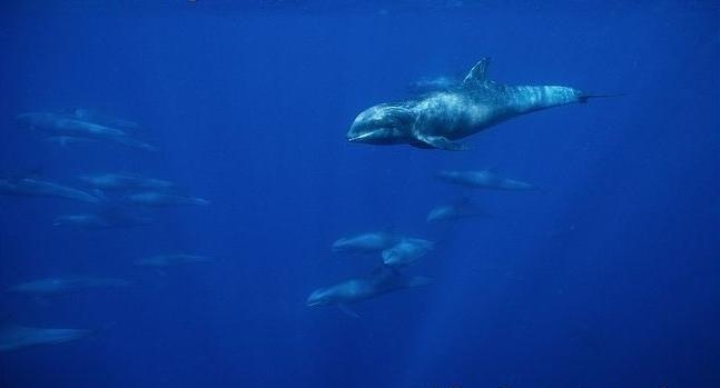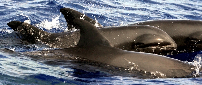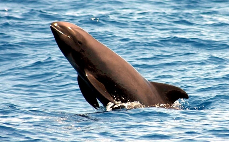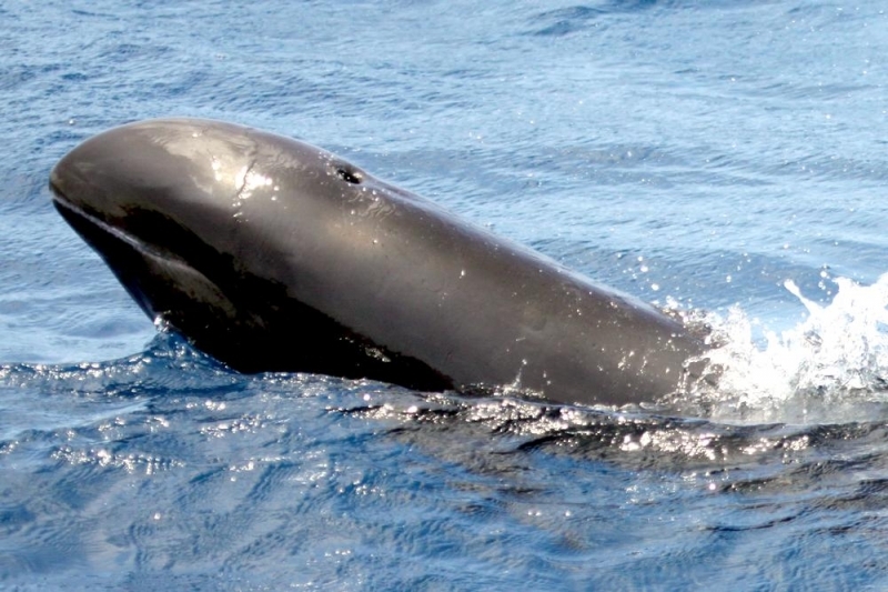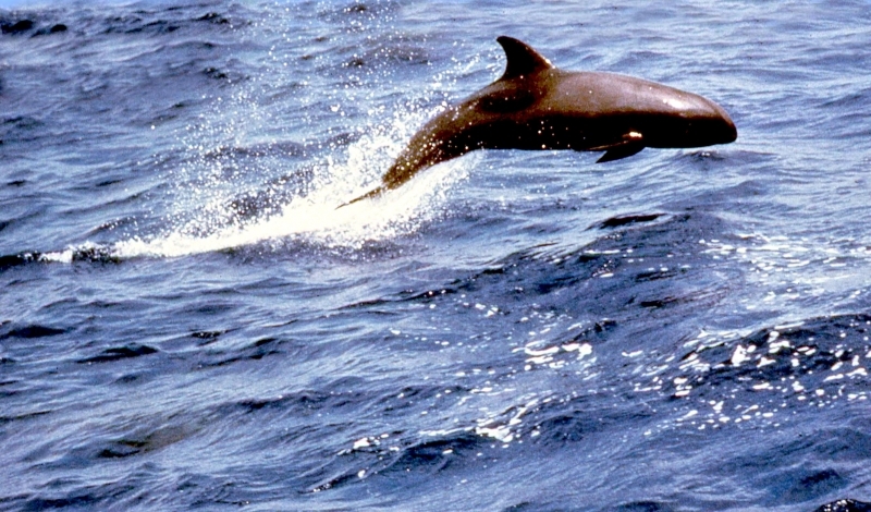 They are dark gray to black in color with white to light gray coloring on their ventral (under) side and like the Pygmy Killer Whale, white lips. The black triangular “mask” on the face distinguishes them from the more uniformly colored Pygmy Killer Whales. Melon-headed Whales also have a cape that dips much lower below the dorsal fin than that of Pygmy Killer Whales, although its margin is often faint. Melon-headed Whales are a social species. In the tropical Atlantic, Pacific & Indian oceans, they have been reported traveling with Fraser’s, Spinner and Spotted Dolphins. Melon-headed Whales are found in tropical & subtropical waters worldwide, most commonly in the Philippine Sea. They favor warm, pelagic waters. Melon-headed Whales travel in pods of 100-1,000, although even larger pods have also been reported. Melon-headed Whales feed primarily on squid & fish. The calving season of the Melon-headed Whale is thought to occur in early spring in the lower latitudes of both hemispheres. Little else is known about the reproductive behavior of this species.