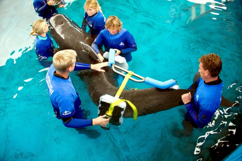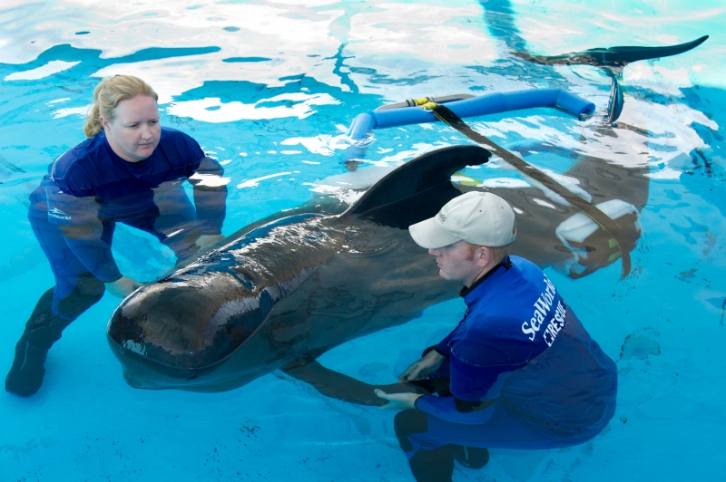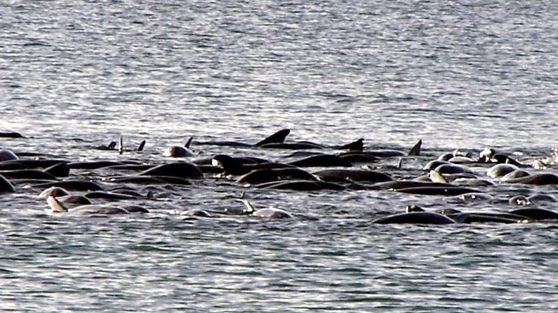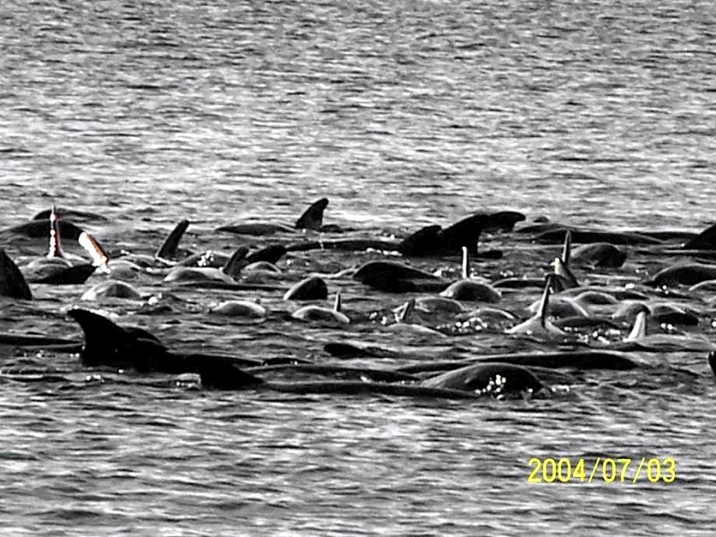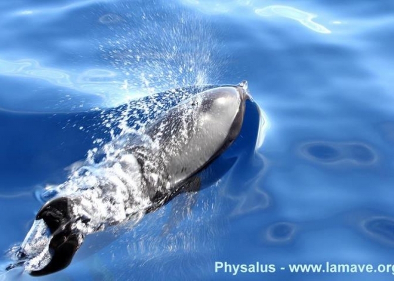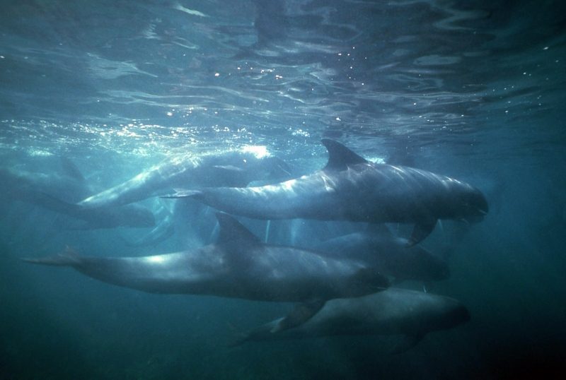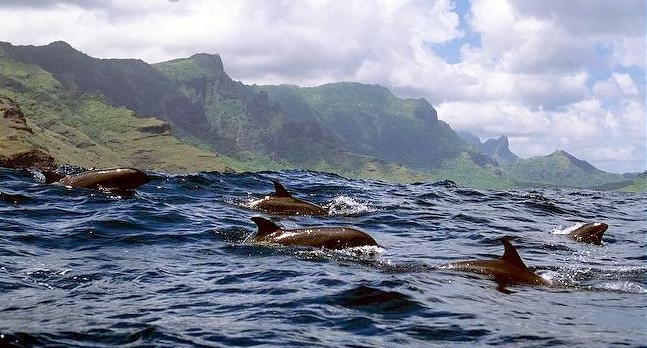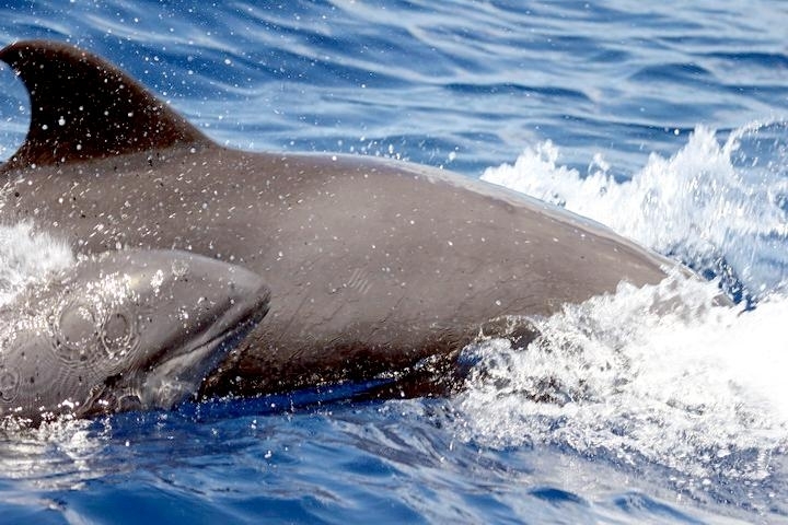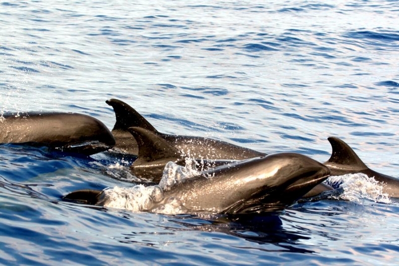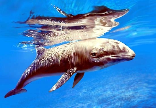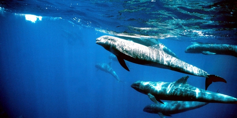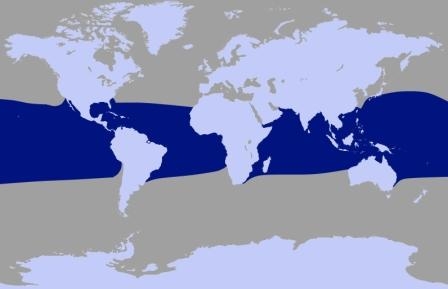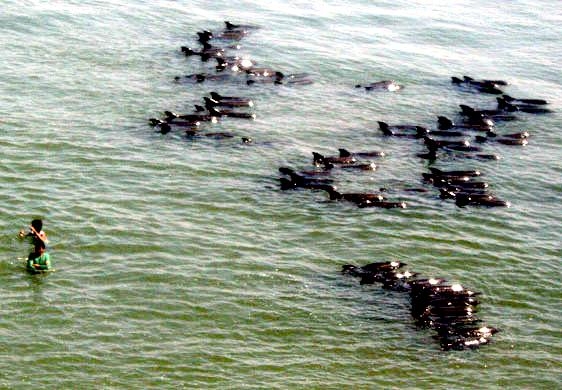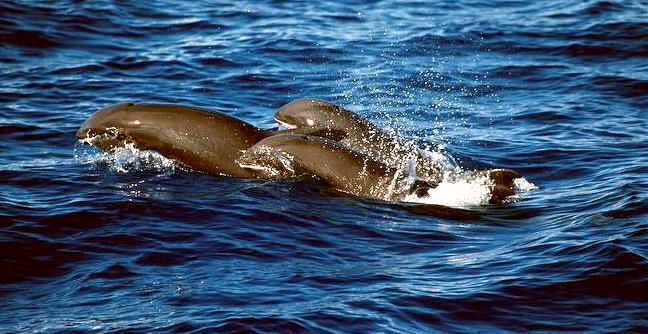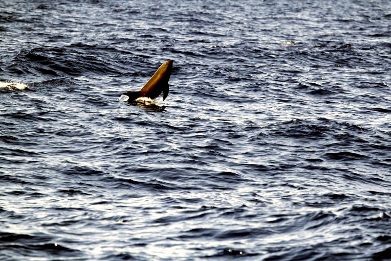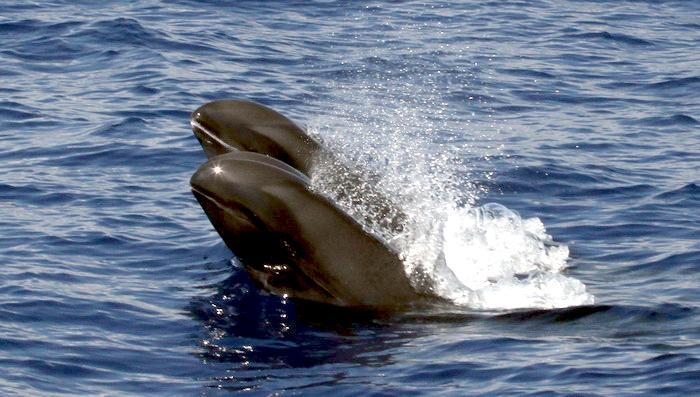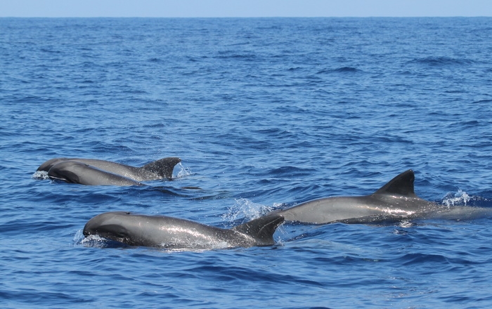 They are dark gray to black in color with white to light gray coloring on their ventral (under) side and like the Pygmy Killer Whale, white lips. The black triangular “mask” on the face distinguishes them from the more uniformly colored Pygmy Killer Whales. Melon-headed Whales also have a cape that dips much lower below the dorsal fin than that of Pygmy Killer Whales, although its margin is often faint. Melon-headed Whales are a social species. In the tropical Atlantic, Pacific & Indian oceans, they have been reported traveling with Fraser’s, Spinner and Spotted Dolphins. Melon-headed Whales are found in tropical & subtropical waters worldwide, most commonly in the Philippine Sea. They favor warm, pelagic waters. Melon-headed Whales travel in pods of 100-1,000, although even larger pods have also been reported. Melon-headed Whales feed primarily on squid & fish. The calving season of the Melon-headed Whale is thought to occur in early spring in the lower latitudes of both hemispheres. Little else is known about the reproductive behavior of this species.