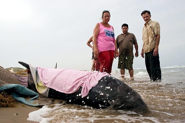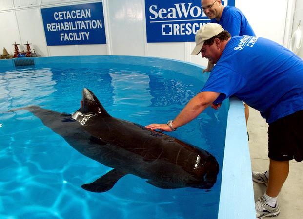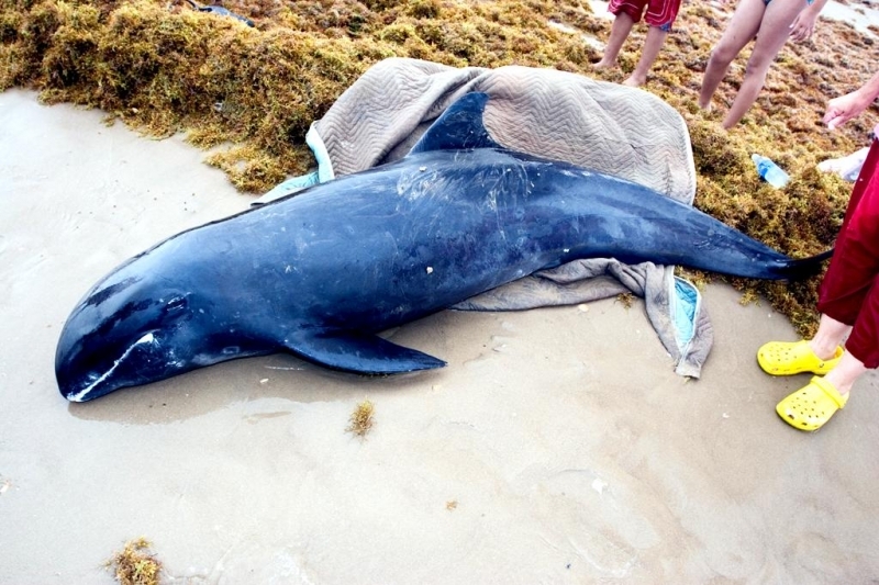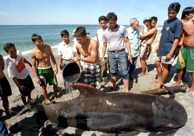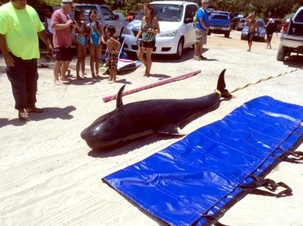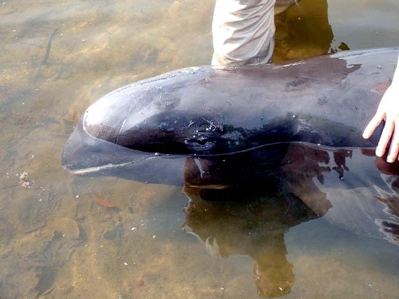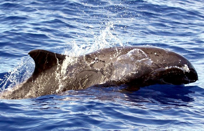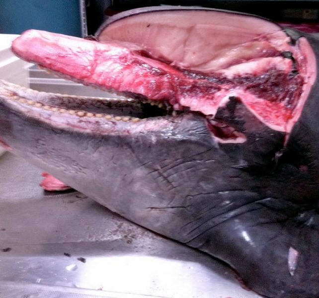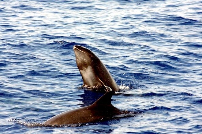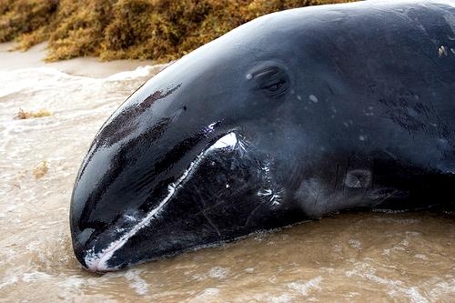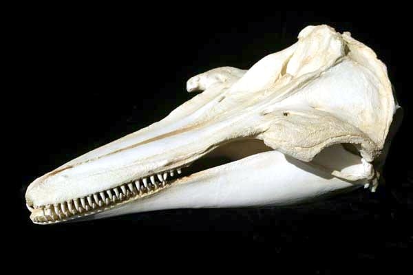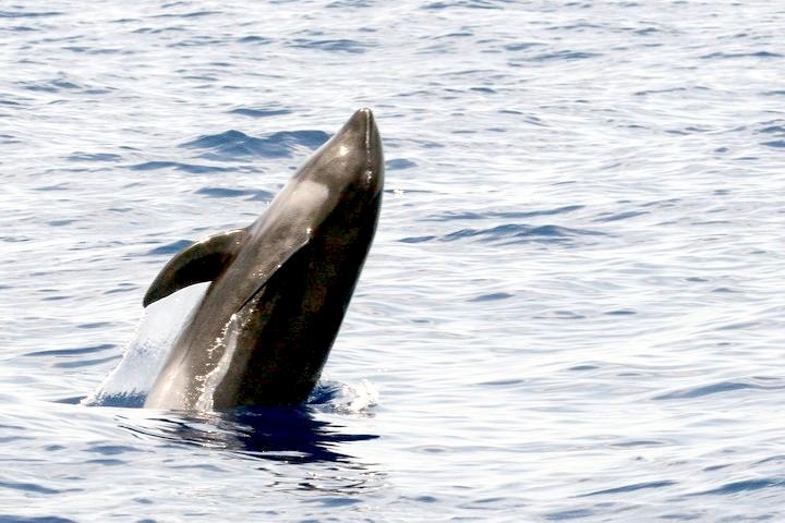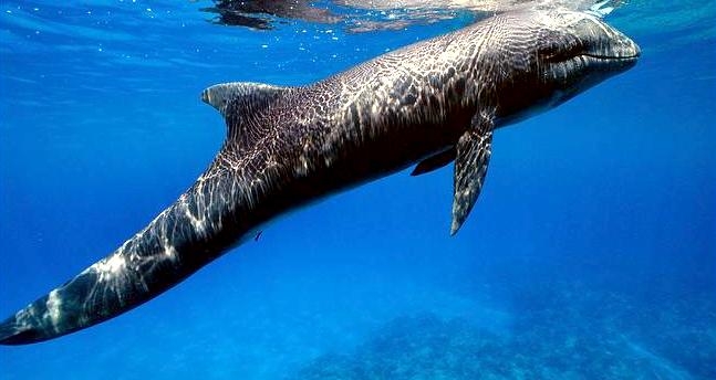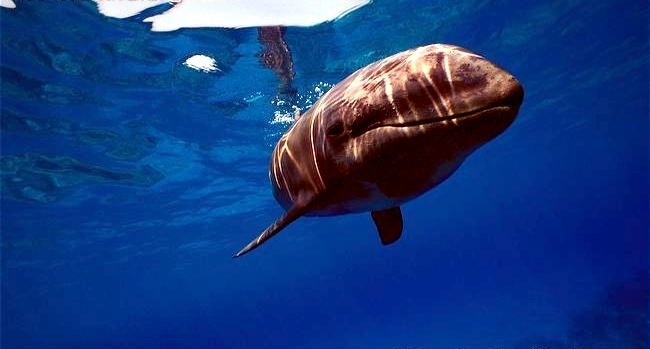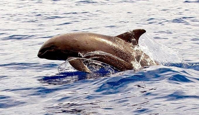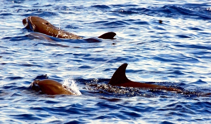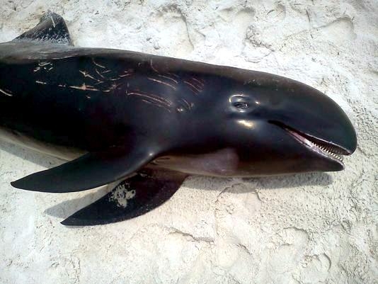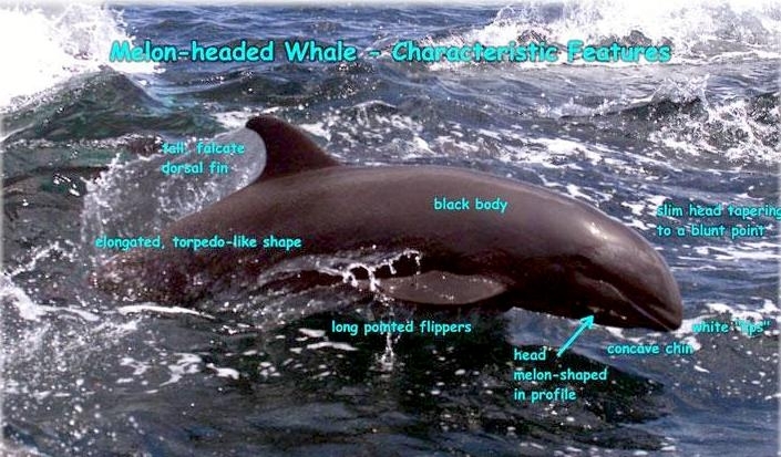 Melon-headed Whales are close in size to Pygmy Killer Whales and bear a strong resemblance from a distance. Adult males reach up to 2.7 meters in length, adult females up to 2.6 meters in length. Their maximum weight is about 225 kilograms. The Melon-headed Whale has a rounded somewhat triangular head when viewed from above or below. When viewed from the side, the head appears rounded. Females & juveniles have an indistinct beak and have a distinct dorsal fin located in the middle of their back. Their flippers are long & pointed at the tips, a characteristic that differs from the more rounded flippers of the Pygmy Killer Whale. Melon-headed Whales also have twice as many teeth as the Pygmy Killer Whale; the upper jaws have 20-25 sharp-pointed teeth and the lower jaws have about 22-24 teeth.