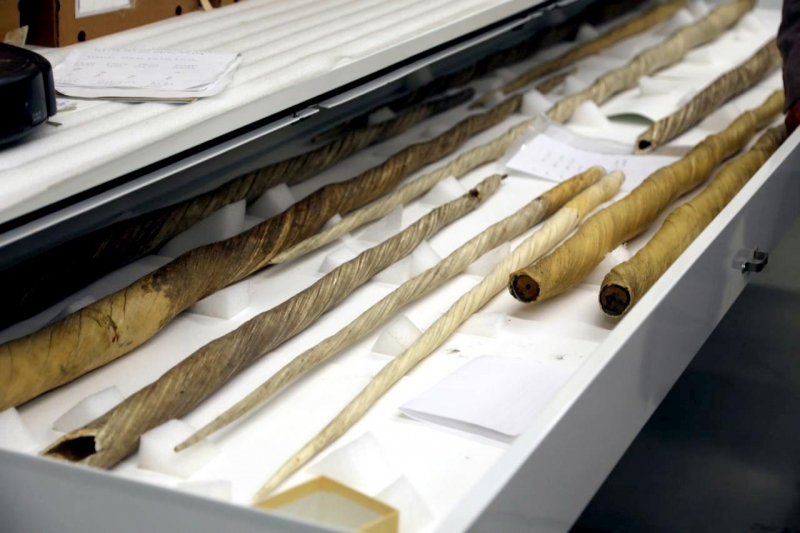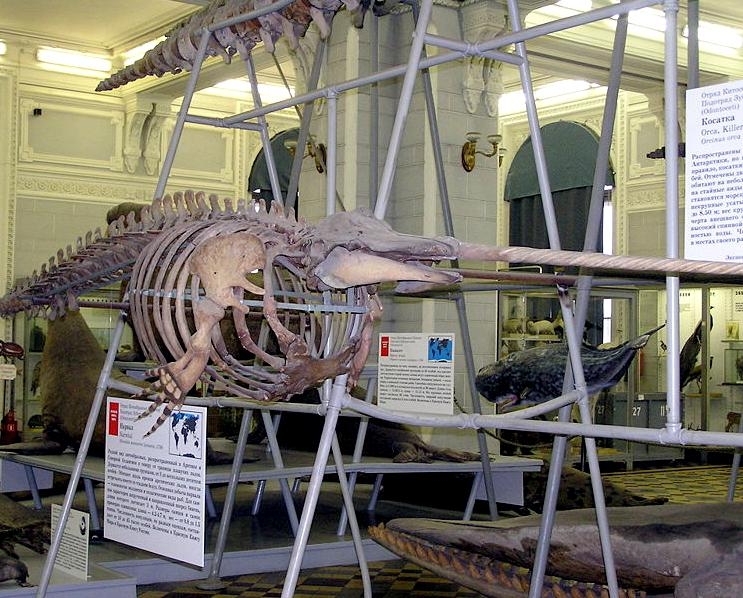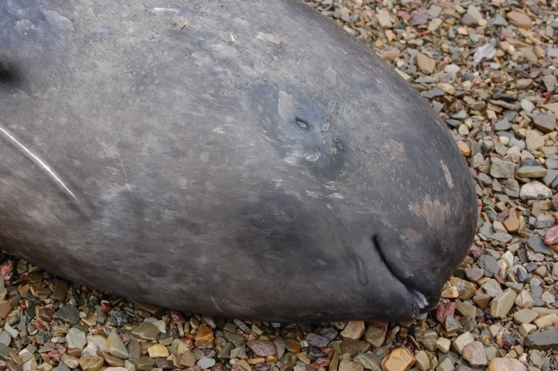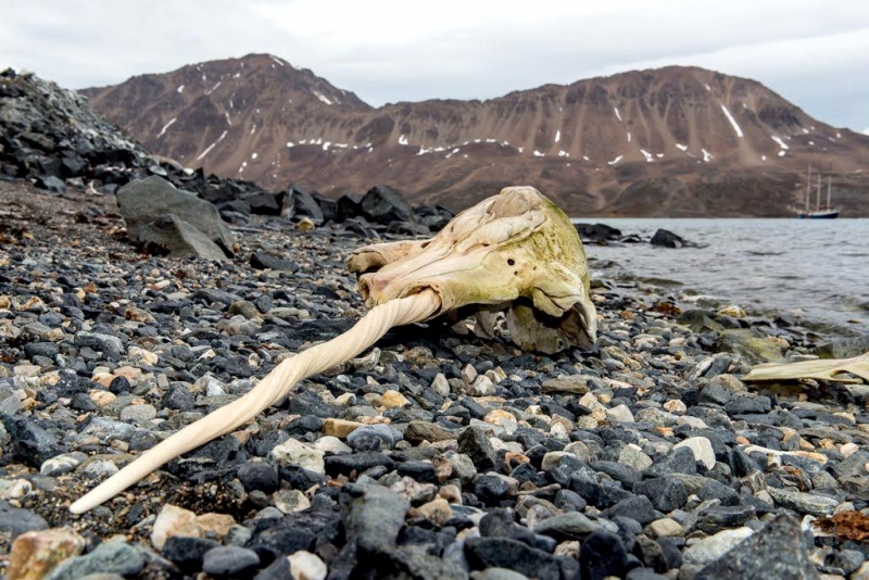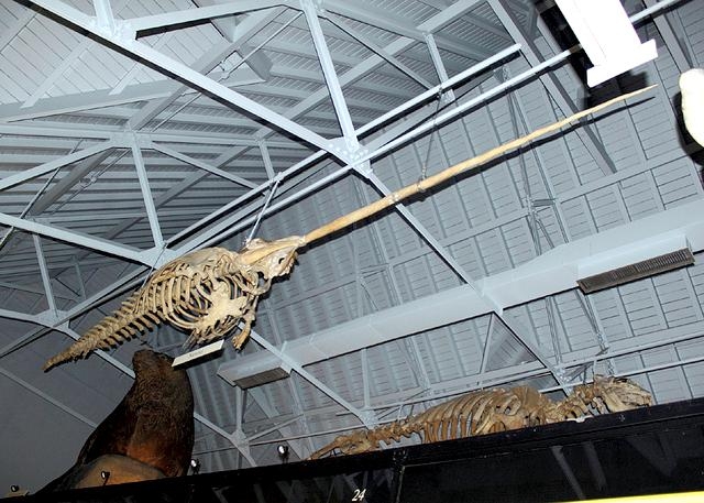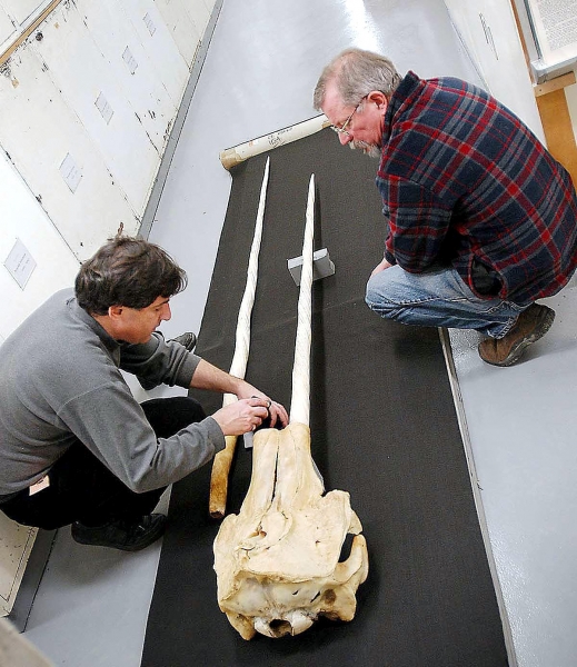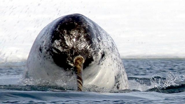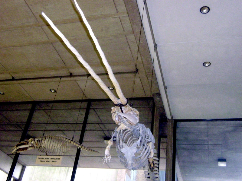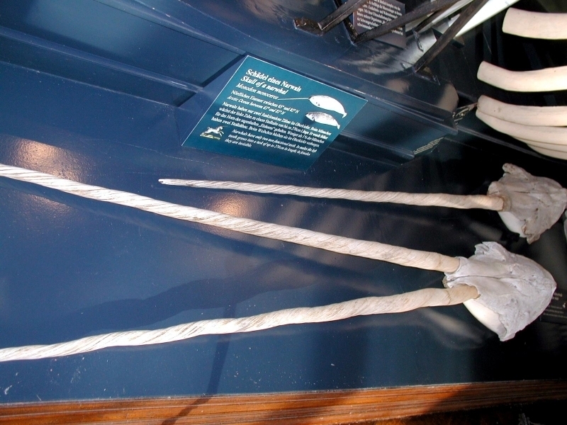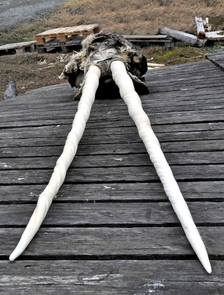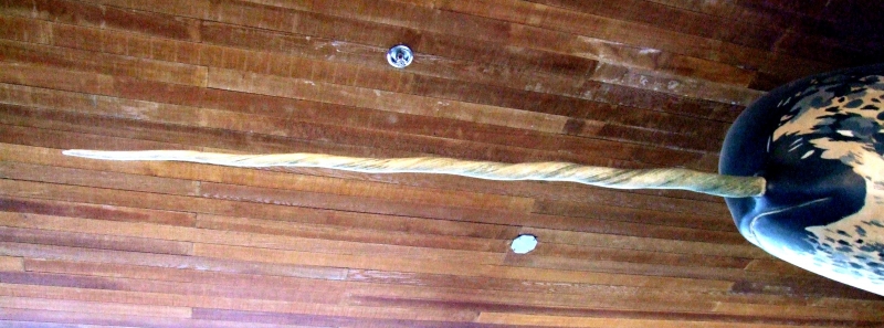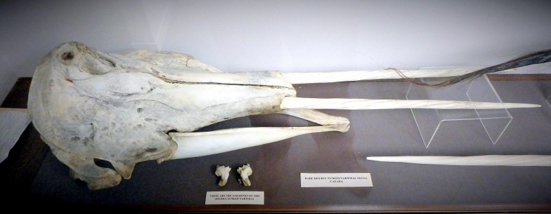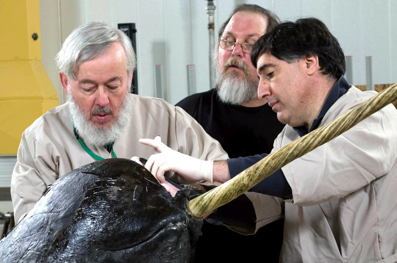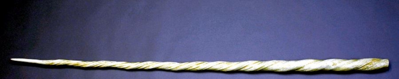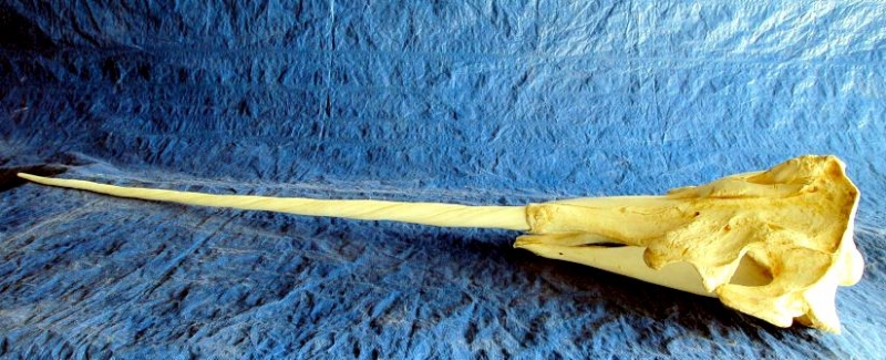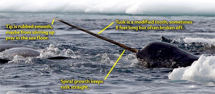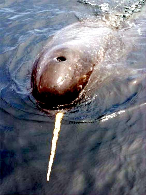 Narwhals have 2 teeth located in the upper jaw; in males, the left tooth will grow to form a long straight tusk, hence the nickname “Unicorn of the Sea”. The length of the tusk is between 1/3 to 1/2 as long as the length of the body. Tusks have measured up to 3 meters and weighed 10 kilograms. In rare cases, the other tooth forms a tusk, both of which grow counterclockwise in a spiral. Also in rare cases, females have been seen with tusks. The bottom end of the tusk appears clean & polished, however the remaining tusk is often covered in algae. The tusks are made up of an outer layer of cement, an inner layer calcareous hard tooth material called dentine and a pulp cavity rich in blood that holds the tusk in place. Narwhals often break tusks, however they are able to repair the damage with new dentin growth. The exact function of the tusk was unknown until recently and was thought to be used for male to male competition or to spear food or stir up food from the ocean bottom. The Narwhal’s tooth has hydrodynamic sensor capabilities. Ten million tiny nerve connections tunnel their way from the central nerve of the Narwhal tusk to its outer surface. Though seemingly rigid and hard, the tusk is like a membrane with an extremely sensitive surface capable of detecting changes in water temperature, pressure and particle gradients. Because these whales can detect particle gradients in water, they are capable of discerning the salinity of the water which could help them survive in their Arctic ice environment. It also allows Narwhals to detect water particles characteristic of the fish that constitute their diet. There is no comparison in nature and certainly none more unique in tooth form, expression and functional adaptation.