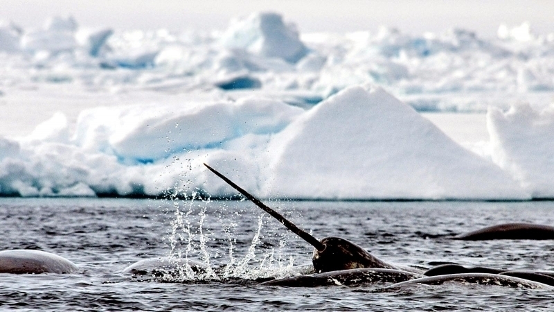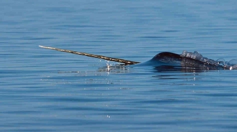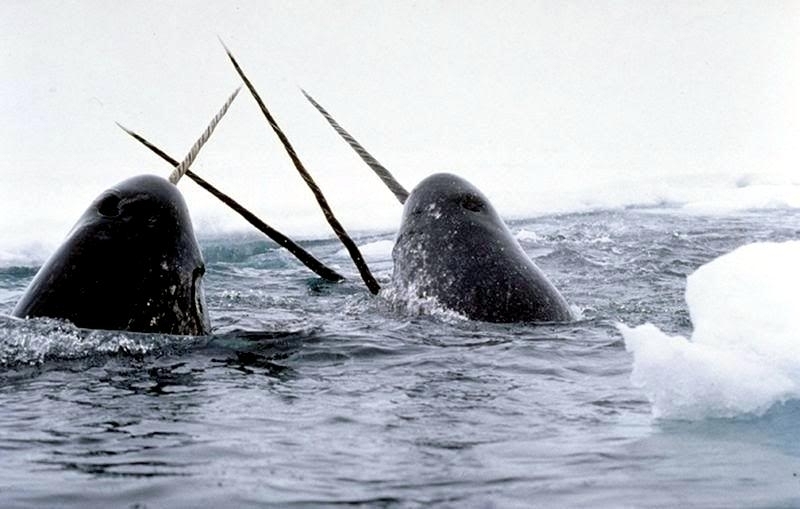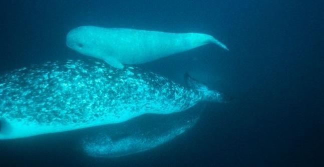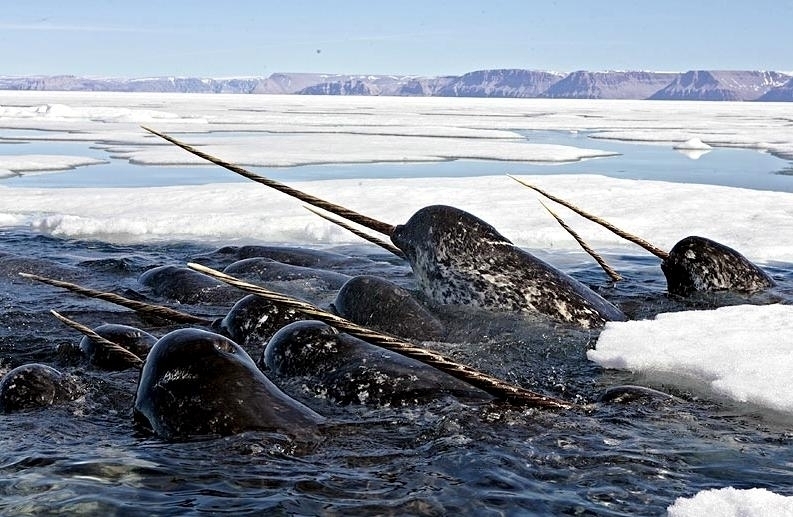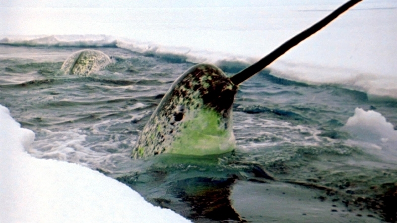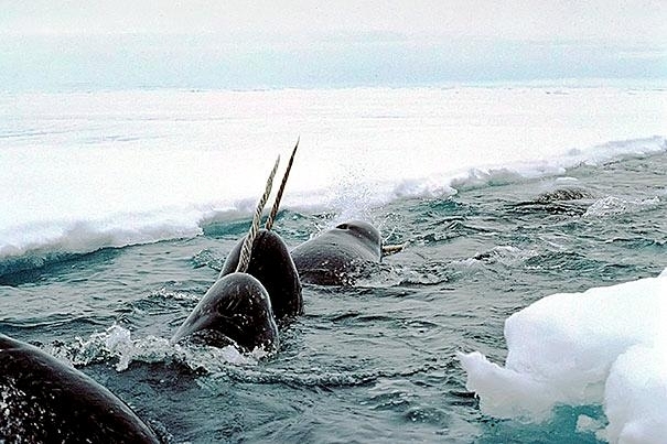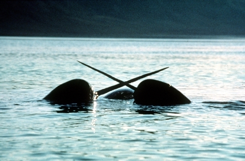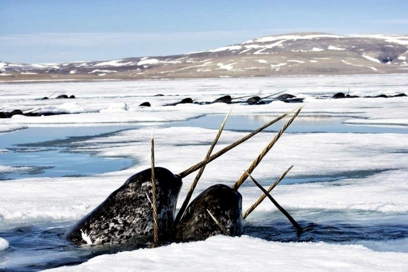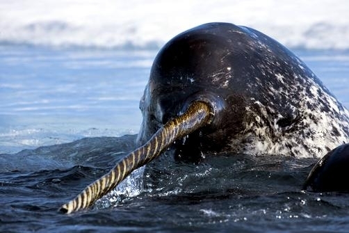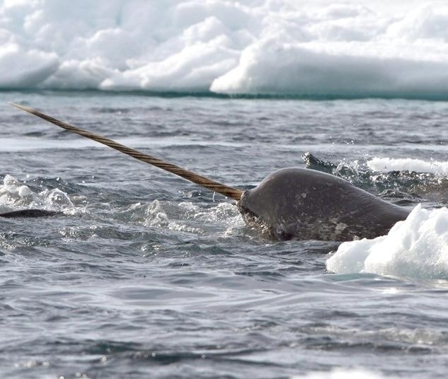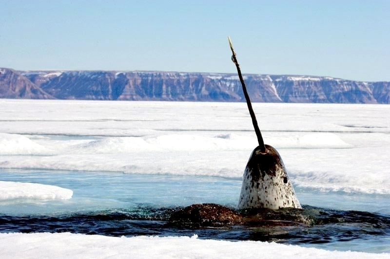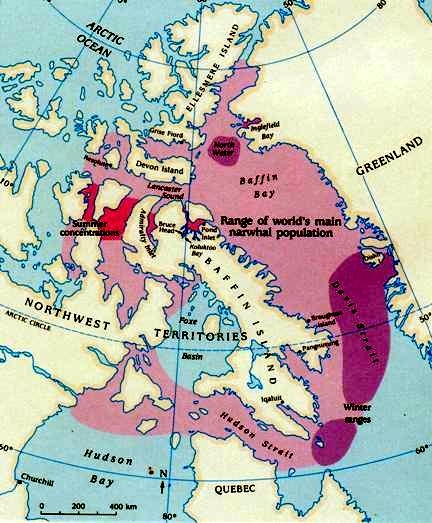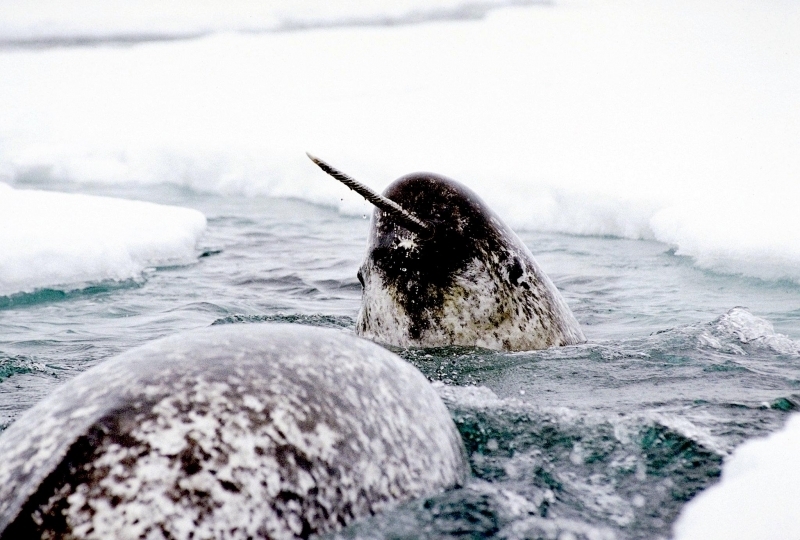 Narwhals live to over 50 years. They harbor several species of commensurable animals such as whale lice and certain nematodes. Narwhals are found in Arctic waters from eastern Canada to central Russia between 70°N-80°N. There are large concentrations in the Davis Strait, around Baffin Bay and in the Greenland Sea. They are occasionally found in eastern Siberia, Alaska and the western Canadian Arctic. They are an arctic species however, some wandering individuals have been seen of the coast of Newfoundland, Europe and the eastern Mediterranean. Narwhals are one of the northernmost cetacean species with a smaller range than other cetaceans. They tend to stay near the loose pack ice where they maintain breathing holes and prefer deep water, migrating with the seasonal advance and retreat of the ice. In the summer when ice cover is reduced in deeper water bodies, they migrate to smaller water bodies such as the heads of fjords. Narwhals feed on squid, fish, crustaceans & mollusks. Because they have few functional teeth, they are thought to use suction and jets of water to uncover prey on the ocean bottom. They have flexible necks that allow them to scan broad areas for food. The breeding habits of the Narwhal are largely unknown. It is known that they breed seasonally between March to May and give birth about 15 months later usually in July to August. Females are thought to nurse for about 20 months. Narwhals mate in the water belly to belly. Females give birth to a single calf most often, however in rare cases the birth of twins have been recorded. Calves are born tail first, measure 1.5 to 1.7 meters long, weigh 80 to 95 kilograms and are born with about a 25 millimeters thick layer of blubber.