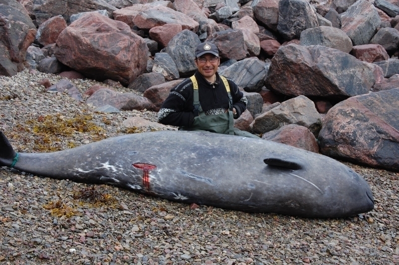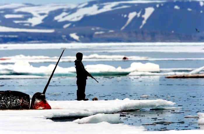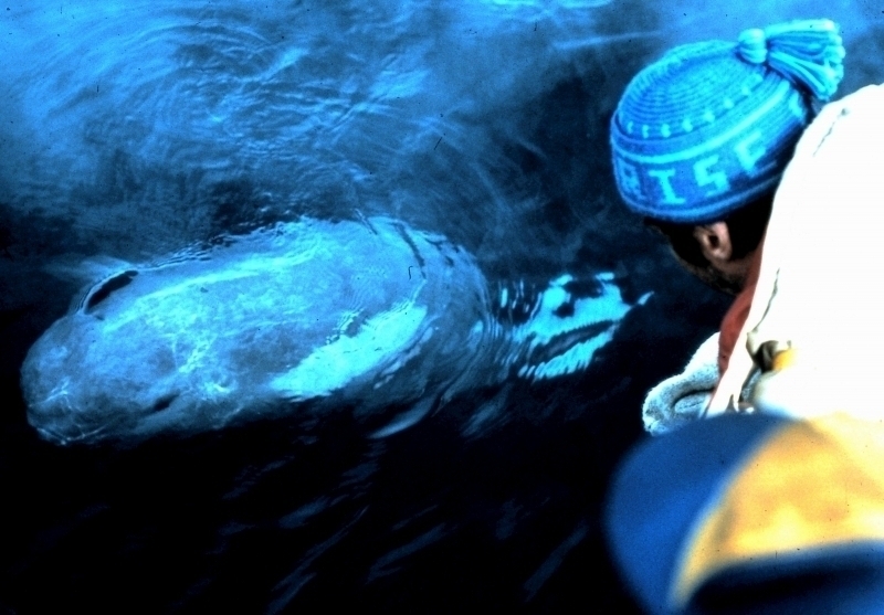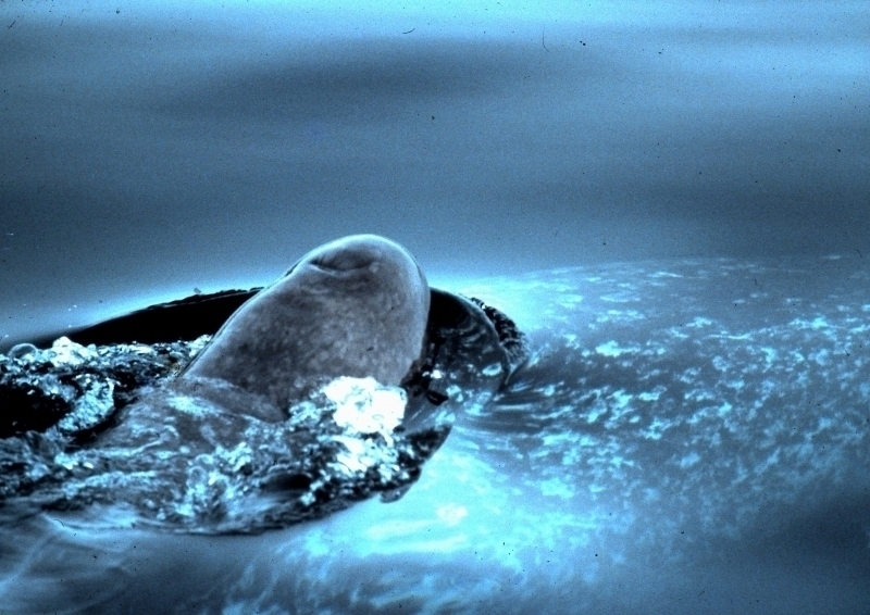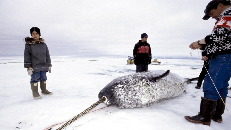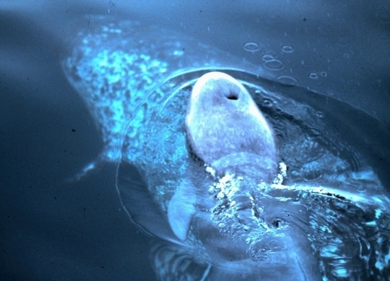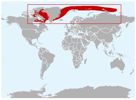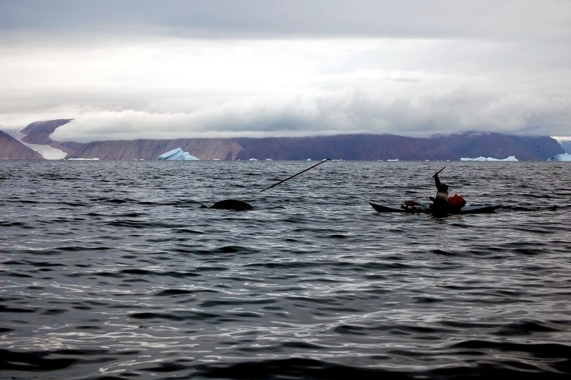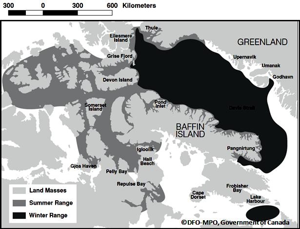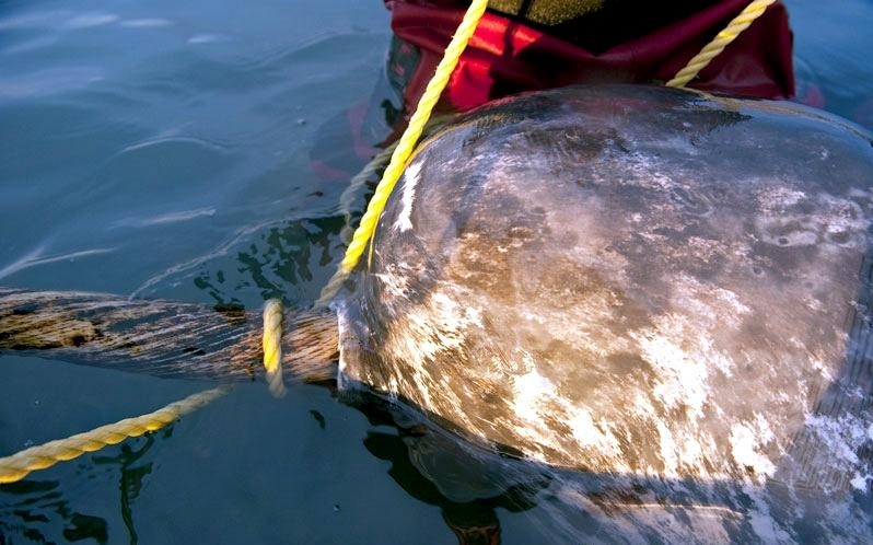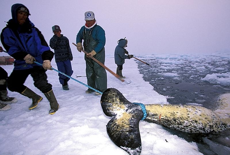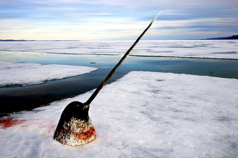 Narwhals live to over 50 years. They harbor several species of commensurable animals such as whale lice and certain nematodes. Narwhals are found in Arctic waters from eastern Canada to central Russia between 70°N-80°N. There are large concentrations in the Davis Strait, around Baffin Bay and in the Greenland Sea. They are occasionally found in eastern Siberia, Alaska and the western Canadian Arctic. They are an arctic species however, some wandering individuals have been seen of the coast of Newfoundland, Europe and the eastern Mediterranean. Narwhals are one of the northernmost cetacean species with a smaller range than other cetaceans. They tend to stay near the loose pack ice where they maintain breathing holes and prefer deep water, migrating with the seasonal advance and retreat of the ice. In the summer when ice cover is reduced in deeper water bodies, they migrate to smaller water bodies such as the heads of fjords. Narwhals feed on squid, fish, crustaceans & mollusks. Because they have few functional teeth, they are thought to use suction and jets of water to uncover prey on the ocean bottom. They have flexible necks that allow them to scan broad areas for food. The breeding habits of the Narwhal are largely unknown. It is known that they breed seasonally between March to May and give birth about 15 months later usually in July to August. Females are thought to nurse for about 20 months. Narwhals mate in the water belly to belly. Females give birth to a single calf most often, however in rare cases the birth of twins have been recorded. Calves are born tail first, measure 1.5 to 1.7 meters long, weigh 80 to 95 kilograms and are born with about a 25 millimeters thick layer of blubber.