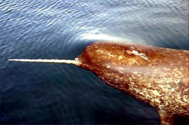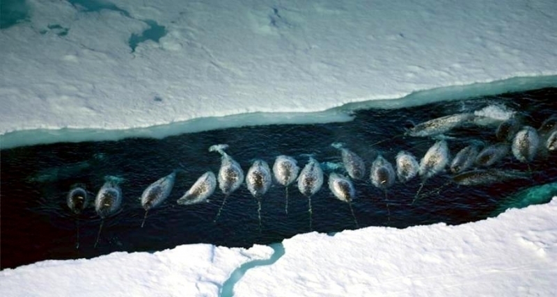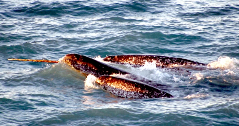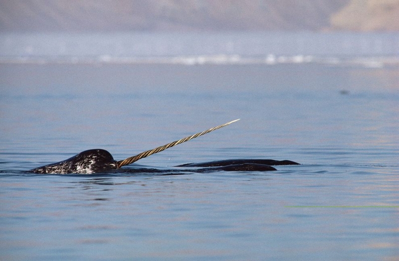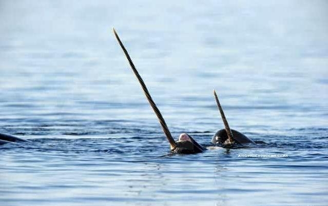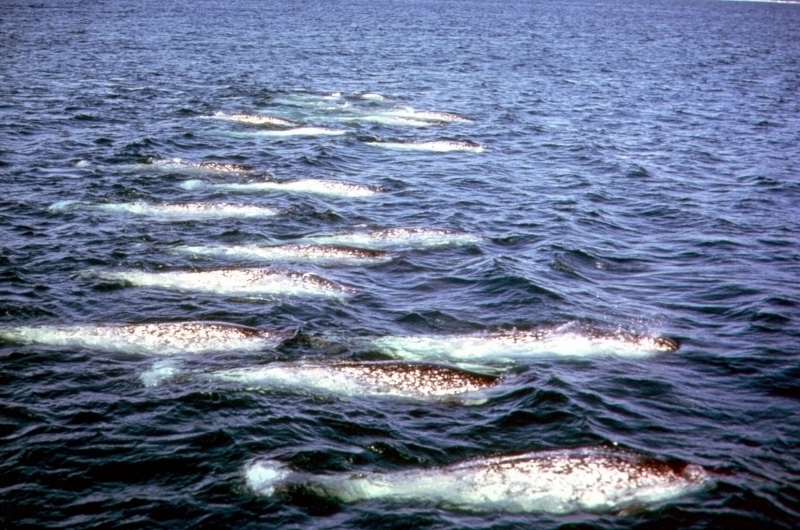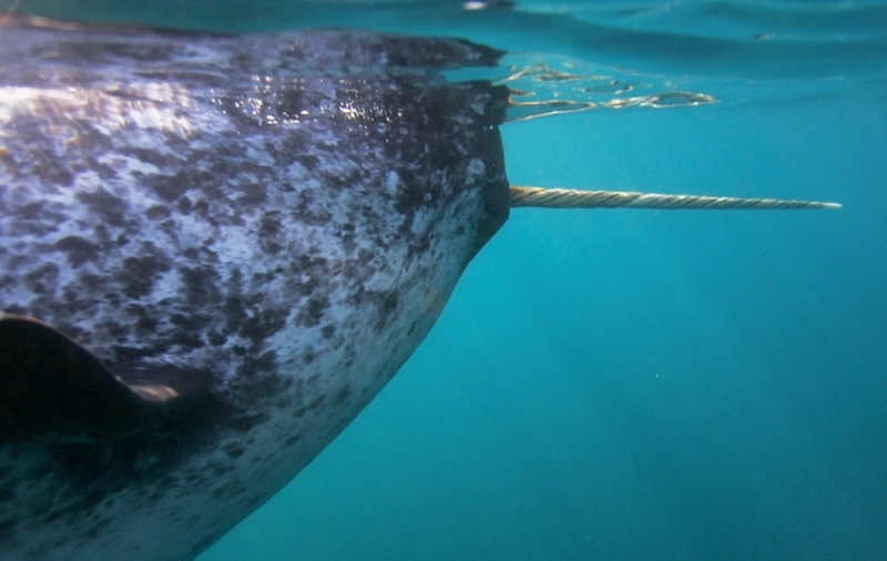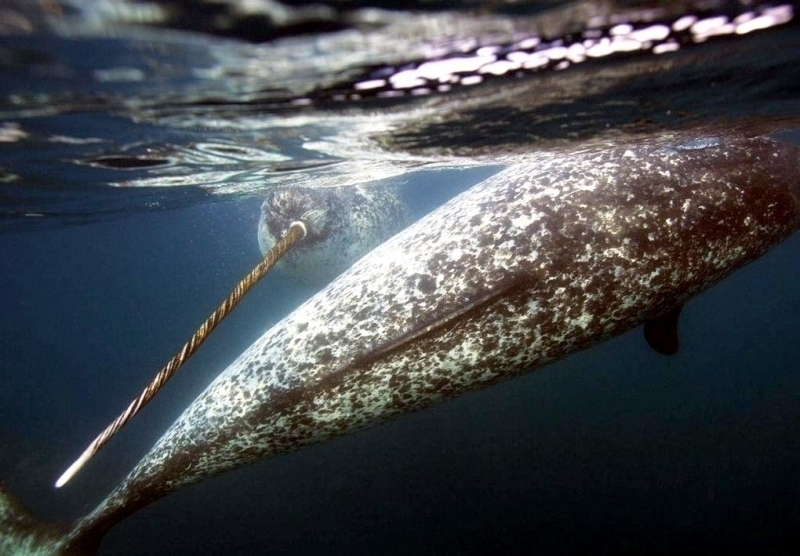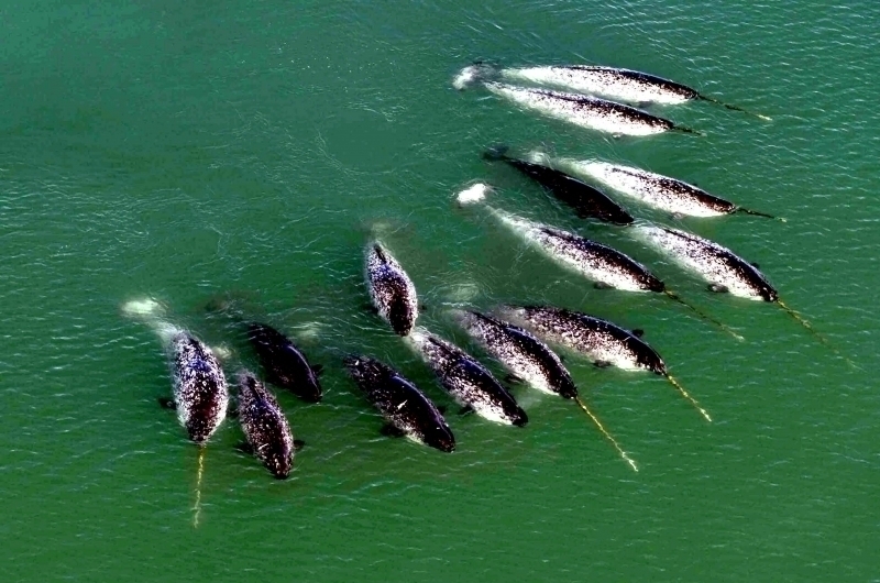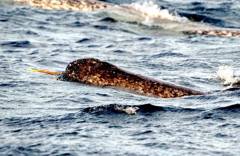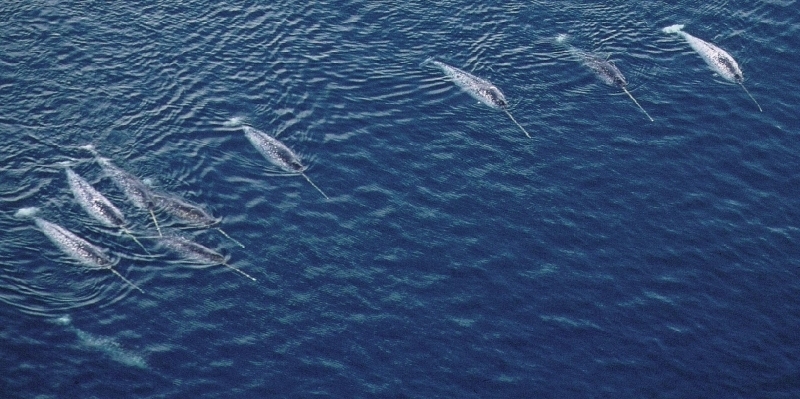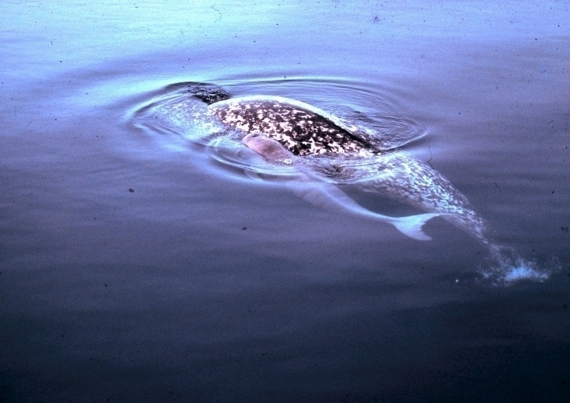 Narwhals are a gregarious species commonly found in pods of sometimes up to 20 individuals but most often in pods of 3 to 8, which are often segregated by sex. During the migratory season, smaller pods combine with other pods to form very large pods. Its name is derived from the old Norse word nár meaning “corpse” in reference to the animal’s grayish, mottled pigmentation like that of a drowned sailor and its summer-time habit of lying still at or near the surface of the sea called “logging”. Narwhals measure 3.6 to 6.2 meters in body length (average 4.7 meters in males, 4 meters in females) pectoral fins measure 30 to 40 centimeters tip to tip & width of the tail flukes is 1 to 1.2 meters. Average weight for a male Narwhal is 1,600 kilograms and 900 kilograms for females, about 1/3 of the weight consists of blubber. Compared to other cetaceans, Narwhals have a small head, blunt snout, short rounded flippers and convex rather than concave tail flukes. They have no dorsal fin, but they do have a ridge about 5 centimeters high that runs along the posterior end on the dorsal side that measures 60 to 90 centimeters long. Adult Narwhals are pale-gray or light-brown on the dorsal side, white on the ventral side, some with spotted patterns. Killer Whales & Polar Bears are the chief predators of Narwhals.