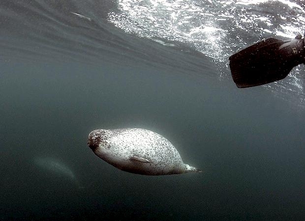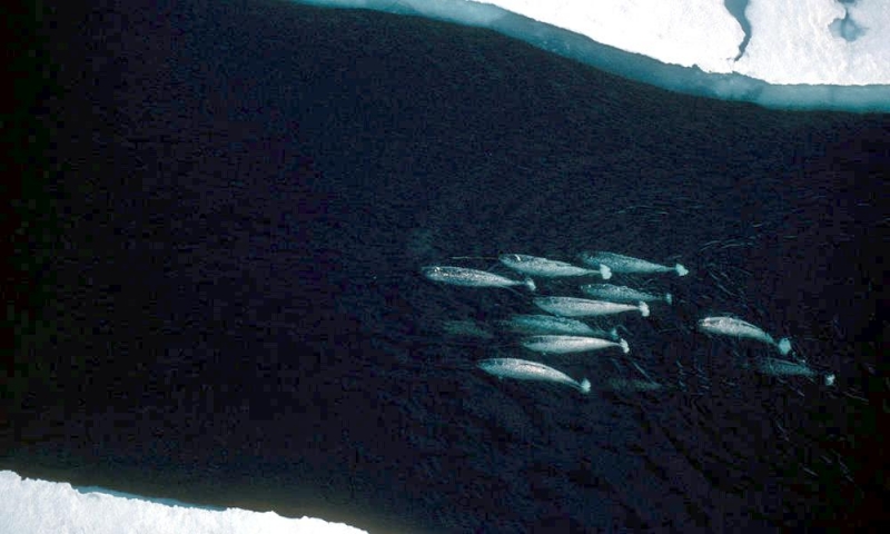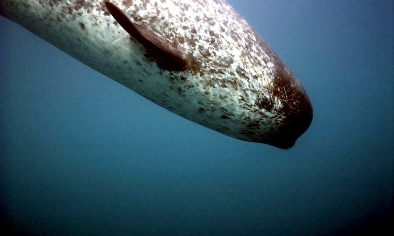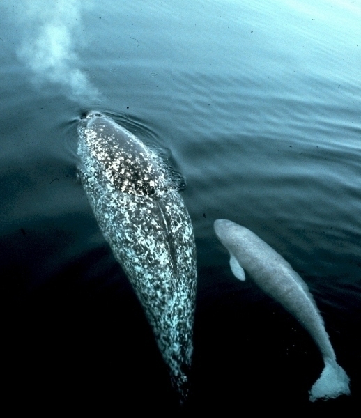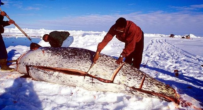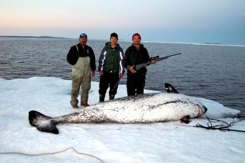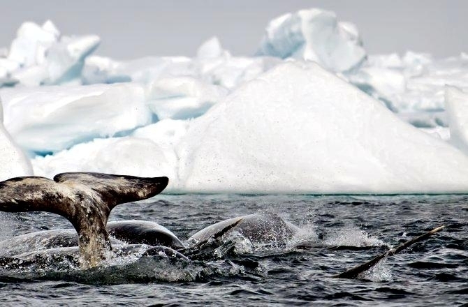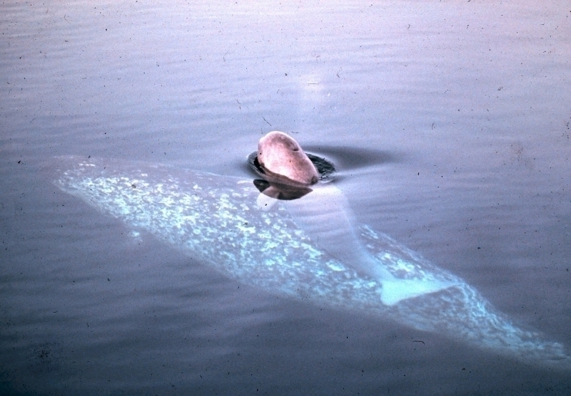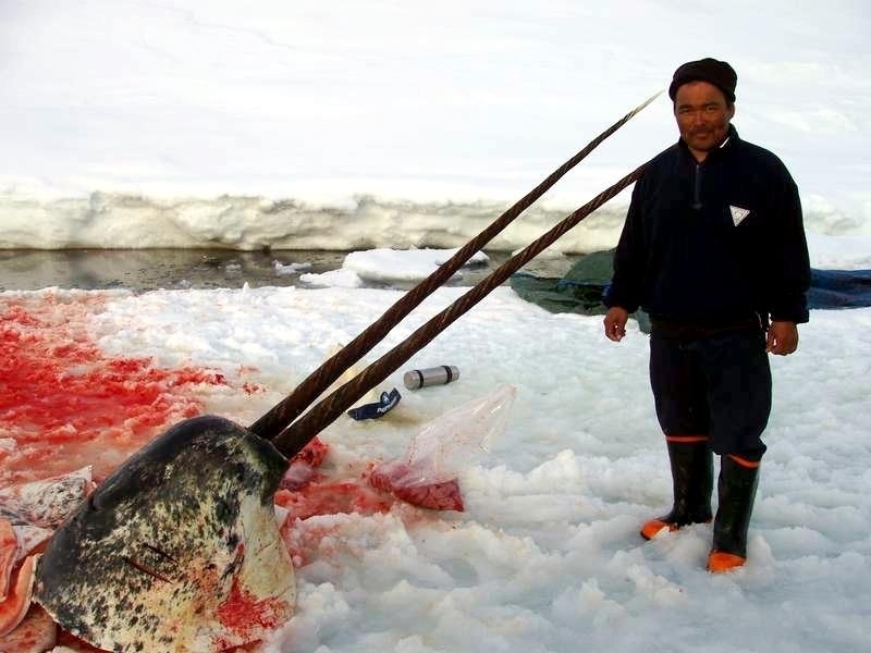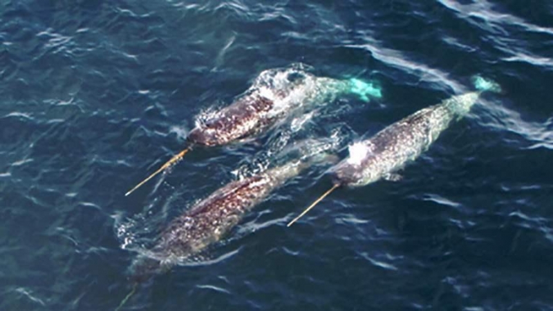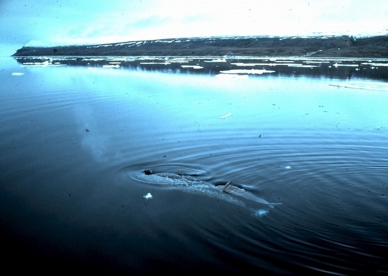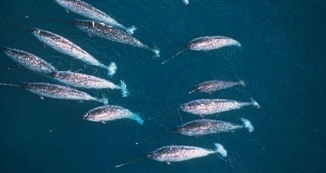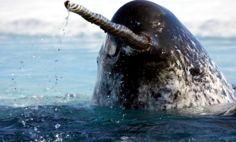 Narwhals are a gregarious species commonly found in pods of sometimes up to 20 individuals but most often in pods of 3 to 8, which are often segregated by sex. During the migratory season, smaller pods combine with other pods to form very large pods. Its name is derived from the old Norse word nár meaning “corpse” in reference to the animal’s grayish, mottled pigmentation like that of a drowned sailor and its summer-time habit of lying still at or near the surface of the sea called “logging”. Narwhals measure 3.6 to 6.2 meters in body length (average 4.7 meters in males, 4 meters in females) pectoral fins measure 30 to 40 centimeters tip to tip & width of the tail flukes is 1 to 1.2 meters. Average weight for a male Narwhal is 1,600 kilograms and 900 kilograms for females, about 1/3 of the weight consists of blubber. Compared to other cetaceans, Narwhals have a small head, blunt snout, short rounded flippers and convex rather than concave tail flukes. They have no dorsal fin, but they do have a ridge about 5 centimeters high that runs along the posterior end on the dorsal side that measures 60 to 90 centimeters long. Adult Narwhals are pale-gray or light-brown on the dorsal side, white on the ventral side, some with spotted patterns. Killer Whales & Polar Bears are the chief predators of Narwhals.