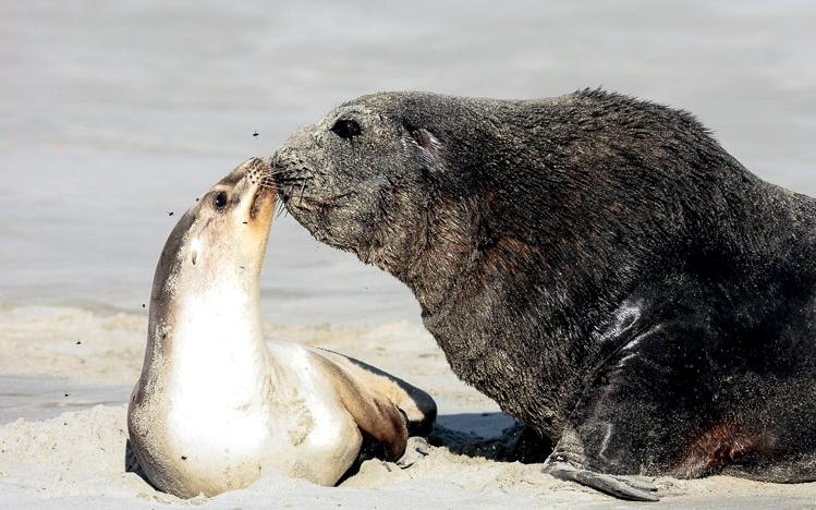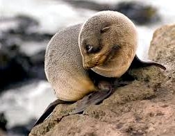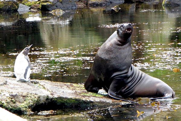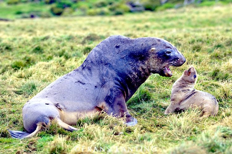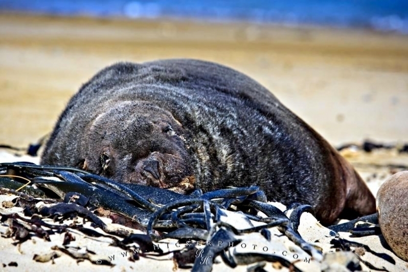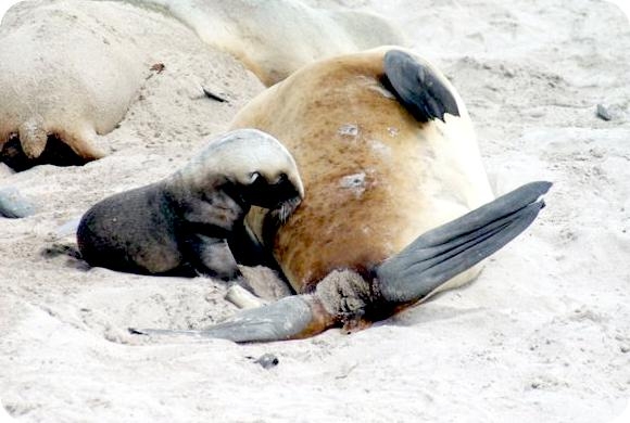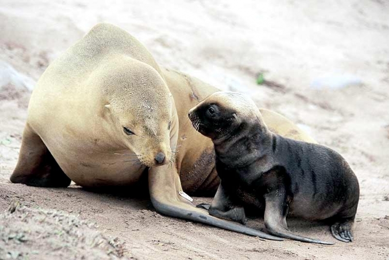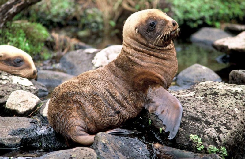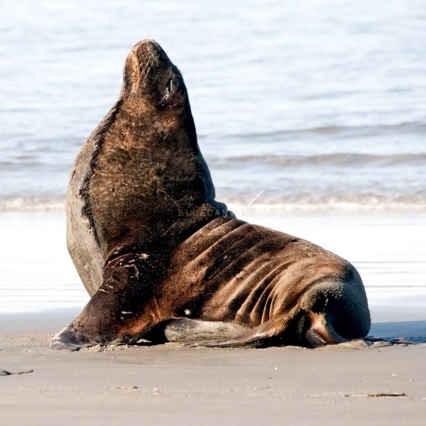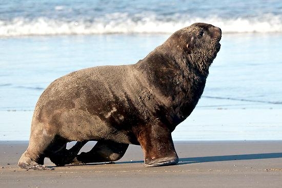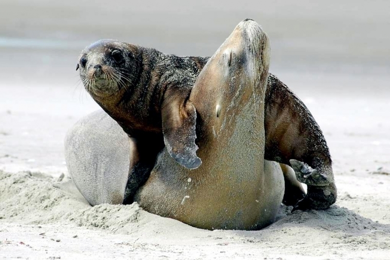 Migratory patterns of New Zealand Sea Lions are not well-known. They are opportunistic feeders with a diet of cephalopods, crabs, crayfish and fish. Adults are able to dive repeatedly to 300 meters and have been known to dive to over 600 meters. They have been known to travel up to 130 kilometers offshore during feeding trips. Males may live as long as 23 years, females as long as 18 years. They will eat penguins and adult male New Zealand Sea Lions have been observed feeding on New Zealand Sea Lion pups. Great White Sharks & Killer Whales prey on adults and pups. Females sexually mature at 3-4 years of age, males at 5 years, however males do not begin breeding until at least 8 years of age. Breeding season takes place between November and January. Pups are born measuring 70-100 centimeters in length, weighing 7.9 kilograms. Bulls begin arriving in November to fight for territory before the females arrive a few weeks later. Successful New Zealand Sea Lion bulls establish territories consisting of between 8-25 females. The females give birth shortly after arriving, then mate 7 to 10 days later. Pups are born with a thick coat of light to dark brown fur. About 10-14 days after a pup is born, females return to sea to feed then return to land for 2-3 days to nurse. This feeding cycle continues for about 8-12 months. At 2-3 weeks of age, New Zealand Sea Lion pups begin to swim. Adult males remain ashore and do not normally feed during breeding season. Molting follows breeding season in late February through to early May.