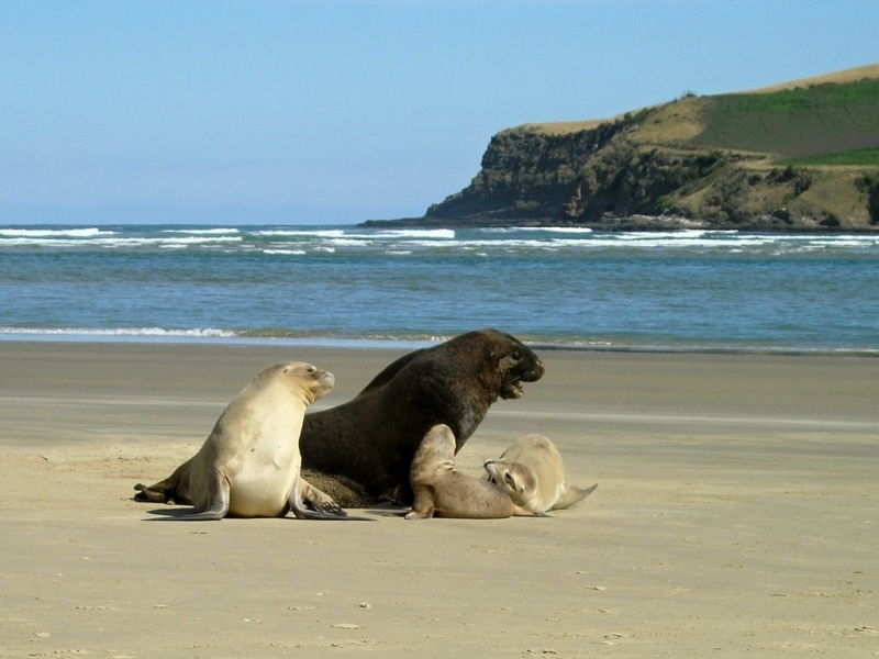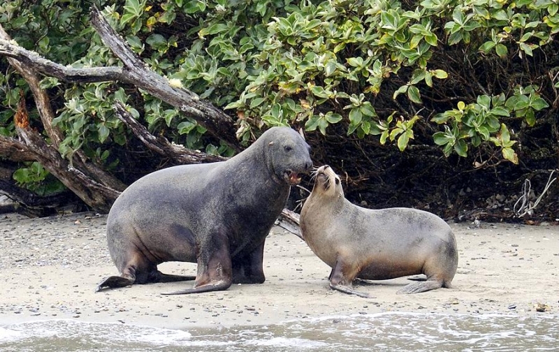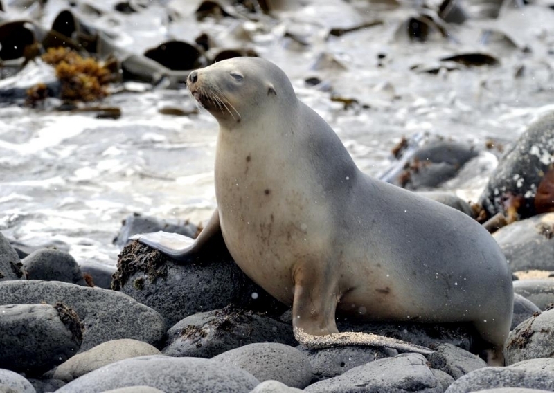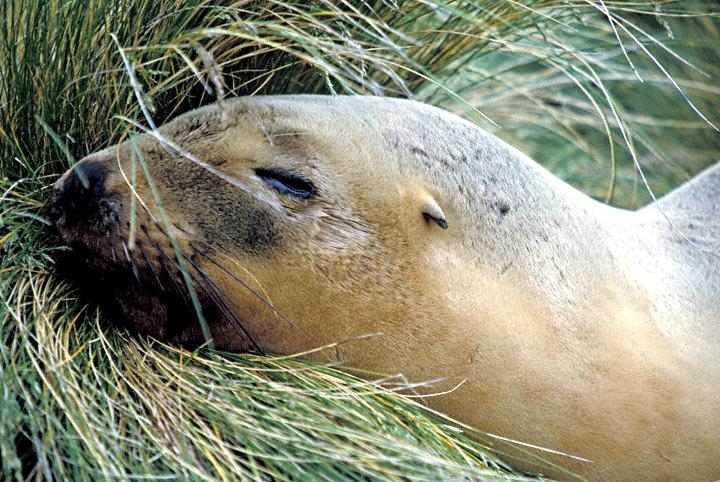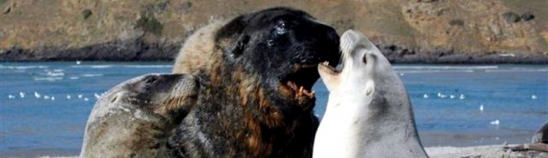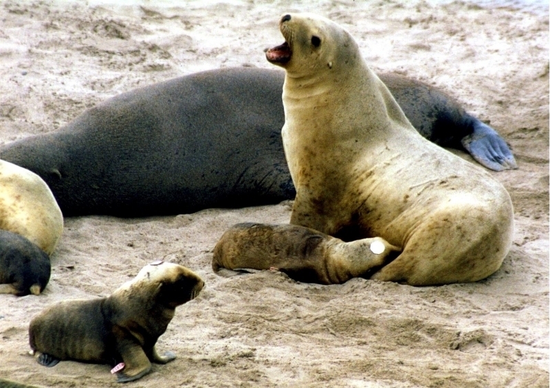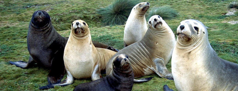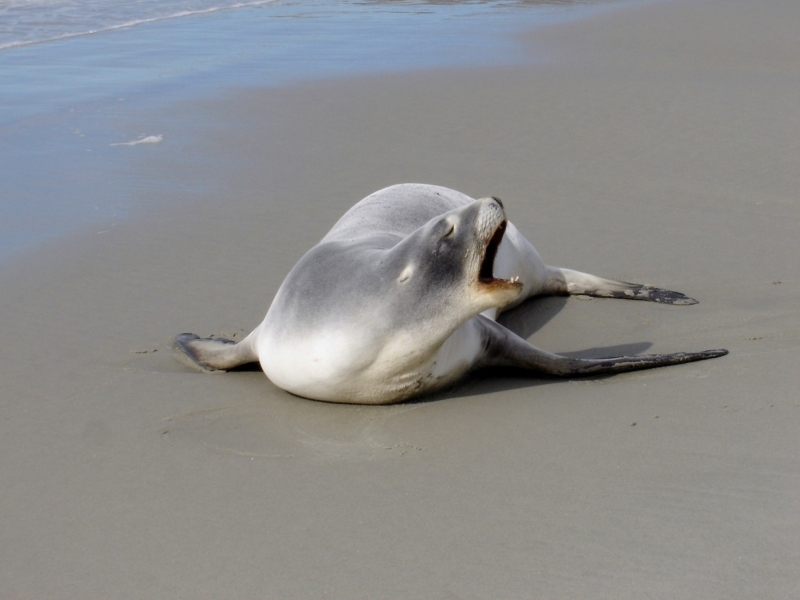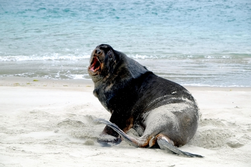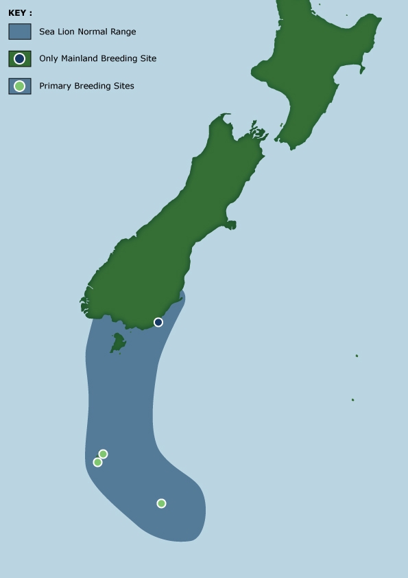 New Zealand Sea Lions also known as Hooker’s Sea Lions and “whakahao” in Māori, the New Zealand native people, are one of the rarest and most endangered of the pinniped family. Males measure between 2.0-3.25 meters in length and weigh 300-450 kilograms, while adult females measure 1.6-2 meters in length and weigh up to 160 kilograms. Adult females are a creamy-gray color and males are typically dark brown to black. New Zealand Sea Lions breed almost exclusively on New Zealand’s sub-antarctic islands, primarily on Dundas Island in the Auckland Islands where 3 colonies make up 95% of the total pup production that are less than 7 kilometers apart. They haul-out between the Australian sub-antarctic Macquarie Island and the southeast coast of South Island of New Zealand. Individuals are also occasionally seen on New Zealand’s North Island. Prior to a mass mortality of New Zealand Sea Lions in 1998, the total population was estimated at 12,000-14,000. New Zealand Sea Lions prefer sandy beaches for both haul-out & breeding. They often wonder inland, sometimes as far as 2 kilometers for reasons currently unknown.