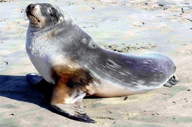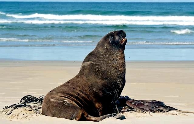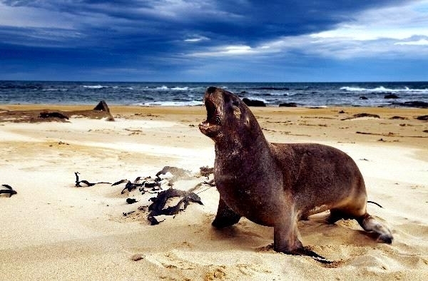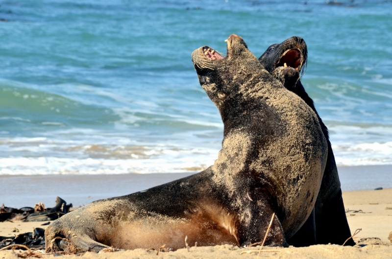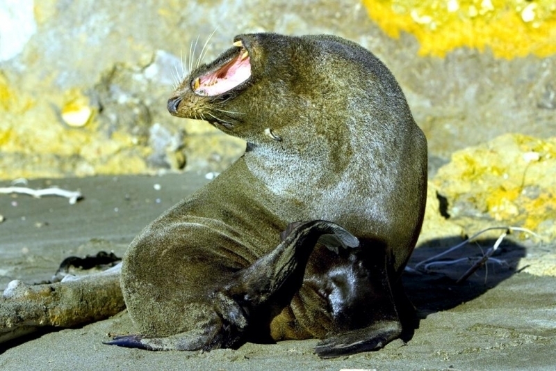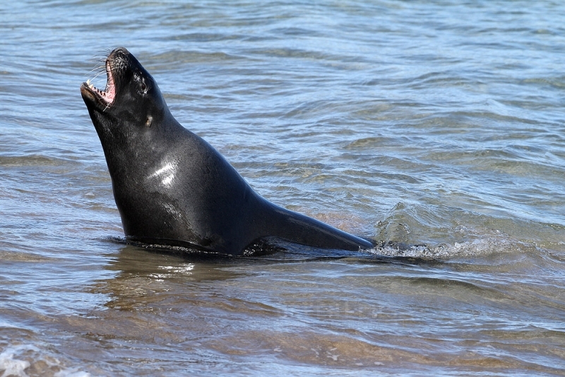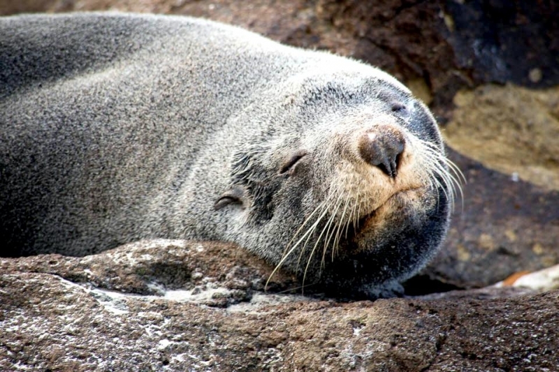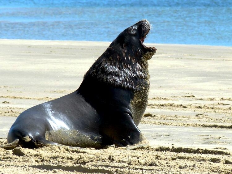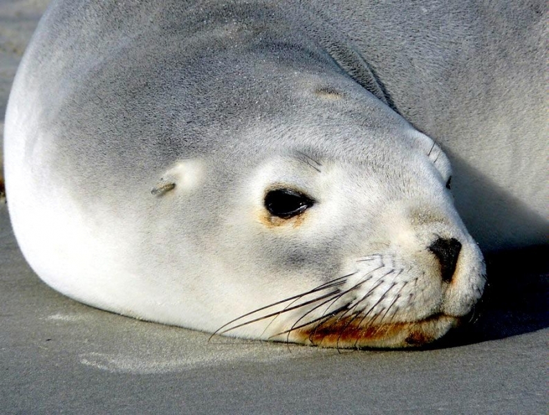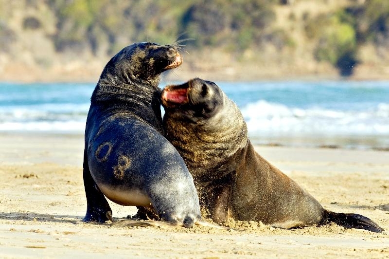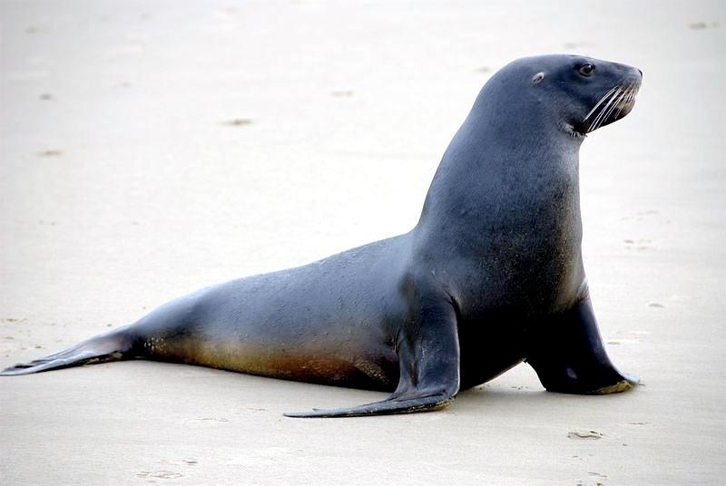 New Zealand Sea Lions also known as Hooker’s Sea Lions and “whakahao” in Māori, the New Zealand native people, are one of the rarest and most endangered of the pinniped family. Males measure between 2.0-3.25 meters in length and weigh 300-450 kilograms, while adult females measure 1.6-2 meters in length and weigh up to 160 kilograms. Adult females are a creamy-gray color and males are typically dark brown to black. New Zealand Sea Lions breed almost exclusively on New Zealand’s sub-antarctic islands, primarily on Dundas Island in the Auckland Islands where 3 colonies make up 95% of the total pup production that are less than 7 kilometers apart. They haul-out between the Australian sub-antarctic Macquarie Island and the southeast coast of South Island of New Zealand. Individuals are also occasionally seen on New Zealand’s North Island. Prior to a mass mortality of New Zealand Sea Lions in 1998, the total population was estimated at 12,000-14,000. New Zealand Sea Lions prefer sandy beaches for both haul-out & breeding. They often wonder inland, sometimes as far as 2 kilometers for reasons currently unknown.