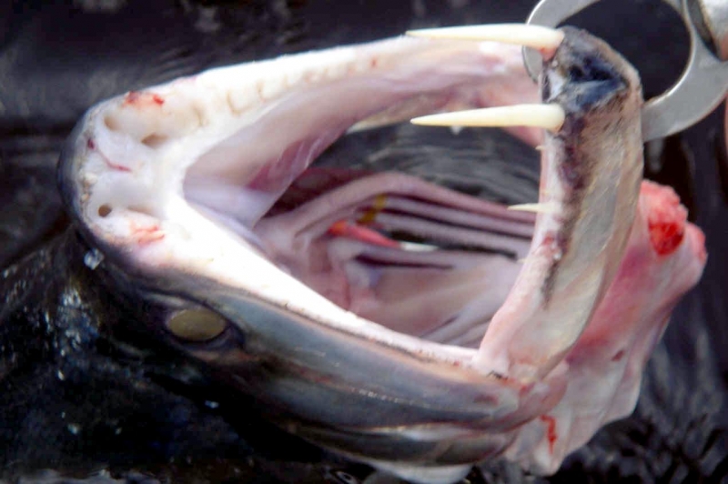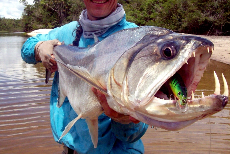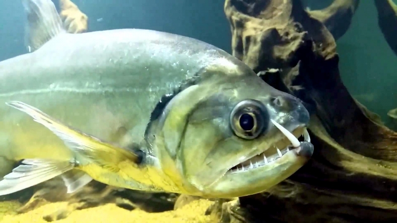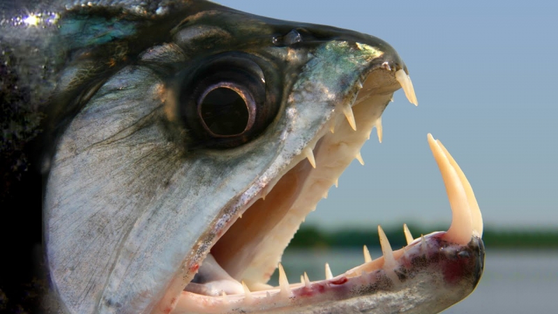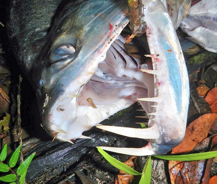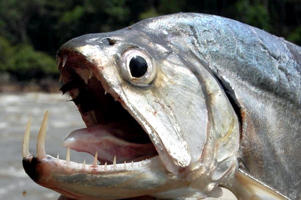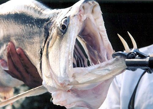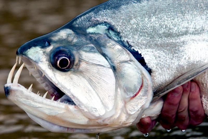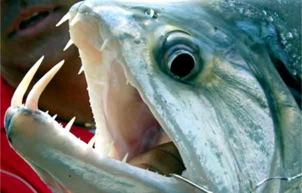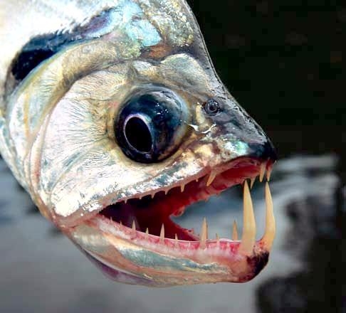 Anything with the name “Vampire Fish” should automatically be recognized as scary and the Payara is no exception. They are absolutely ferocious predators, capable of devouring fish up to half their own body size. Given that they can grow up to 1.2 meters (4 feet) long, this is no mean feat. A large part of their diet is made up of Red & Black Piranhas, which should give you some idea of how tough these fanged fiends can be. They get their name from the 2 tusks that sprout from their lower jaw, which can grow up to 15 centimeters (6 inches) long and which they use to literally impale their prey after viciously lunging at them. Payara fangs are so big in fact, that they have special holes in their upper jaw to avoid impaling themselves. Payaras are better described as silver missiles with an attitude. They literally hit any bait and keep running like an express train on steroids. They have a salmon-like body, complete with an adipose fin but a stronger demeanor and a face full of impressive daggers for teeth, in particular 2 huge fangs growing from their lower laws that fit into conical nasal slots in their upper jaws.
