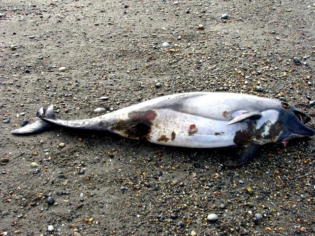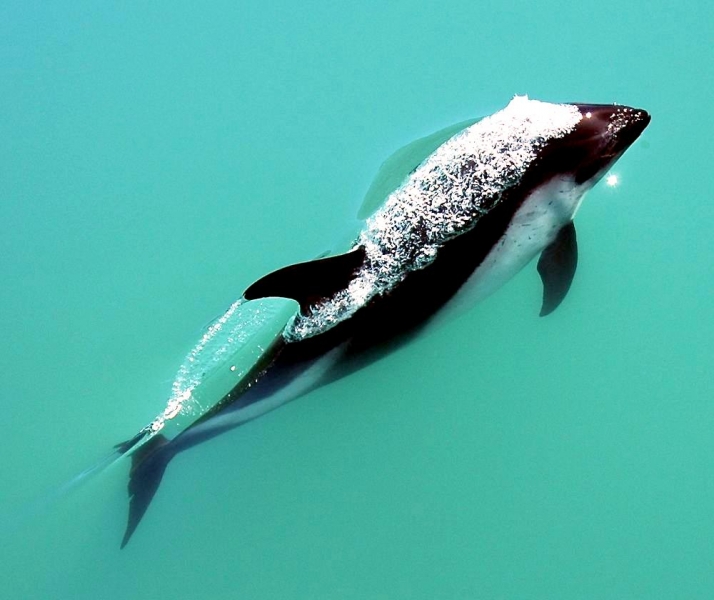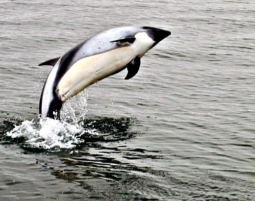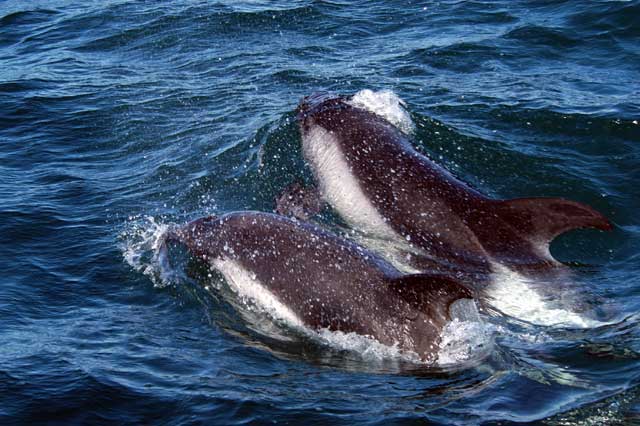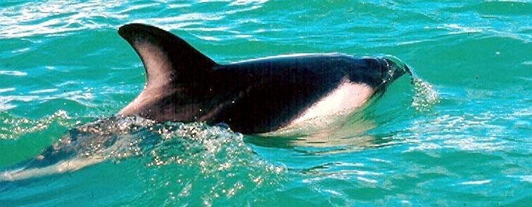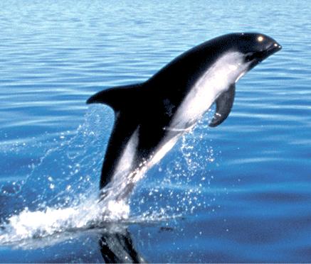 Peale’s Dolphins are small cetaceans with a stocky body and a very small beak. The dolphin’s name was taken from Captain Titian Peale of France who described the species in 1848. Males measure between 1.38-2.18 meters; females measure between 1.3-2.1 meters. The maximum recorded weight is 115 kilograms. Adult Peale’s Dolphins are dark gray to black in color with lighter shading on the flanks. A curved light gray patch angles forward from the ventral side and flank narrowing to a single line that ends near the dorsal fin. The patch extends on the posterior end of the body toward the tail stock. A larger patch is found on the throat, which is light to medium gray in color with a thin dark line underneath. Peale’s Dolphins also have a characteristic double black eye-ring that extends toward the snout. Mature dolphins have small knobs on the front edge of their flippers. Younger animals are lighter grey than adults. Peale’s Dolphins can be confused with Dusky Dolphins throughout much of their range. In the Strait of Magellan in Chile, studies of Peale’s Dolphins have shown that populations there appear to remain year round in specific areas close to shore. Other observations have shown migrations to offshore waters. Land-based surveys on the west coast of the Strait of Magellan have reported higher numbers of Peale’s Dolphins near shore in Summer than in Winter. Higher concentrations of Peale’s Dolphins have been observed during Spring in the southern part of the Strait of Magellan, which is thought to be the preferred calving area of this population. Peale’s Dolphins congregate in small groups, usually about five in number and sometimes up to 20. On rare occasions in summer and autumn, much larger groups have been recorded of over 100 individuals. A typical pattern is for the group to move in a line parallel to the shore. They usually swim slowly, but are prone to bursts of activity. Peale’s Dolphins propensity for moving over only small areas and staying close to shore, has rendered them vulnerable to interference by man. During the 1970’s and 1980’s, Chilean fisherman killed and used thousands of Peale’s Dolphins for crab bait each year. This practice has decreased, but not been made illegal. In Argentina, Peale’s Dolphins have been reported becoming trapped in gill nets, but the extent of this is not known. Little is known bout the mating system of these animals. In general, it has been noted that Peale’s Dolphins have gestation periods of ten to twelve months. Calving season for Peale’s Dolphins usually occurs between the southern spring and autumn but a calf can be born as early as October. Females tend to have only one calf per birth maybe two and they also move more inshore to do this.