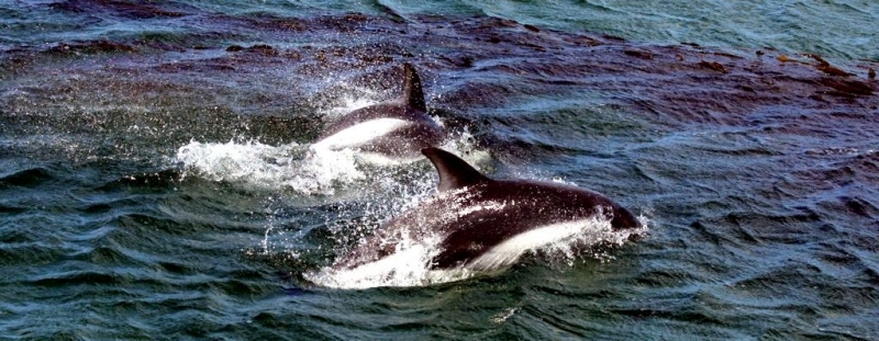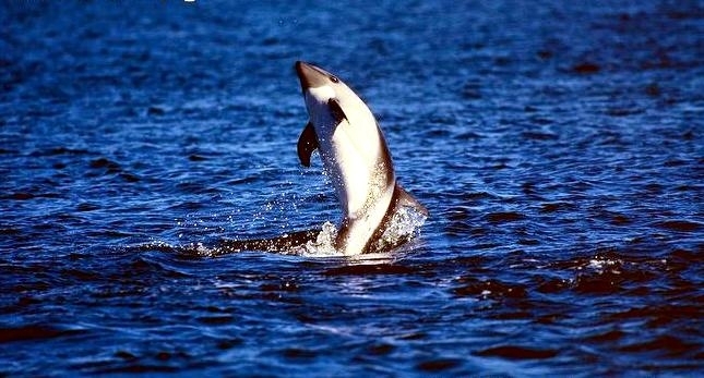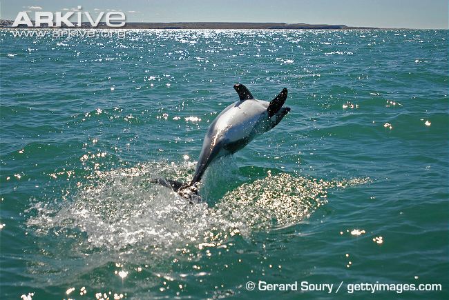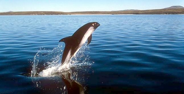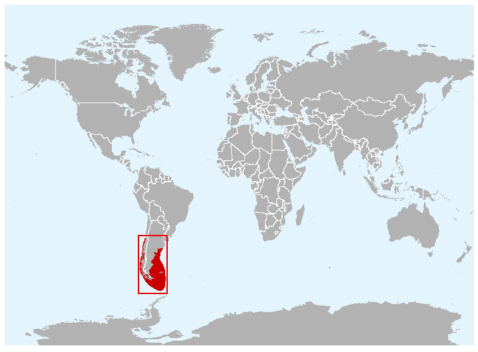 Some records show that when 2 of these Peale’s Dolphins were spotted together in the past, they were only considered a mother and calf if the smaller of the 2 animals was one third or less the size of the adult accompanying it. On visual sightings alone, this is probably still the most common way to tell a calf from an adult. Peale’s Dolphins are known to ride the bow waves of large vessels and may swim alongside smaller ones. Although this species is known to swim slowly on occasion, Peale’s Dolphins are agile and acrobatic swimmers and have been observed in small pods of 2-30 animals cavorting with Risso’s Dolphins and Commerson’s Dolphins. In the Strait of Magellan in Chile, studies of Peale’s Dolphins have shown that populations there appear to remain year round in specific areas close to shore. Other observations have shown migrations to offshore waters. Land-based surveys on the west coast of the Strait of Magellan, have reported higher numbers of Peale’s Dolphins near shore in summer than in winter. Higher concentrations of Peale’s Dolphins have been observed during spring in the southern part of the Strait of Magellan, which is thought to be the preferred calving area of this population. The Peale’s Dolphin is found in the shallow coastal waters of southern South America from Valdivia, Chile (38°S) and Golfo San José, Argentina (44°S), south to Beagle Canal and the Falkland Islands/Islas Malvinas. Population data are unavailable for Peale’s Dolphins, however it is known that this dolphin is abundant in the Straits of Magellan around the coasts of the Falkland Islands and Chile. They are most commonly found south of Puerto Montt, Chile, the Falkland Islands and Tierra del Fuego. They have been reported as far north as Buenos Aires, Argentina and Concón, Chile. Peale’s Dolphins inhabit cool coastal waters and are often seen from shore. They prefer open coastline in the north and deeper bay sand channels in the southern part of their range where they are known to frequent rocky coasts and riptides at the entrance to fjords. Peale’s Dolphins are often found in kelp beds where they swim and feed. Peale’s Dolphins feed on a variety of mollusks, crustaceans, cephalopods and fish. They give birth from October to April. Little data exist on the reproductive habits of this species.