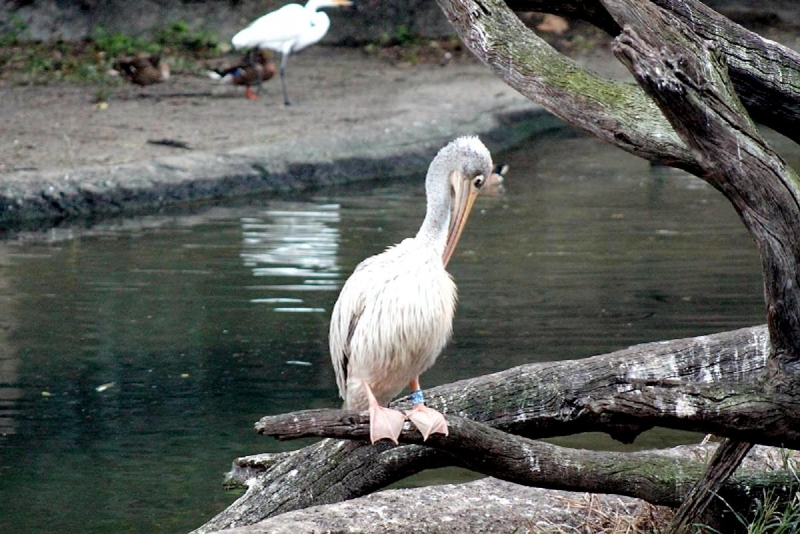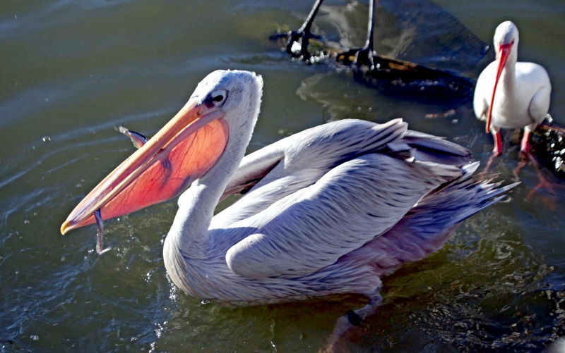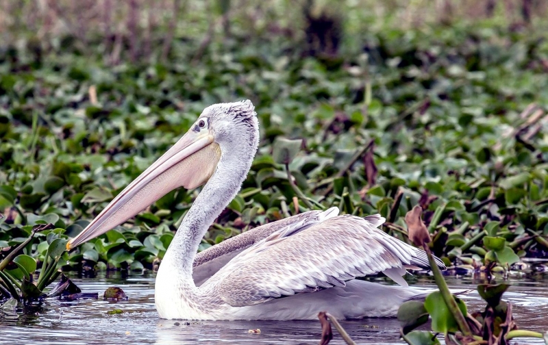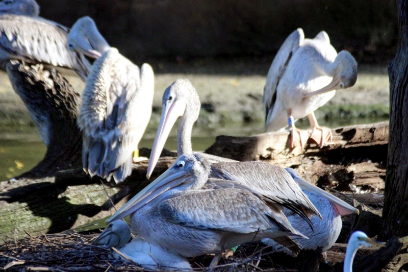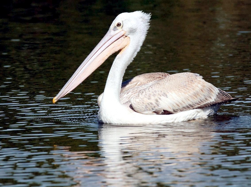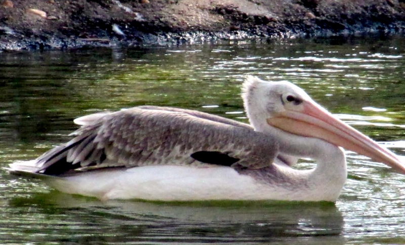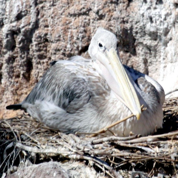 As their name suggests, the Pink-backed Pelican have a pink back. Most of their feathers are gray-white, though their breast & abdomen is also pink in color. Young birds are brown, with a slight pinkish tinge. These pelicans feed mostly in the morning & evening. The name “pelican” comes from the Ancient Greek word pelekan (πελεκάν), which is itself derived from the word pelekys (πέλεκυς) meaning “axe”. Pink-backed Pelicans live in a wide range of watery habitats but seem to prefer quiet areas with slow-moving water and will breed throughout the year. They build nests of sticks in the trees, which are often so close together that the nests touch. Such tree colonies can contain 20 to 500 pairs. The females lay 1 to 3 eggs, but chick mortality is often high due to sibling aggression. They fledge after 84 days, but will continue to be fed by their parents for some time after this. Pairs will reuse nests from the previous year if they are in a good state of repair. The nest is a large heap of sticks, into which 2-3 large white eggs are laid. The chicks feed by plunging their heads deep into the adult’s pouch and taking the partially digested regurgitated fish. The Pink-backed Pelican is classified as Least Concern and does not qualify for a more at risk category.