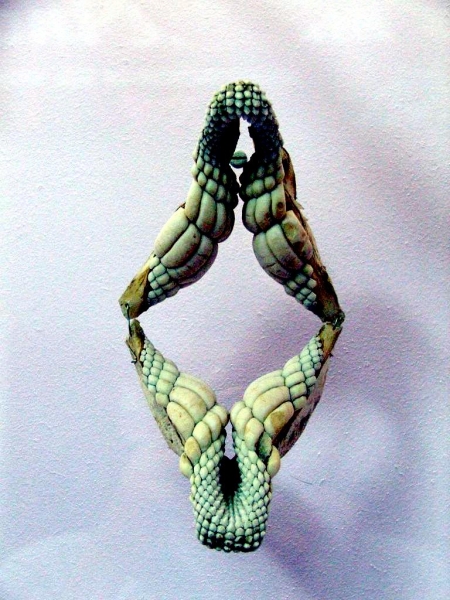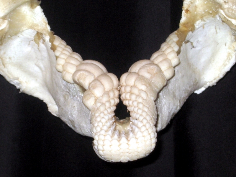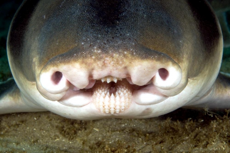 Dietary items include sea urchins, mollusks, crustaceans and fishes. Black Sea Urchins are often eaten. Port Jackson Sharks forage for food at night when their prey are most active. They often use caves and rocky outcrops as protection during the day. When most people think of shark teeth, they think of large, sharp teeth like those in the film ‘Jaws’. Not all sharks have teeth like these. The teeth of the Port Jackson Shark are very different. They are not serrated and the front teeth have a very different shape to those found at the back of the jaws, hence the genus name Heterodontus (from the Greek heteros meaning ‘different’ and don’t ‘meaning’ tooth). The anterior teeth are small and pointed whereas the posterior teeth are broad and flat. The teeth function to hold and break, then crush and grind the shells of mollusks. Juvenile Port Jackson Sharks have more pointed teeth and feed on a higher proportion of soft-bodied prey than adults. They can feed by sucking in water and sand from the bottom, blowing the sand out of the gill slits, and retaining the food which is swallowed. They have the ability to eat and breathe at the same time. This ability is unusual for sharks, many of which need to swim with the mouth open to force water over the gills. The Port Jackson Shark can pump water into the first enlarged gill slit and out through the other four gill slits. By pumping water across the gills, the shark does not need to move to ‘breathe’. It can lie on the bottom for long periods of time, a behavior that is observed at breeding time.