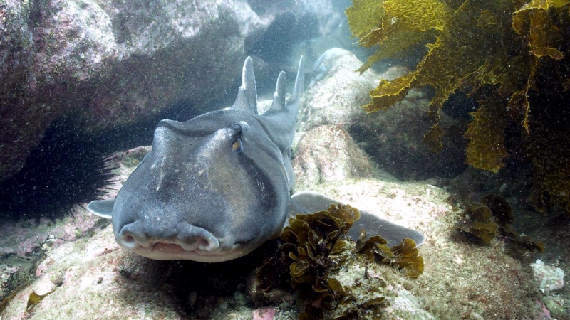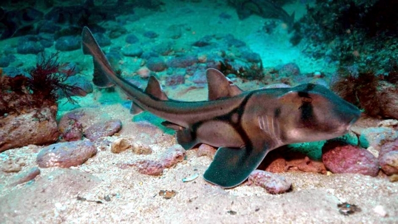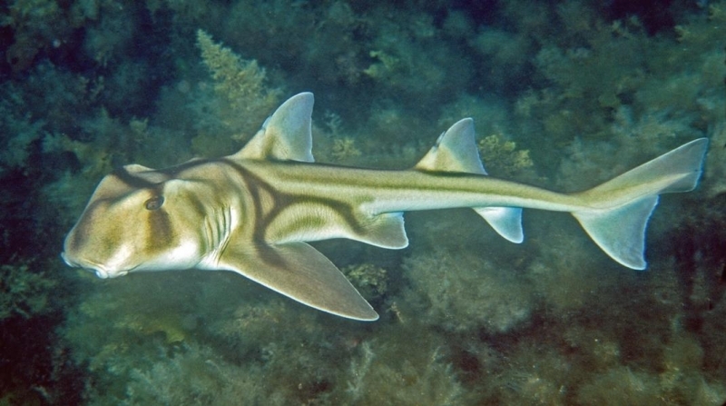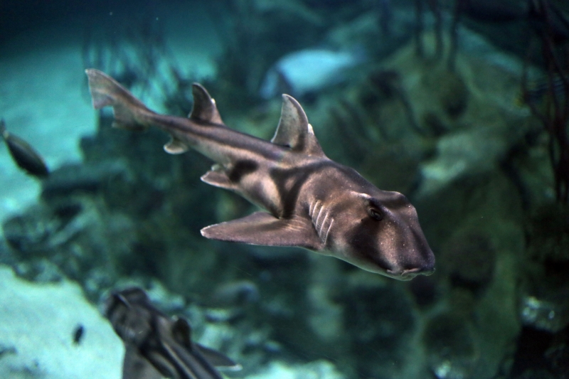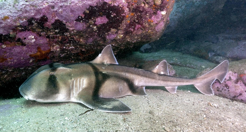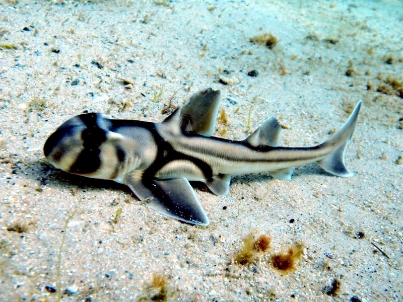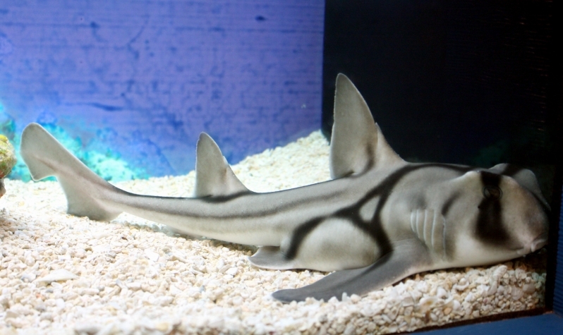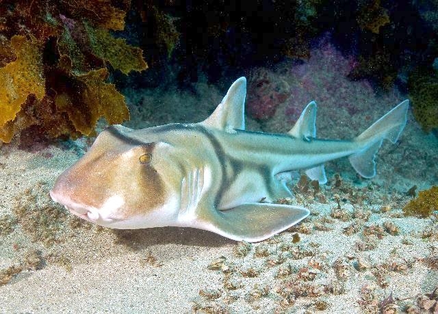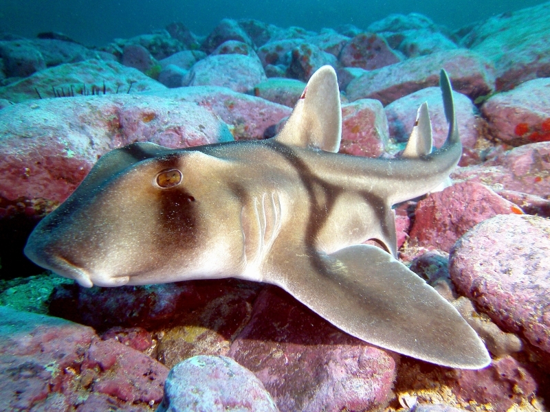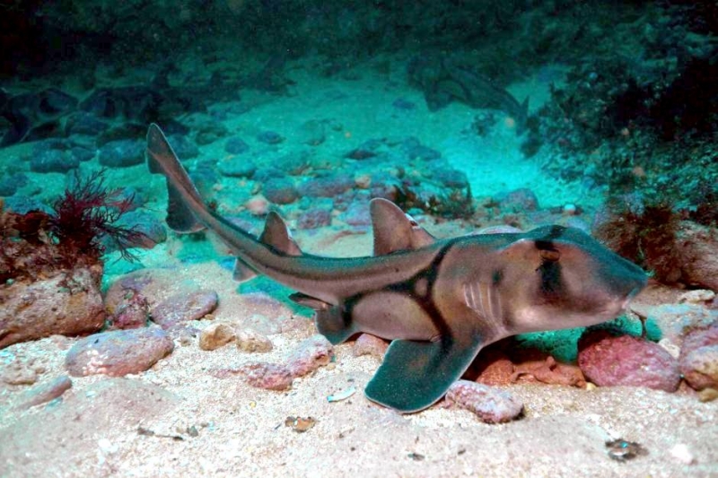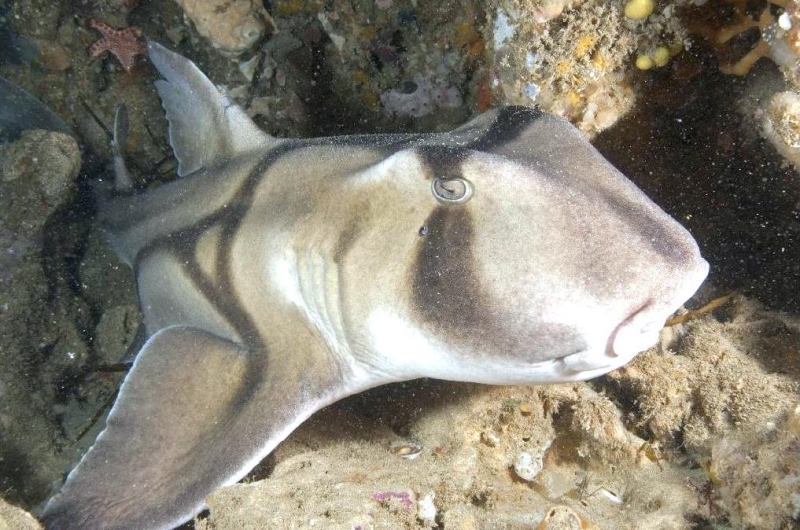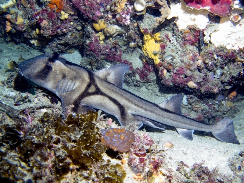 The Port Jackson Shark has a blunt head and harness-like markings which cross the eyes, run along the back to the first dorsal fin, then cross the side of the body. This pattern makes it very easy to identify the species. They grow to 1.65 meters in length. More commonly, males grow to 75 centimeters and females between 80 to 95 centimeters. The Port Jackson Shark received its name after Port Jackson, Australia where it is commonly seen. The Port Jackson Shark occurs in southern Australian waters from southern Queensland south to Tasmania and west to the central coast of Western Australia. There are some questionable records of Port Jackson Sharks being caught as far north as York Sound in Western Australia. The species have been recorded only once from New Zealand. Studies of Port Jackson Shark genetics suggest there may be 2 populations in Australia, one occurring from southern Queensland to New South Wales and the second from north-eastern Victoria to Western Australia. Port Jackson Sharks usually live in rocky environments on or near the bottom. Sometimes they are found in muddy and sandy areas or where sea grass occurs.