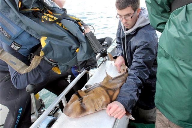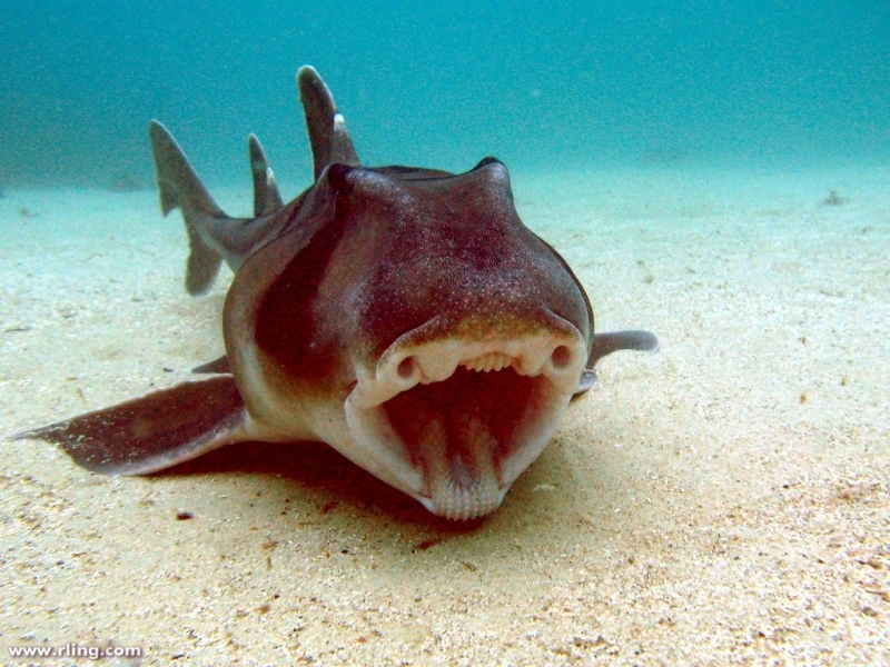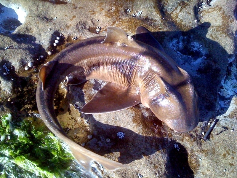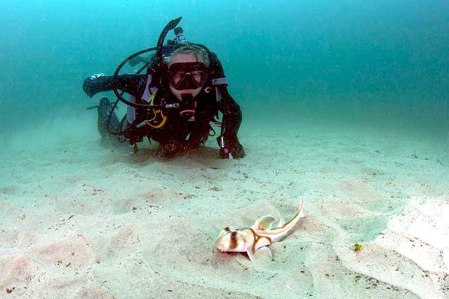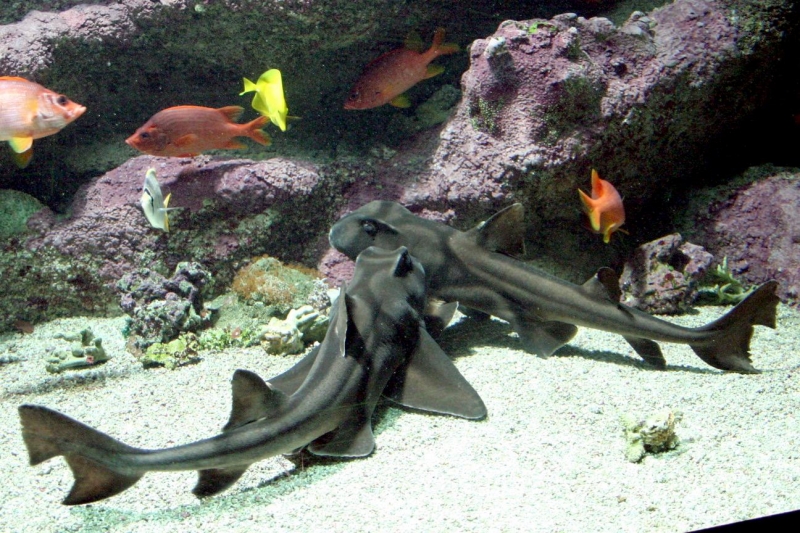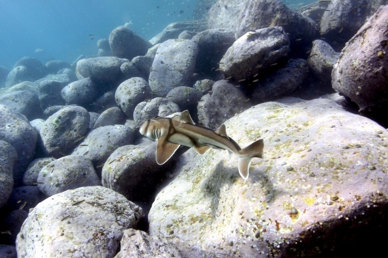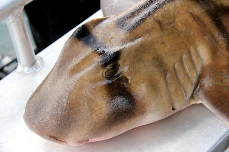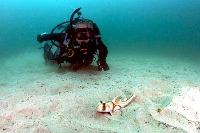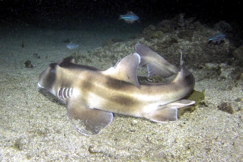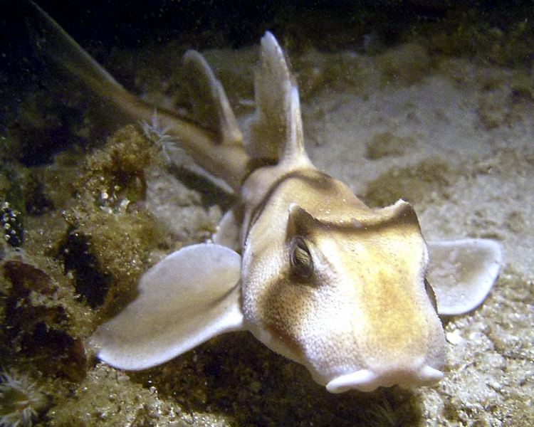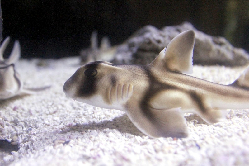 The Port Jackson Shark has a blunt head and harness-like markings which cross the eyes, run along the back to the first dorsal fin, then cross the side of the body. This pattern makes it very easy to identify the species. They grow to 1.65 meters in length. More commonly, males grow to 75 centimeters and females between 80 to 95 centimeters. The Port Jackson Shark received its name after Port Jackson, Australia where it is commonly seen. The Port Jackson Shark occurs in southern Australian waters from southern Queensland south to Tasmania and west to the central coast of Western Australia. There are some questionable records of Port Jackson Sharks being caught as far north as York Sound in Western Australia. The species have been recorded only once from New Zealand. Studies of Port Jackson Shark genetics suggest there may be 2 populations in Australia, one occurring from southern Queensland to New South Wales and the second from north-eastern Victoria to Western Australia. Port Jackson Sharks usually live in rocky environments on or near the bottom. Sometimes they are found in muddy and sandy areas or where sea grass occurs.