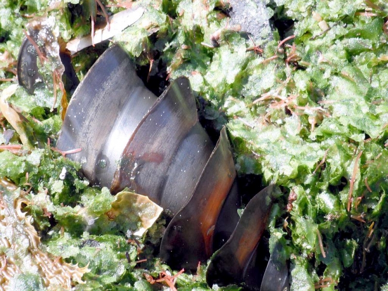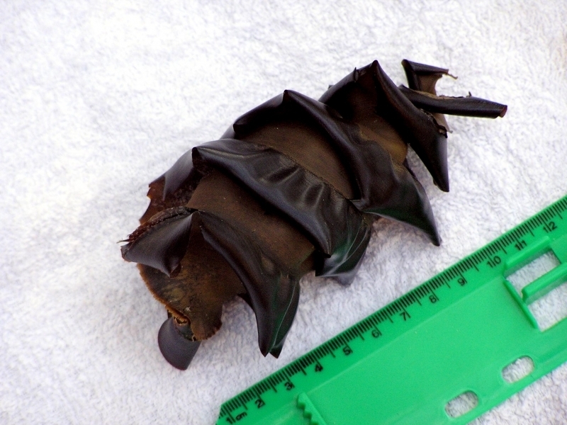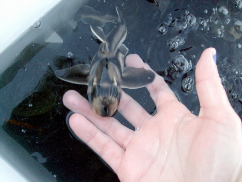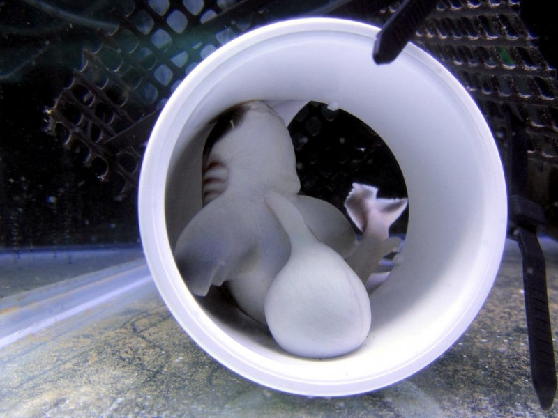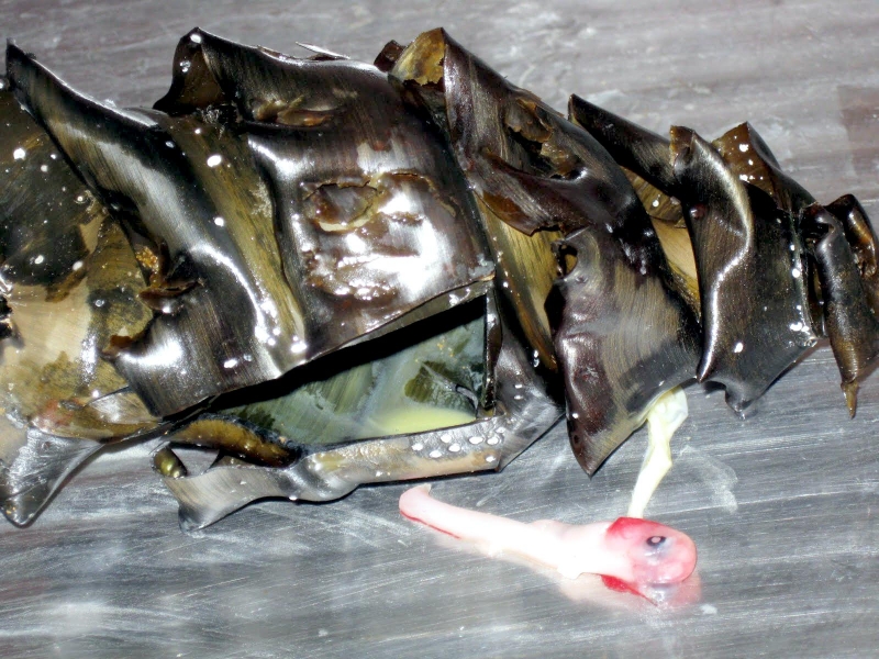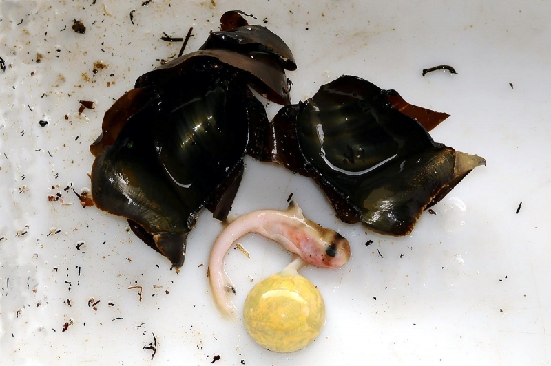 When they hatch, juvenile Port Jackson Sharks called pups are about 25 centimeters long. The breeding season is usually late winter and into spring. Divers regularly observe sharks congregating in caves, under ledges and in gutters. Port Jackson Sharks are oviparous, which means that the female lays eggs. The egg case is a tough, dark brown spiral about 7 to 8 centimeters wide and 15 centimeters long. It is common to see them washed up on beaches. The egg case is soft when laid by the female. She uses her mouth to wedge the egg case into a rock crevice where it hardens and from which one young shark emerges after 10 to 12 months. The Horn Shark has a similar-looking egg case with the addition of long twisted tendrils on the bottom end. These are often attached to seaweed. Female Port Jackson Sharks mature at 11 to 14 years of age, whereas males only take around 8 to 10 years.
