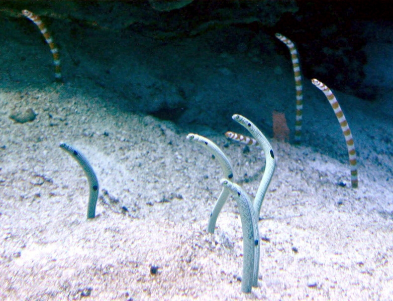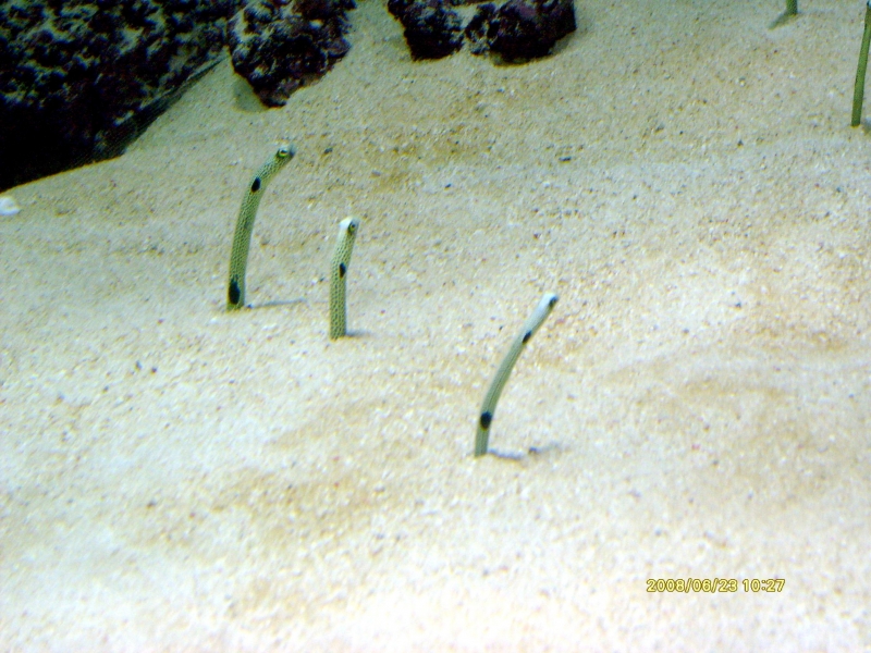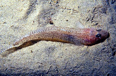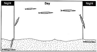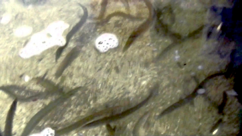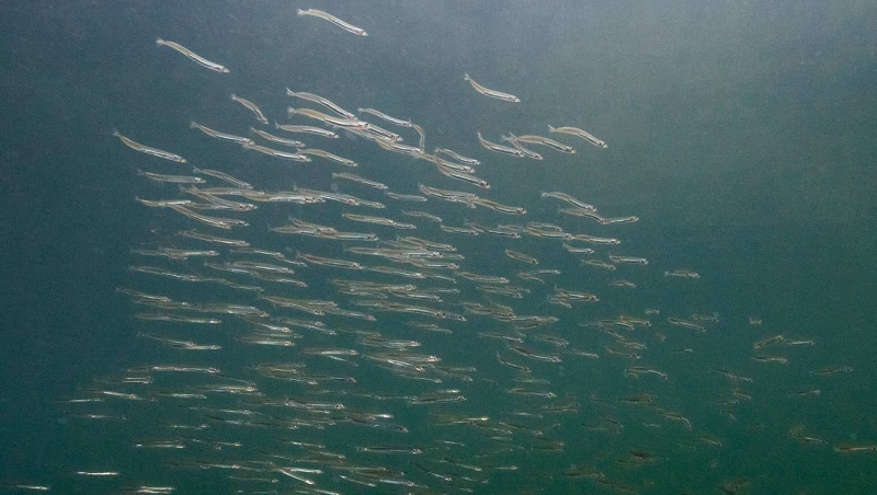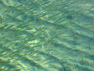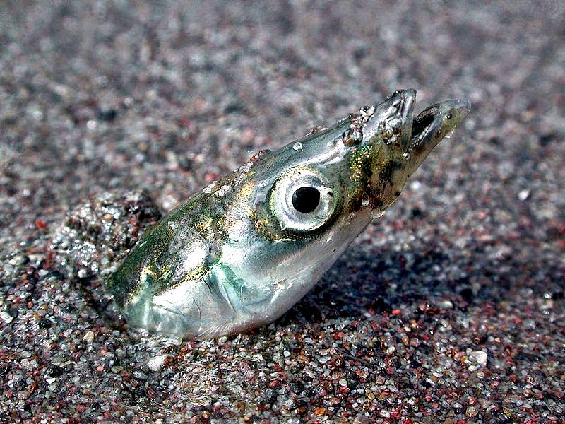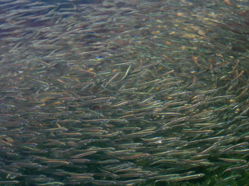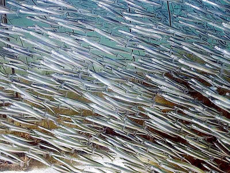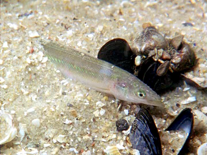 The Sand Eel is a common small eel-like fish which swim in large shoals. In April, Sand Eels swim into shallower waters. Sand Eels are an abundant & important component of food webs in the North Atlantic Ocean. They also support the largest fishery in the North Sea, with recent annual landings in the last decade of around a million tons. During the active feeding season (April-September), Sand Eels tend to emerge during daylight hours to forage close to their burrows. Their main prey is calanoid copepods, but other planktonic prey including fish larvae, are also taken. Large Sand Eels may also take benthic prey such as polychaete worms. During the summer, they live either alone or in large shoals above sandy bottoms down to 10 or 20 meters. During the night, cloudy days or in the morning, the shoals depart to shallower waters to find food among the seaweed. Sand Eels eat different types of plankton, like fish spawn & eggs and bottom living creatures like small crustaceans & polychaetes. In November, they depart to deeper waters where they spend the winter in large shoals or dug down into the bottom sediment. Most of the time, the Sand Eels are dug down into the bottom. They dive head first into the sand and disappear completely, sometimes as deep down as 50 centimeters. Sand Eels play on sand bottoms at different times depending on the specie. The eggs up to 30,000 per female, are layed in the sand where they stick to the grains of sand. Normally, the eggs hatch after a few weeks, but some eggs get covered by sand before they are fully developed. Development of these eggs stops and they lay in the sand in a sort of hibernation. Eventually the eggs whirls up again and development continues. In this way, new larvae are hatched over a period of several months. Larvae & spawn are pelagic, they live in the open water. Sand Eels become sexually mature at between 1-2 years and live for between 4-5 years. Sand Eels are an important source of food for other fish, seabirds & marine mammals. Sand Eels mature by age 3 and spawn a single batch of eggs in December-January, several months after ceasing to feed. The eggs are deposited on the seabed. The larvae hatch after several weeks, usually in February-March and drift in the currents for 1 to 3 months, after which they settle on the sandy seabed.