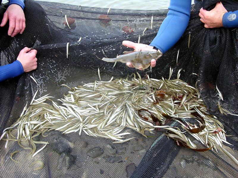 Sand Eels have even an economic value in the production of fish meal & fish oil. This type of factory fishing started during the seventies and is pursued by mainly Danish and Norwegian fleets in the North Sea using finely meshed trawls in the spring & summer. North Sea production has annually grossed between 400,000 to1,000,000 tons since mid-1970’s. Because the average weight of a Sand Eel is about 10 grams, it would entail that about 100 billion individuals are caught during a good year. Sand Eels are also used as fishing bait. Sand Eels are comparatively short-lived with a life span of less than 10 years. They settle after their planktonic phase, at around 4-5 centimeters length and may reach 5-10 centimeters length within 3 months of hatching. The magnitude of the fishery has led to concern over the potential consequences of Sand Eel harvesting on the North Sea marine ecosystem. In the North Sea, fishing mortality is lower than natural mortality. Multi-species analyses have shown that, within the scale of the North Sea region under these conditions, the predators do not suffer a lack of food. Sand Eels have a close association with sandy substrates into which they burrow. Observations on the availability of Sand Eels to fisheries and their occurrence in sediment suggests that this species rarely emerges from the seabed between September & March, except in December & January when they spawn. Research by Marine Scotland Science has shown that Sand Eels live in specific types of sand. Tagging studies have indicated that Sand Eels remain in preferred sandy areas. This dependence on sandy sediments means that the distribution of juvenile & adult Sand Eels is restricted by the patchiness of their preferred sandy habitat.