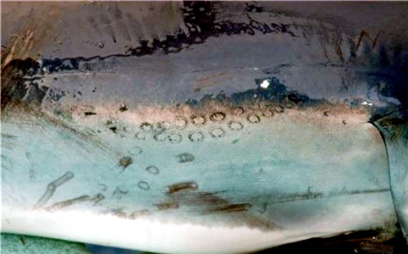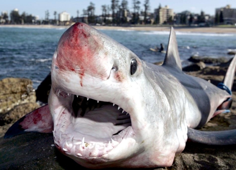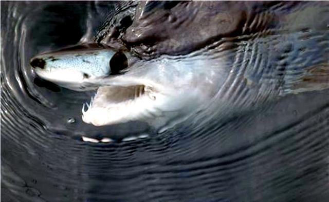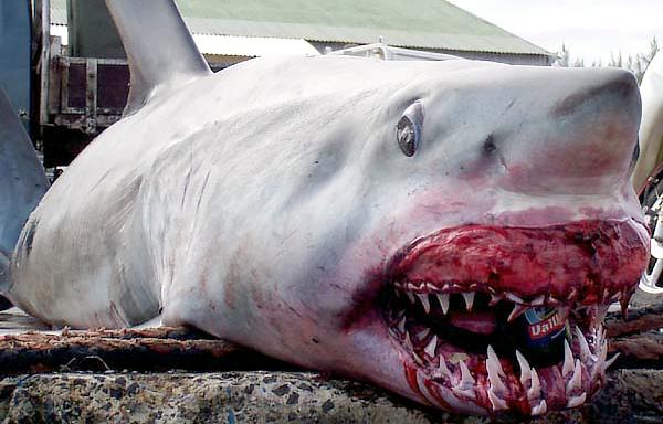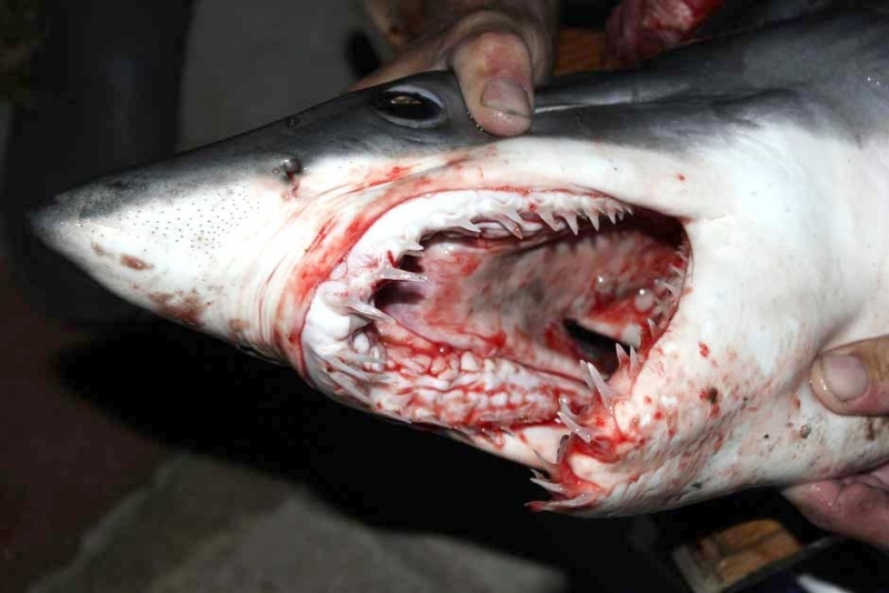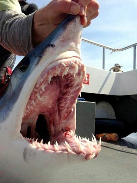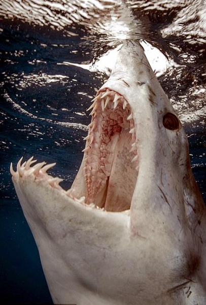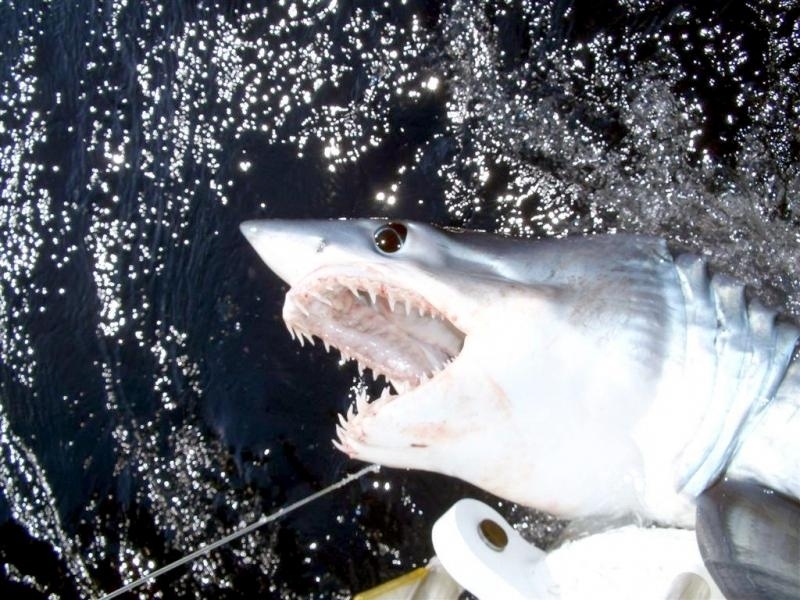 Female Shortfin Makos usually become sexually mature at a length of 3 meters. Developing embryos feed on unfertilized eggs in the uterus during the gestation period of 15-18 months. The 4-18 surviving young are born live in the late winter and early spring at a length of about 70 centimeters. It is believed that females may rest for 18 months after birth before the next batch of eggs are fertilized. The eggs are retained within the body of the female in a brood chamber where the embryo develops, receiving nourishment from a yolk sac. This is the method of reproduction for the “live-bearing” fishes where pups hatch from egg capsules inside the mother’s uterus and are born soon afterward. Short-finned Makos are prized game fish. Although an oceanic species, their power, aggressiveness, teeth and great speed, make it a danger to humans. Shortfin Mako Sharks have been blamed for a number of both nonfatal & fatal attacks on humans. Divers who have encountered Shortfin Makos, note that they swim in a figure-eight pattern and approach with mouths open prior to an attack. They frequently damage boats & injure fishermen after being hooked as most attacks occur when a Shortfin Mako Shark is either provoked or caught on the end of a fishing line.