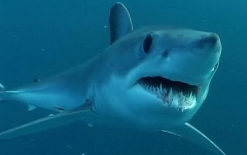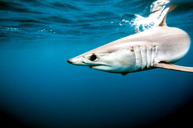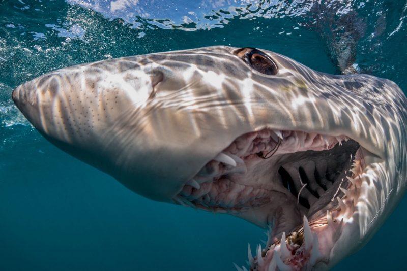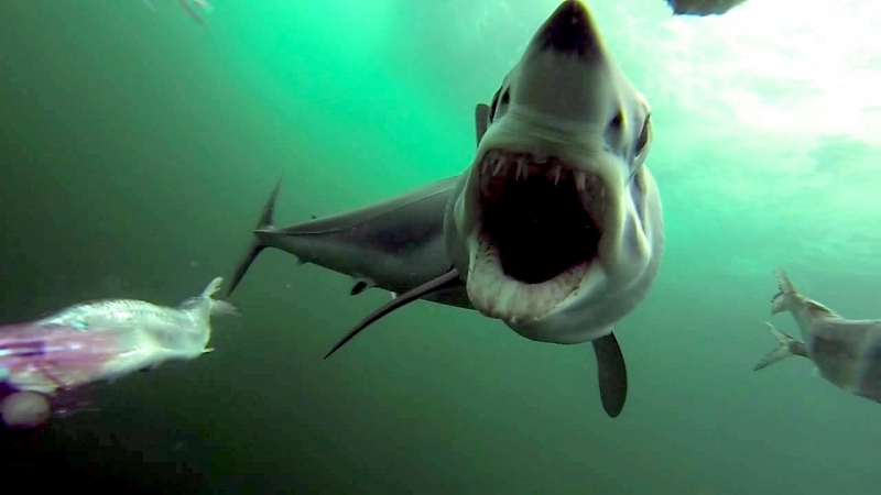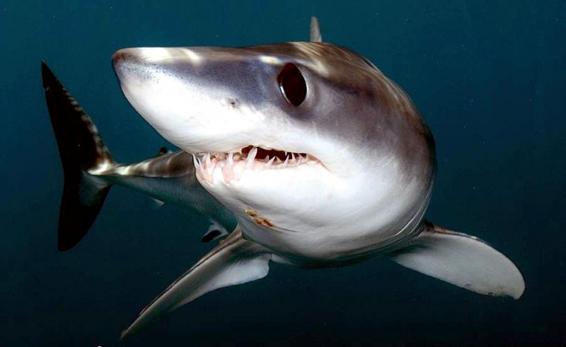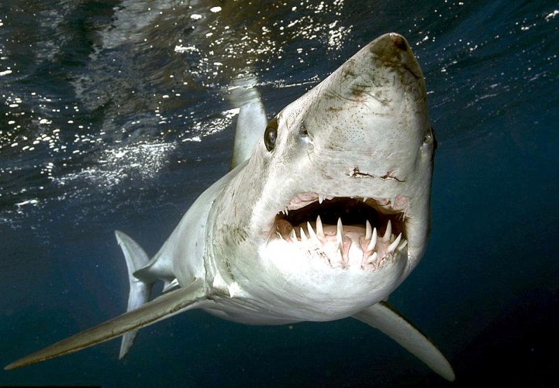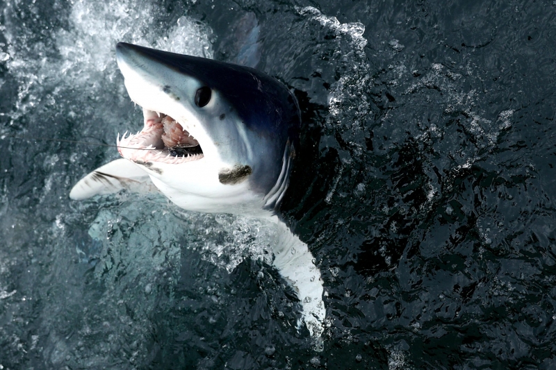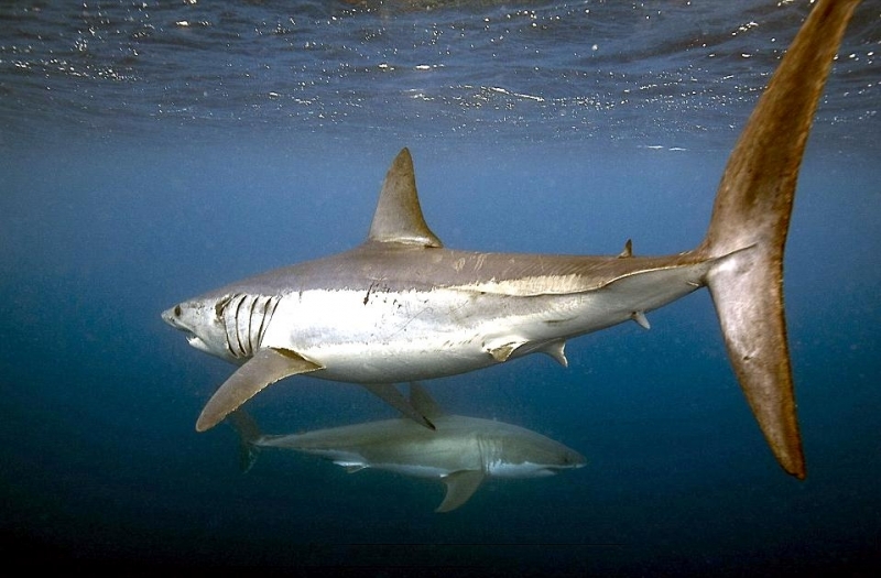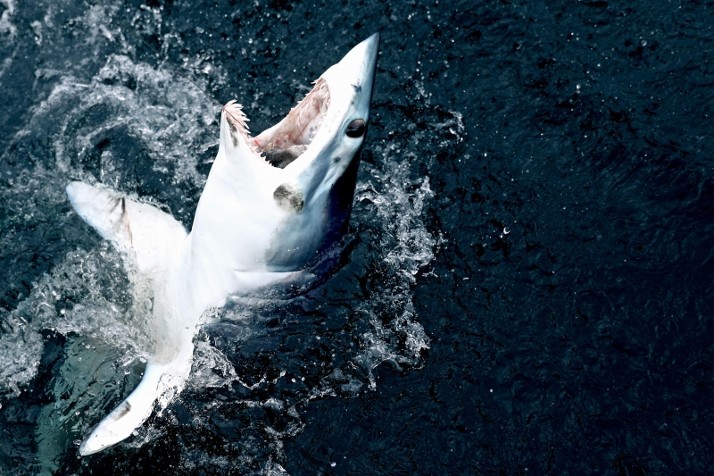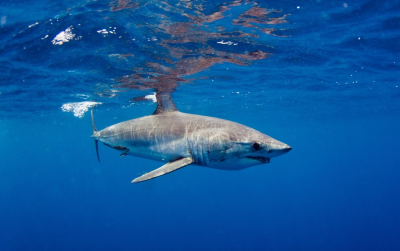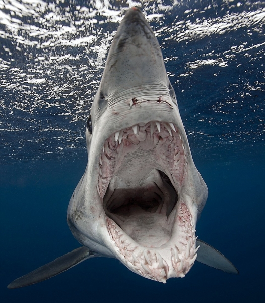 Shortfin Mako Sharks are truly beautiful animals. The word “Mako” comes from the Māori language meaning either the shark or a shark tooth. It originated in a dialectal variation as it is similar to the common words for shark in a number of Polynesian languages – “makō” in the Kāi Tahu Māori dialect, “mangō” in other Māori dialects, “mago” in Samoan, “ma’o” in Tahitian and “mano” in Hawaiian. They are well-adapted and active pelagic (open water) sharks. Like their cousin the Great White Shark, they keep their body temperature warmer than the surrounding water using a high metabolic rate and efficient heat-exchange system. As the fastest of all sharks, Shortfin Mako Sharks are also known as “Blue Pointers”. They are legendary swimmers reaching sustained speeds of 35 kph (22 mph) with bursts to over 80 kph (50 mph) and have been known to travel over 2,092 kilometers (1,300 miles) in little over a month. These sharks have rapid growth rates with males maturing at around 2 meters while the females mature at about 2.6 meters with maximum lengths of 4 meters and max weights of over 500 kilograms. Shortfin Mako Sharks and their relative the Longfin Mako Shark, represent the largest, fastest and most sophisticated species of pelagic shark on our planet. They are an easily recognizable shark exhibiting all the traits of a Lamnid, they are an extremely robust and streamlined shark with well-developed eyes and an endothermic circulatory system (warm bloodlessness) that is known to maintain elevated muscle temperatures of up to 0.6 °C above the ambient water temperature. Shortfin Makos are heavily built with the trademark strong caudal keels that are a common feature among Lamnids such as Great White, Porbeagle and Salmon Sharks.