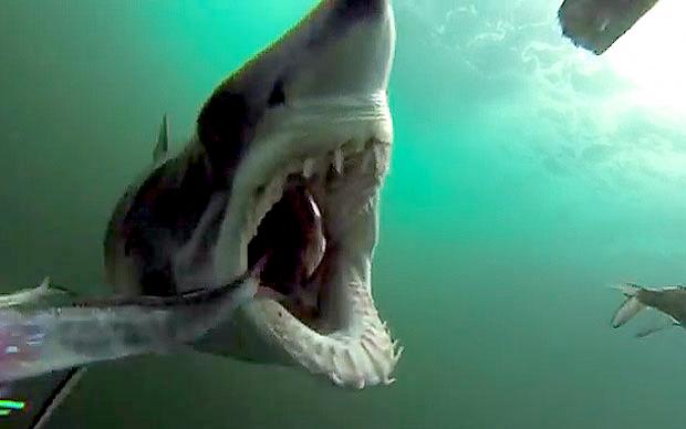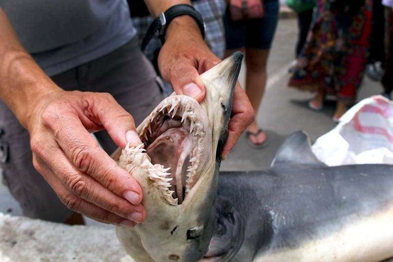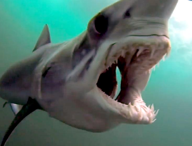 Shortfin Mako Sharks have striking coloring with deep purple to indigo dorsal (upper) surfaces, silvery sides, and white ventral (under) surfaces. Only Blue Sharks can rival the Shortfin Mako for beautiful coloration. Shortfin Makos have 5 large gill slits, well-developed eyes and pronounced knife-like, non-serrated teeth. An extremely fast and active shark, they were propelled to “big-game fishing” fame by author Zane Gray who was taken by the animals menacing appearance and volatility during the early part of this century. Author Ernest Hemingway was also impressed by the Shortfin Mako and depicted them as the marlin-marauding monster in his classic novel the “Old Man and the Sea”. Author Richard Ellis also wrote an excellent short story about a deep sea contest between a Shortfin Mako Shark and a Swordfish in his popular work “The Book of Sharks”. Shortfin Makos are found around the world in warm and temperate seas, in the Pacific from Oregon to Chile and juveniles are common in southern California during the summer months. Some scientists believe that females migrate into San Diego’s waters to have their pups. From spring to autumn, pups and 1-2 year-old sharks can be found off San Diego several miles out at sea. Shortfin Mako Shark development is ovoviviparous. Developing young are intra-uteral (within the uterus) cannibals that consume lesser developed siblings. Very little else is known about the reproduction of Shortfin Makos because females abort embryos during capture. Litters of over 8-10 pups are uncommon.