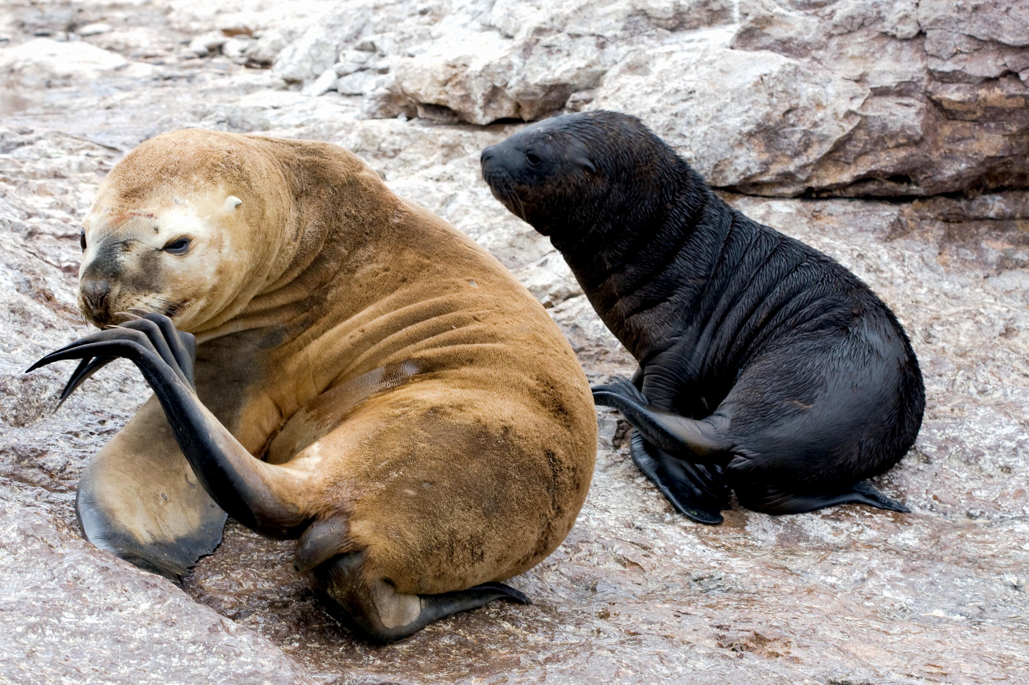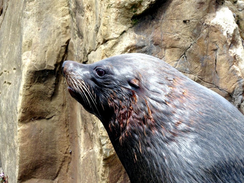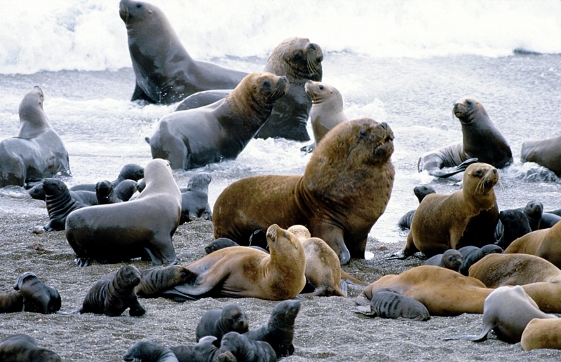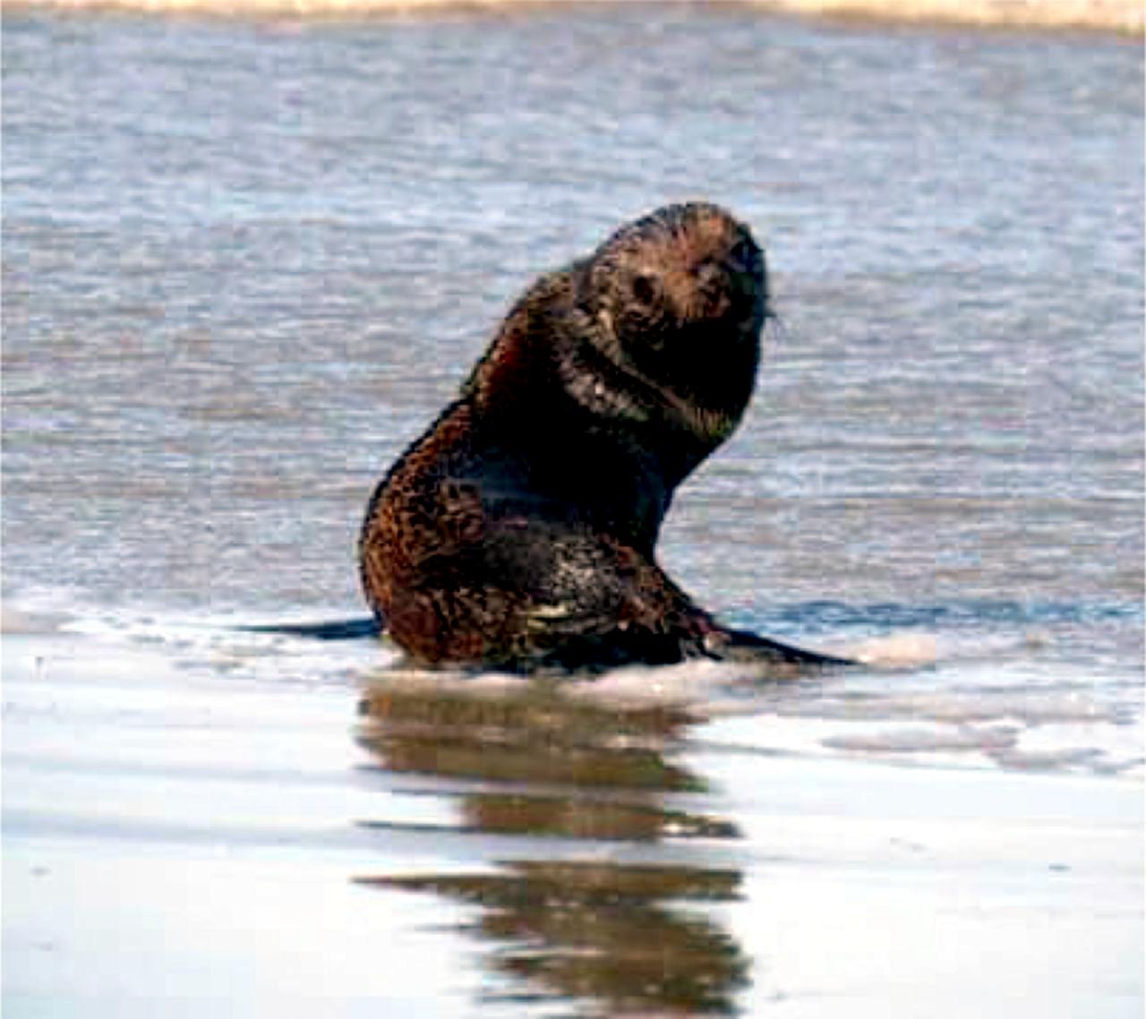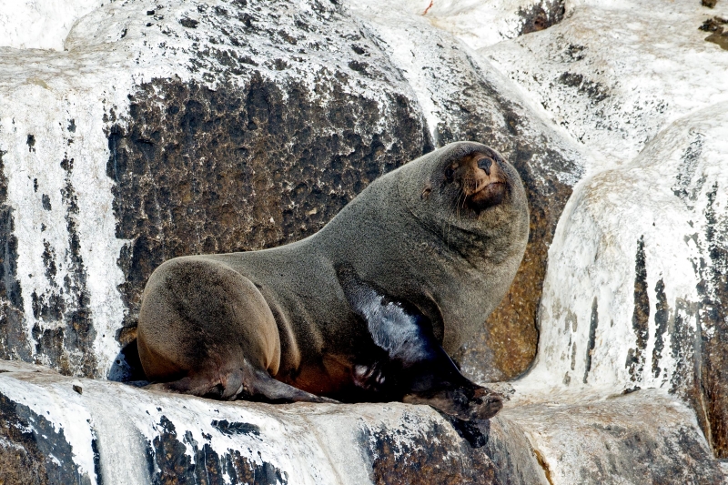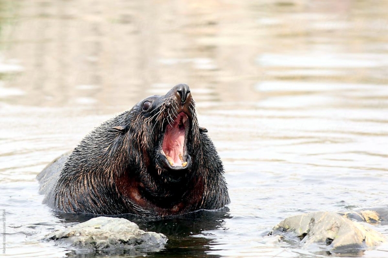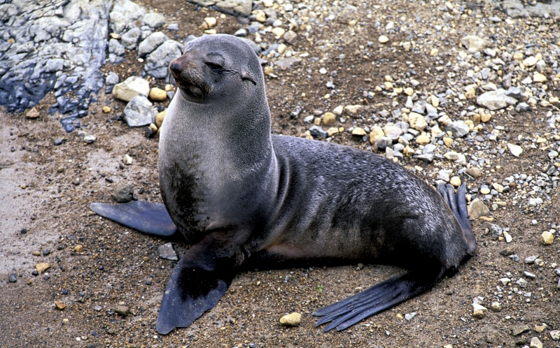 South American Fur Seals are members of the family that sea lions belong to Otariidae, meaning eared seals. On land they are more agile than the ‘earless’ seals, due to being able to move their back limbs forward under, their body raising it as they move. Males & females differ in appearance, as the male is much larger and heavier, having a mane of long hair over its thick neck & shoulders. Adults are blackish-gray and sometimes have a slightly grizzled appearance. Females and sub-adult males are dark brown to grayish-black and have paler underparts. The South American Fur Seal as its common name suggests, occurs along both the Pacific & Atlantic coasts of South America and has a discontinuous distribution that runs from Peru to Chile, as well as from southern Brazil to Tierra del Fuego and then around the Falkland Islands. Most are concentrated on Uruguay’s coast and they are also sometimes reported outside of their normal range, off the coast of Chile in the Juan Fernández Islands and in Colombia. These animals breed on land and colonies are generally found in caves, on rocky coasts, on ledges above the shorelines or in areas that are strewn with boulders. This species’ distribution at sea is little known, but they are thought to primarily occur in seas around the coast and above the continental shelf and slope, though they sometimes travel to over 600 km offshore. South American fur seals are social animals and live alongside each other in rookeries that are along the shore. These seals often fish during the night in groups. Most of the time they spend in the water swimming however, they live on land during the breeding season. Although seasonal movements of males & juvenile seals are not well understood, most females stay near the breeding grounds during the year. At sea, this species is often seen resting or traveling in groups, spending a lot of time grooming when at rest at the surface.