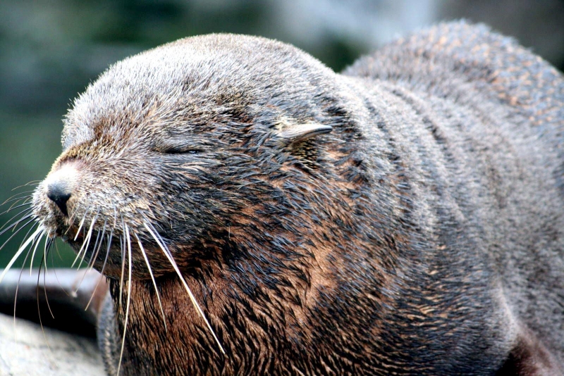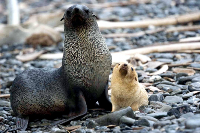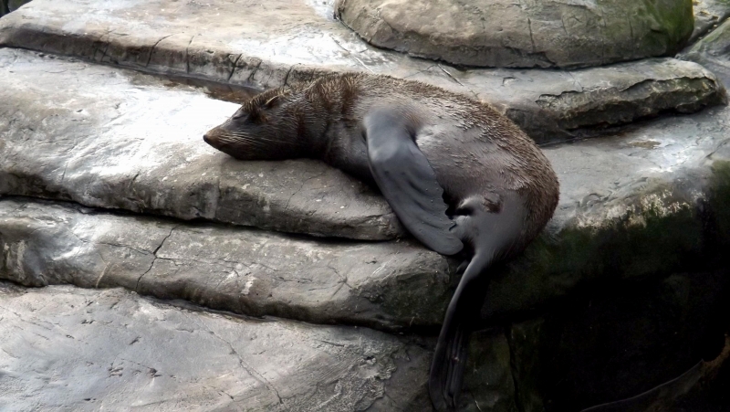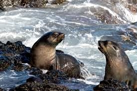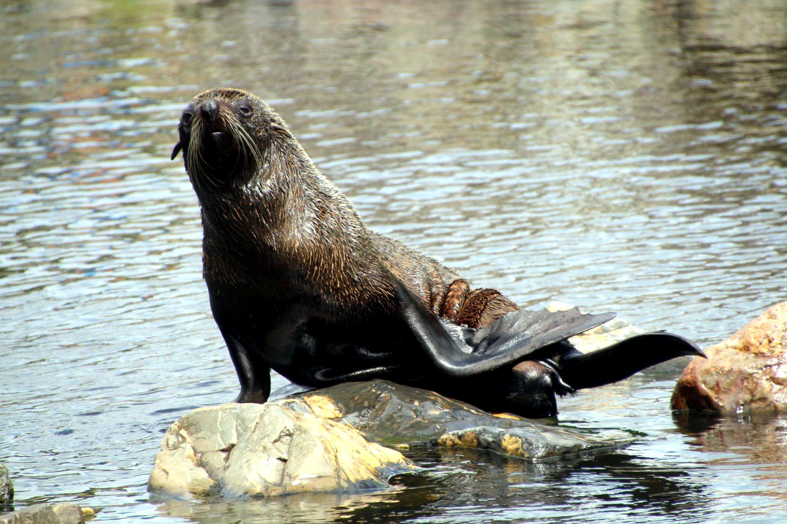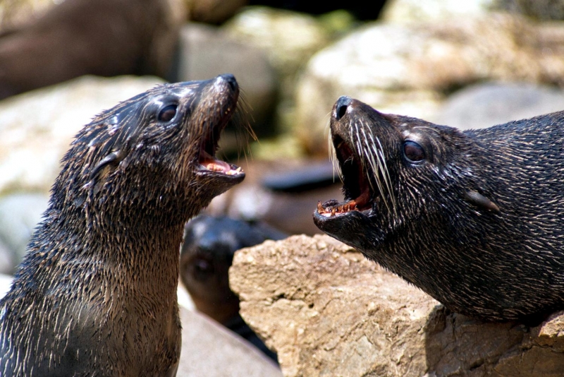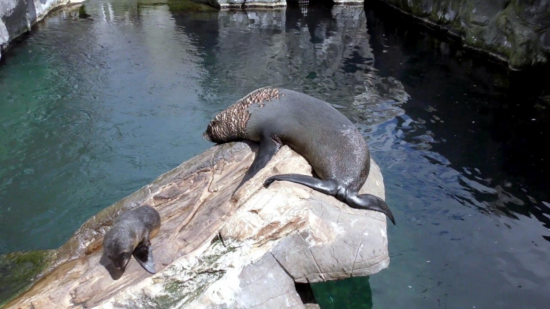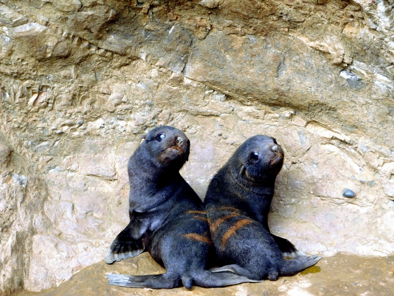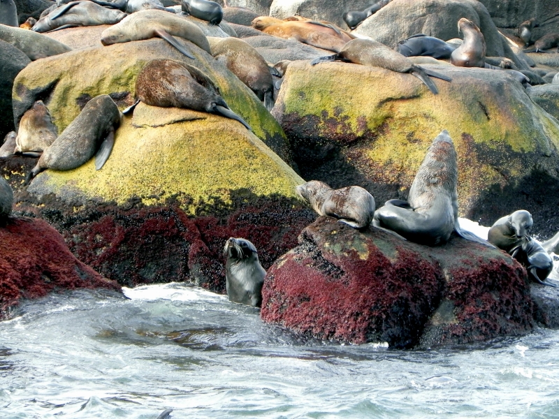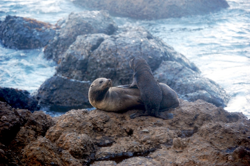 South American Fur Seals are members of the family that sea lions belong to Otariidae, meaning eared seals. On land they are more agile than the ‘earless’ seals, due to being able to move their back limbs forward under, their body raising it as they move. Males & females differ in appearance, as the male is much larger and heavier, having a mane of long hair over its thick neck & shoulders. Adults are blackish-gray and sometimes have a slightly grizzled appearance. Females and sub-adult males are dark brown to grayish-black and have paler underparts. The South American Fur Seal as its common name suggests, occurs along both the Pacific & Atlantic coasts of South America and has a discontinuous distribution that runs from Peru to Chile, as well as from southern Brazil to Tierra del Fuego and then around the Falkland Islands. Most are concentrated on Uruguay’s coast and they are also sometimes reported outside of their normal range, off the coast of Chile in the Juan Fernández Islands and in Colombia. These animals breed on land and colonies are generally found in caves, on rocky coasts, on ledges above the shorelines or in areas that are strewn with boulders. This species’ distribution at sea is little known, but they are thought to primarily occur in seas around the coast and above the continental shelf and slope, though they sometimes travel to over 600 km offshore. South American fur seals are social animals and live alongside each other in rookeries that are along the shore. These seals often fish during the night in groups. Most of the time they spend in the water swimming however, they live on land during the breeding season. Although seasonal movements of males & juvenile seals are not well understood, most females stay near the breeding grounds during the year. At sea, this species is often seen resting or traveling in groups, spending a lot of time grooming when at rest at the surface.
