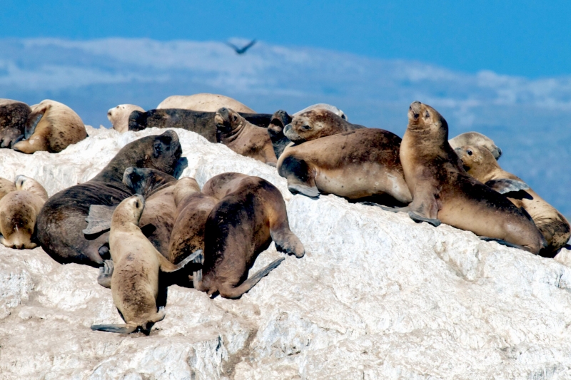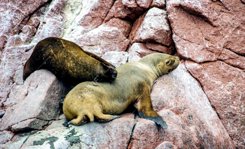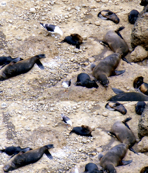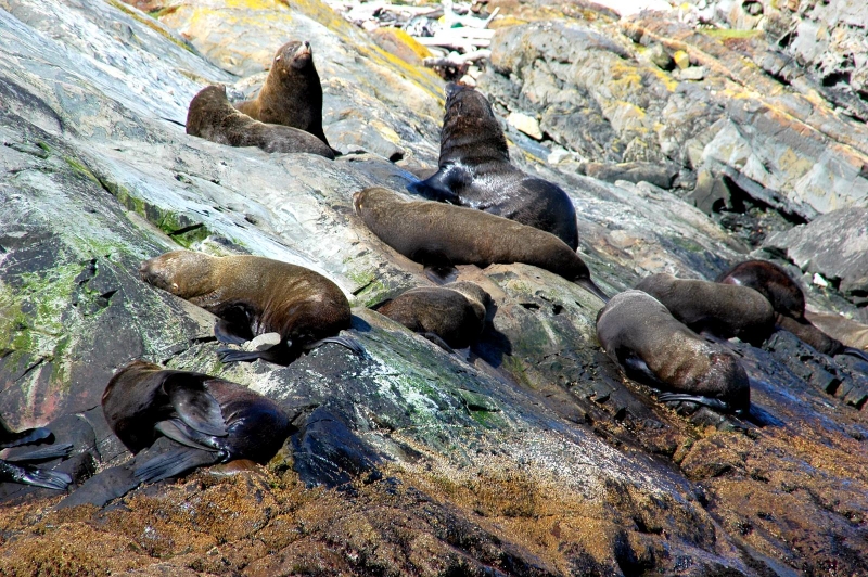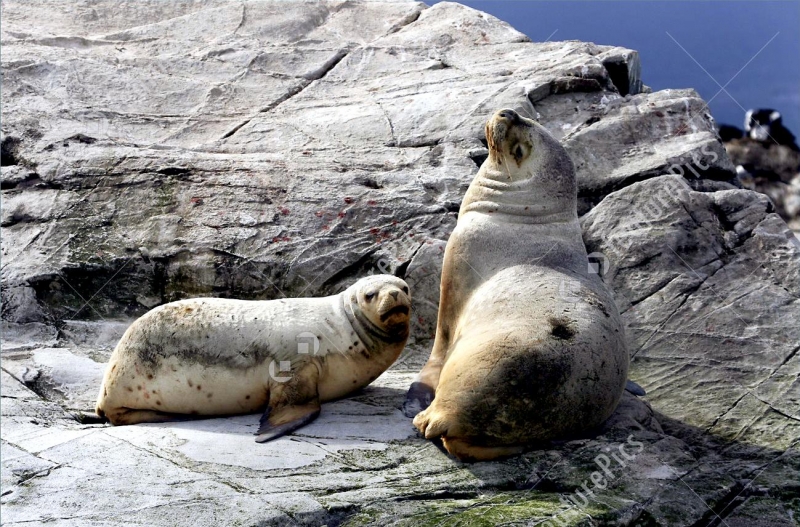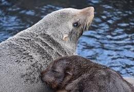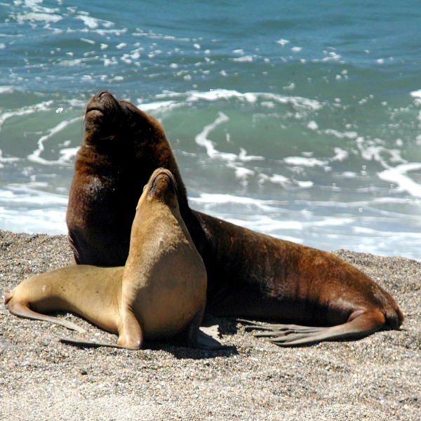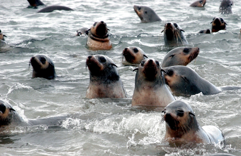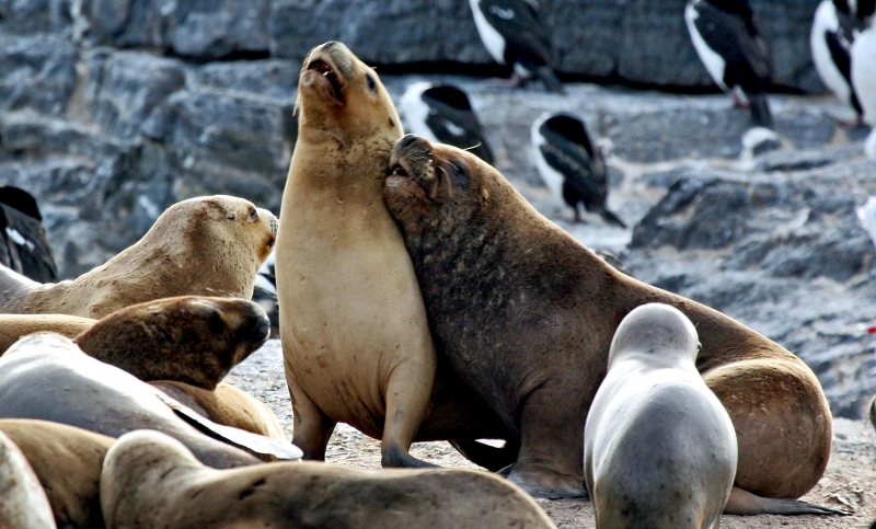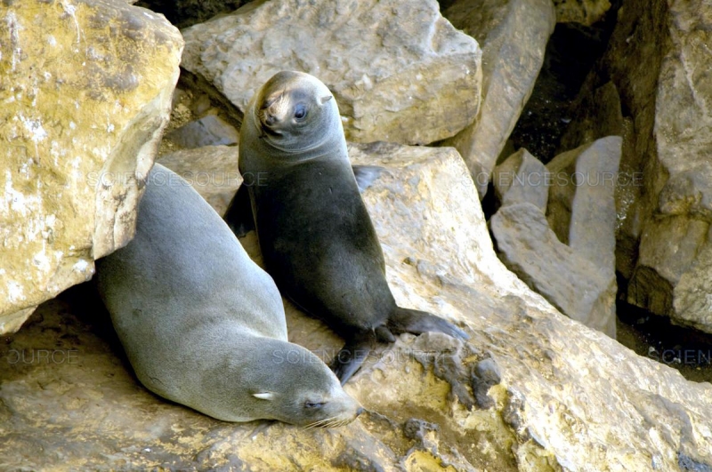 These seals communicate vocally and through touch. When they communicate with each other over long distances, they use vocalizations. South American Fur Seals are carnivores. They eat anchovies, shrimp, lobster, krill and squid, location having a role in the main dietary content. In Peru & Uruguay, they eat anchovies. The ones closer to Brazil eat shrimp. In Chile they tend to eat krill. This species is polygamous, males mating during each breeding period with more than one female. Males compete for particular areas along the shoreline between October and December for the purpose of establishing a territory for them and the females they are mating with. The dominant males gain the largest territory and the most females. One pup is born per breeding season after a gestation of 8 to 12 months. Mothers usually wean their pups after 6 to 12 months, but sometimes not until 3 years, when the mother may be nursing 2 pups. The female mates with a male again within 7 to 10 days after the birth. Males reach maturity at about age of 7, but many do not mate until 8 years old. Females reach maturity at about the age of 3. South American Fur Seals have for a long time been hunted for their fur, skin & oil which is now outlawed. Some illegal poaching continues, particularly in Peru. Others threats include pollution, oil spills, entanglement accidentally in fishing gear, illegal hunting as bait for king crab fishing and reduction in prey due to intensive commercial fishing. This species can also be heavily impacted by El Niño events, which affect ocean currents, decreasing the supply of food and causing many deaths of seals of all ages. This natural phenomenon, which causes the ocean surface water to heat up and lasts for a number of months, has the most serious impact on the seal populations in Peru. It takes place every 4 to 12 years. The total South American Fur Seal population size is about 238,000 individuals, including approximately 109,500 mature individuals. South American Fur Seals may have influence on the fish, krill and squid population due to their diet. They are also important as prey for sharks & Killer Whales.