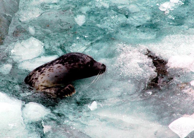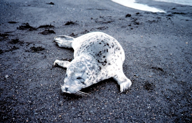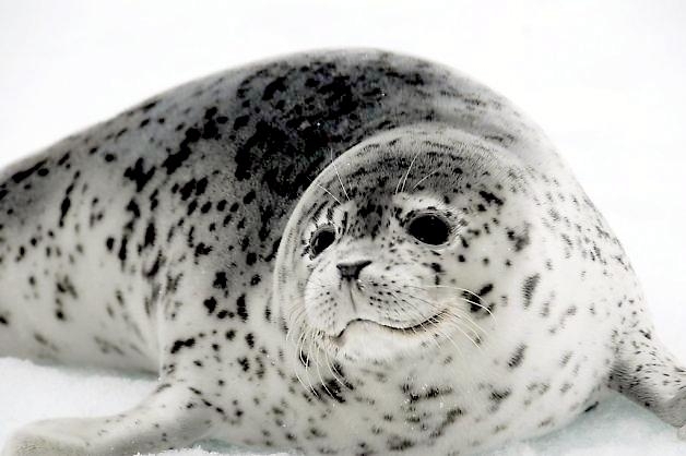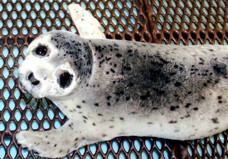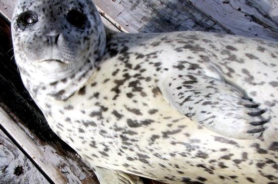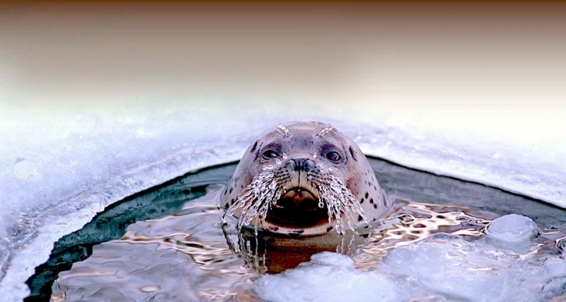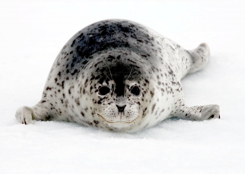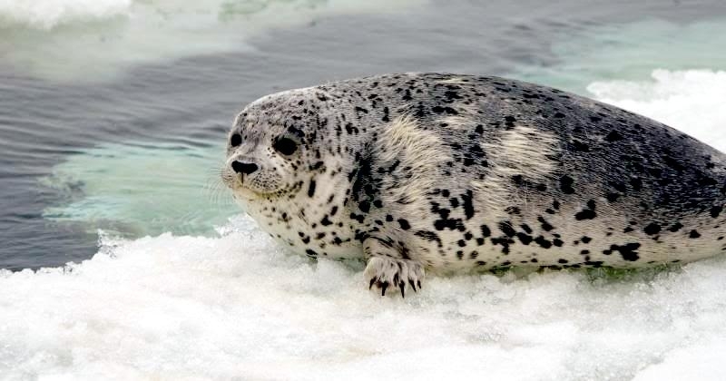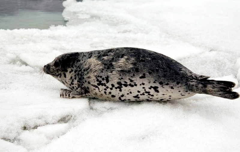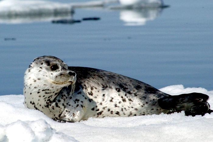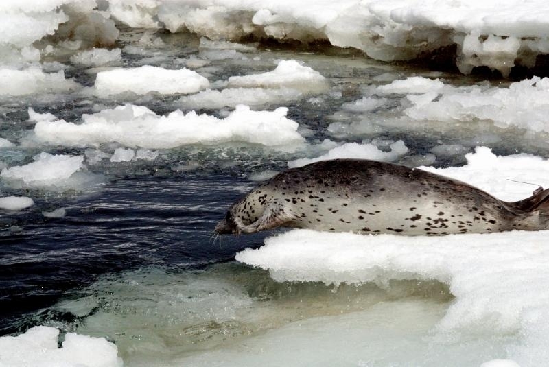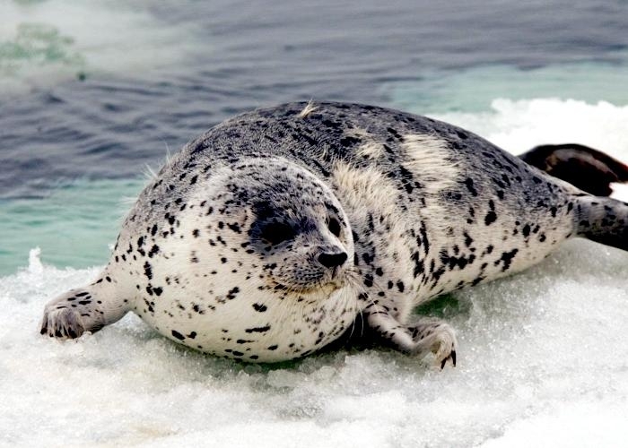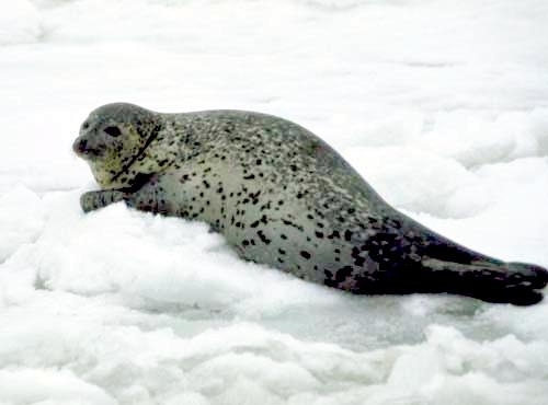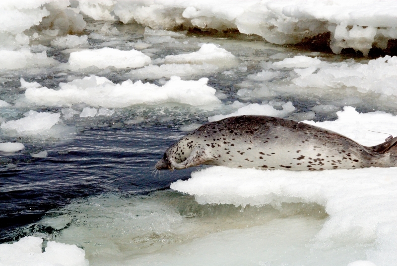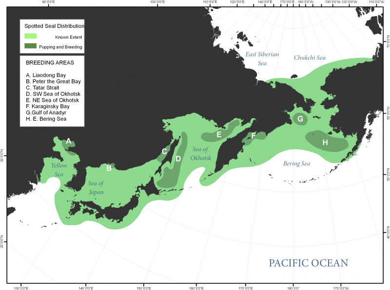 Spotted Seals vary in size among their different populations. On average, adult males measure 1.5-2.1 meters in length and weigh 85-150 kilograms and adult females measure 1.4-1.7 meters in length and weigh 65-115 kilograms. There is also variation in the coloring of adult coats, but generally Spotted Seals are silvery-gray on their ventral (under) sides and darker gray on their backs with dark spotted patterns. Spotted Seals can live to at least 35 years of age. They are closely related to Harbor Seals and often shares the same habitat. There is also some evidence of inter-breeding between these 2 species. Spotted Seals are found around the ice and waters of the north Pacific Ocean and adjacent seas including the continental shelf of the Beaufort, Chukchi, Bering and Okhotsk Seas and south to the northern Huanghai Sea and western Sea of Japan. Recent population data is unavailable and estimates from the 1970’s of 335,000-450,000 Spotted Seals are likely inflated. A more recent survey of the Okhotsk Sea in 1986 and 1987 estimated 50,000 seals. Spotted Seals gather to molt in late spring-early summer among the ice remnants or on land when as the ice retreats. Following molting, Spotted Seals in the Okhotsk Sea and Bering Sea disperse, some migrate north to the Beaufort Sea & Chukchi Sea, others to the south & east. Little data exist on the distribution & movements of Spotted Seals during the colder months although it is likely though that they remain in the water during the winter.