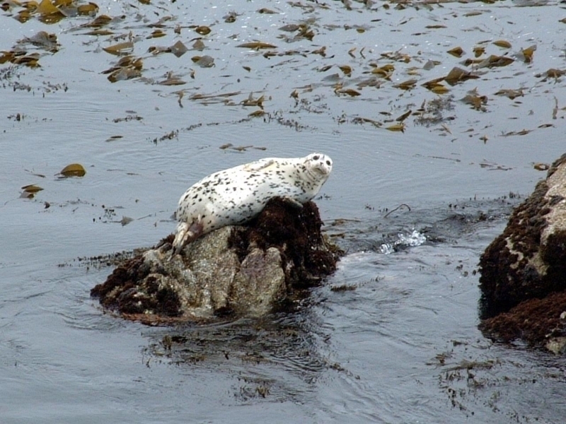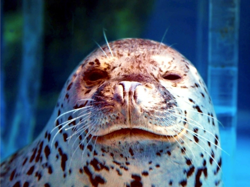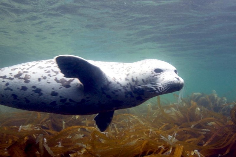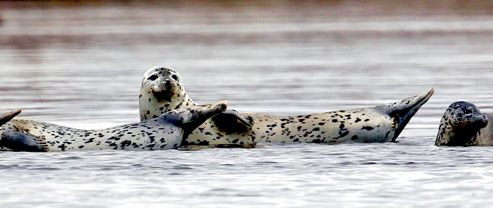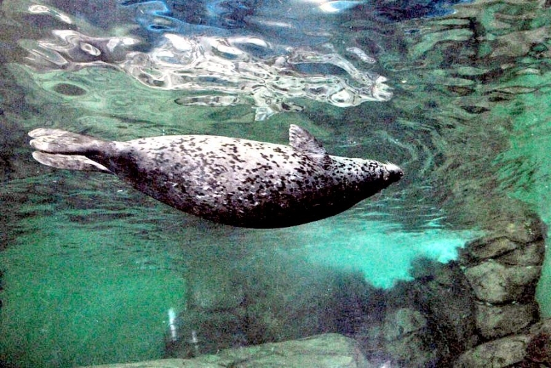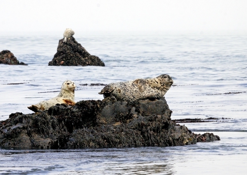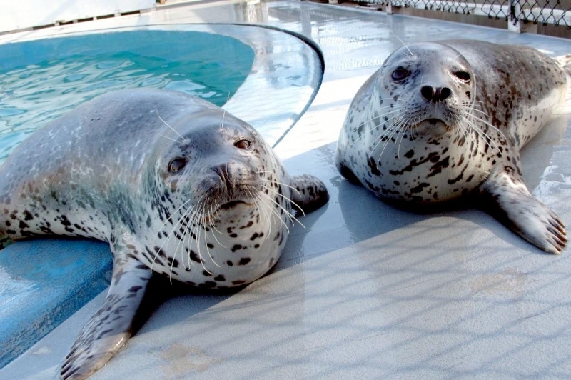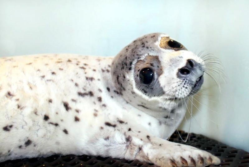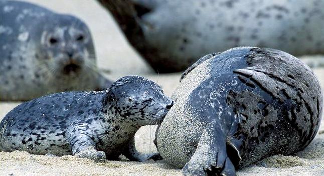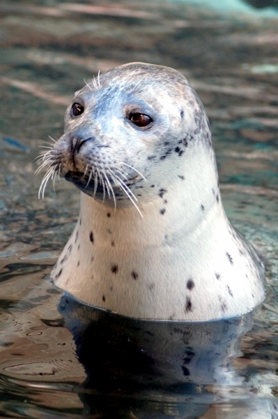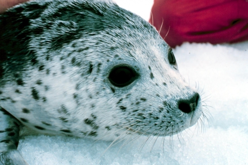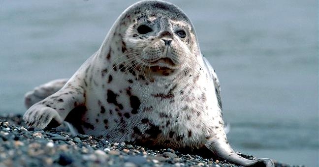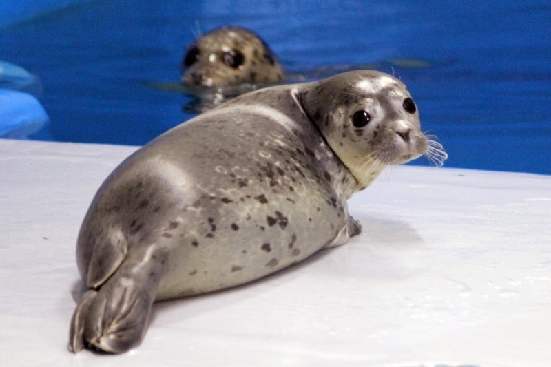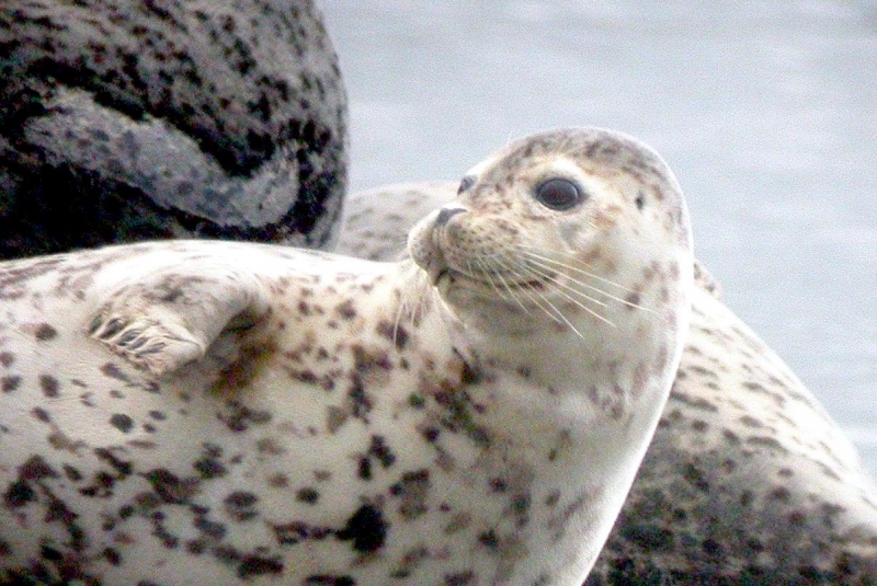 Spotted Seals vary in size among their different populations. On average, adult males measure 1.5-2.1 meters in length and weigh 85-150 kilograms and adult females measure 1.4-1.7 meters in length and weigh 65-115 kilograms. There is also variation in the coloring of adult coats, but generally Spotted Seals are silvery-gray on their ventral (under) sides and darker gray on their backs with dark spotted patterns. Spotted Seals can live to at least 35 years of age. They are closely related to Harbor Seals and often shares the same habitat. There is also some evidence of inter-breeding between these 2 species. Spotted Seals are found around the ice and waters of the north Pacific Ocean and adjacent seas including the continental shelf of the Beaufort, Chukchi, Bering and Okhotsk Seas and south to the northern Huanghai Sea and western Sea of Japan. Recent population data is unavailable and estimates from the 1970’s of 335,000-450,000 Spotted Seals are likely inflated. A more recent survey of the Okhotsk Sea in 1986 and 1987 estimated 50,000 seals. Spotted Seals gather to molt in late spring-early summer among the ice remnants or on land when as the ice retreats. Following molting, Spotted Seals in the Okhotsk Sea and Bering Sea disperse, some migrate north to the Beaufort Sea & Chukchi Sea, others to the south & east. Little data exist on the distribution & movements of Spotted Seals during the colder months although it is likely though that they remain in the water during the winter.